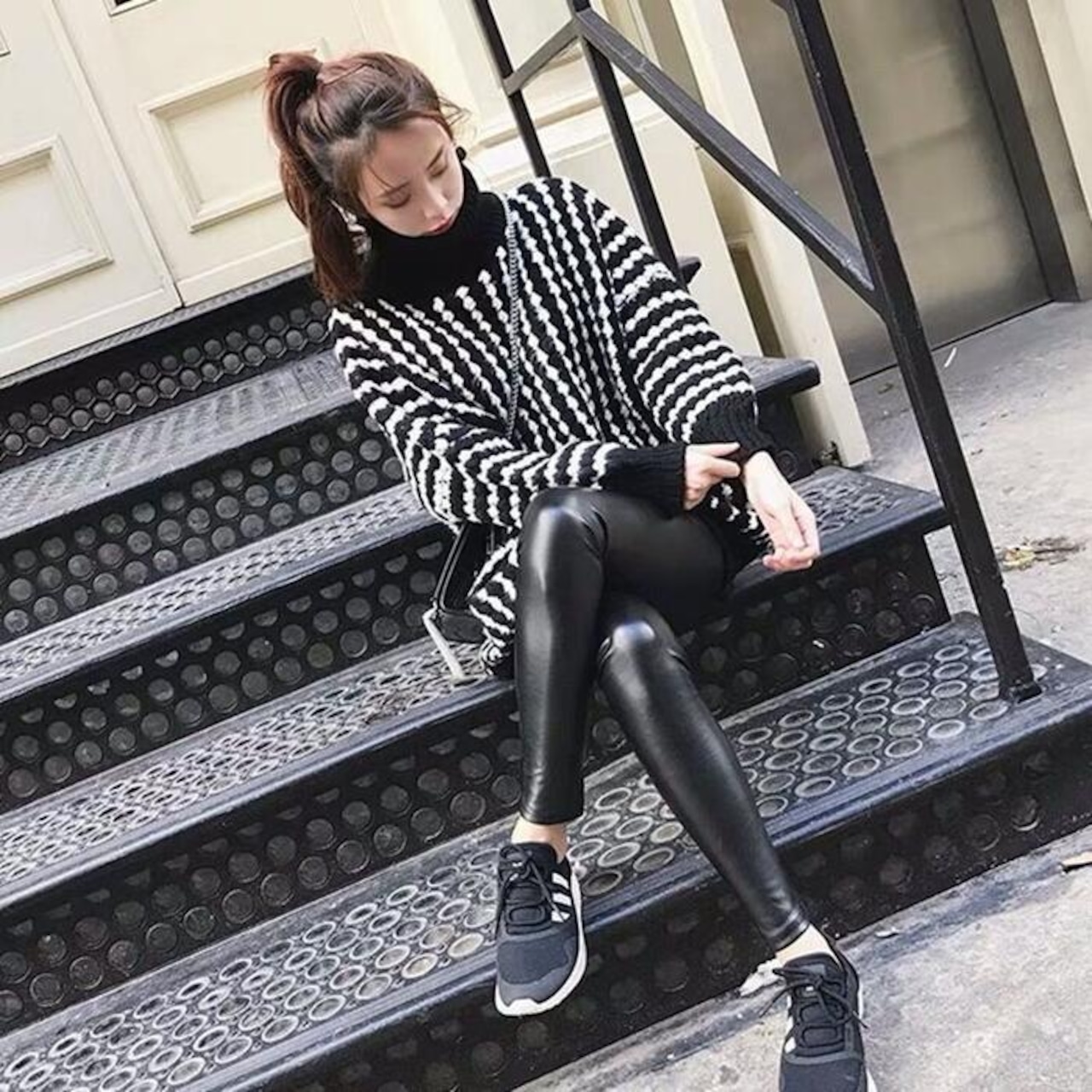 ざっくり編みが可愛いストライプ×ボーダーのタートルニット。