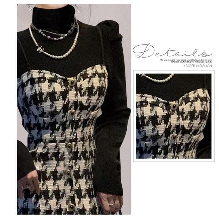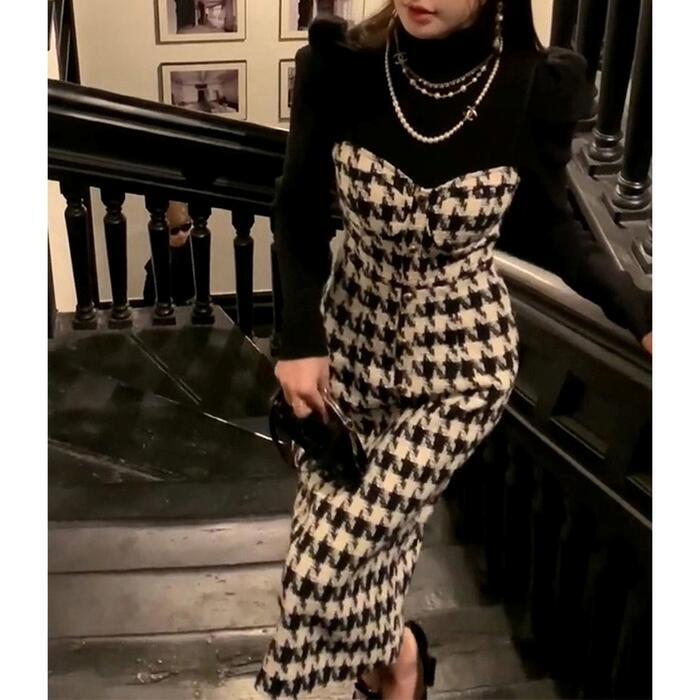 大きいサイズセットアップ レイヤード トップス ワンピース キャミワンピ 千鳥格子 ジャンパースカート タートルネック レディース きれいめ カジュアル 長袖 ミモレ丈 おしゃれ 大人 可愛い 2点セット ブラック 黒 春 秋 冬 20代 30代 40代 50代