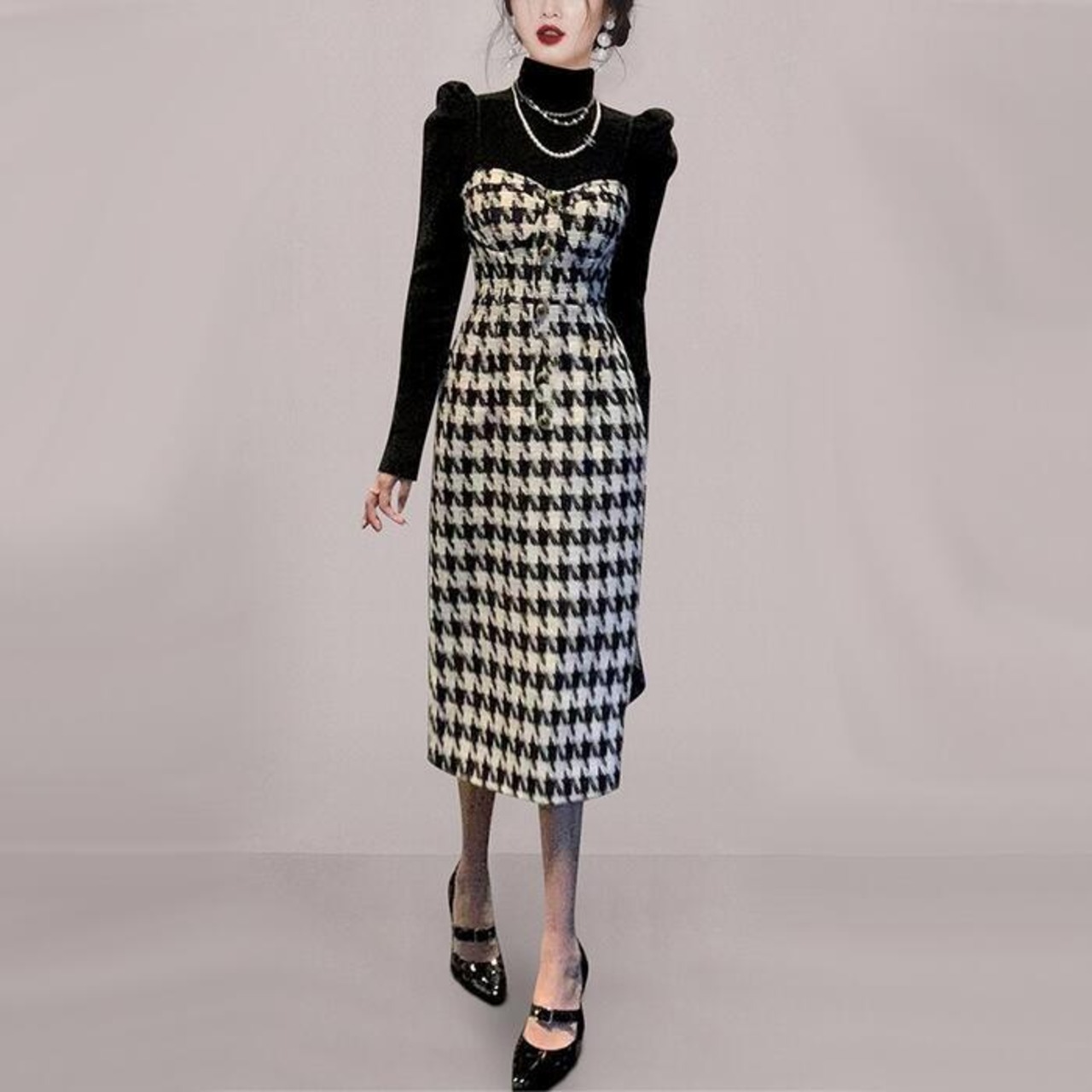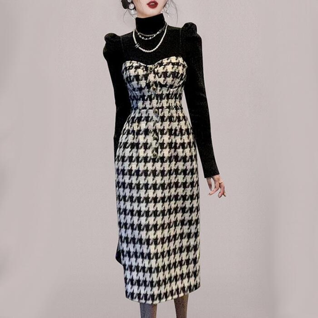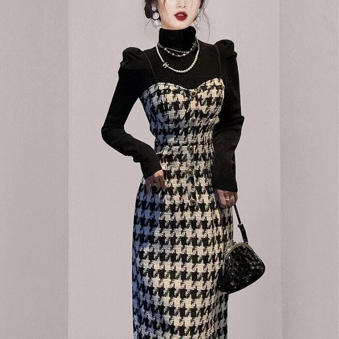 パワーショルダーのタートルニットと千鳥格子柄ワンピースのセット。