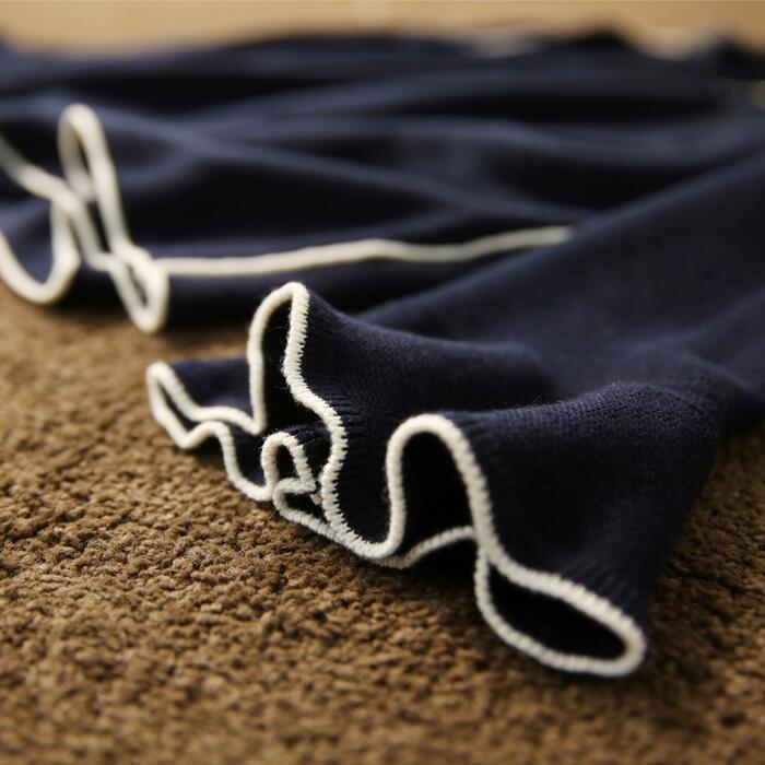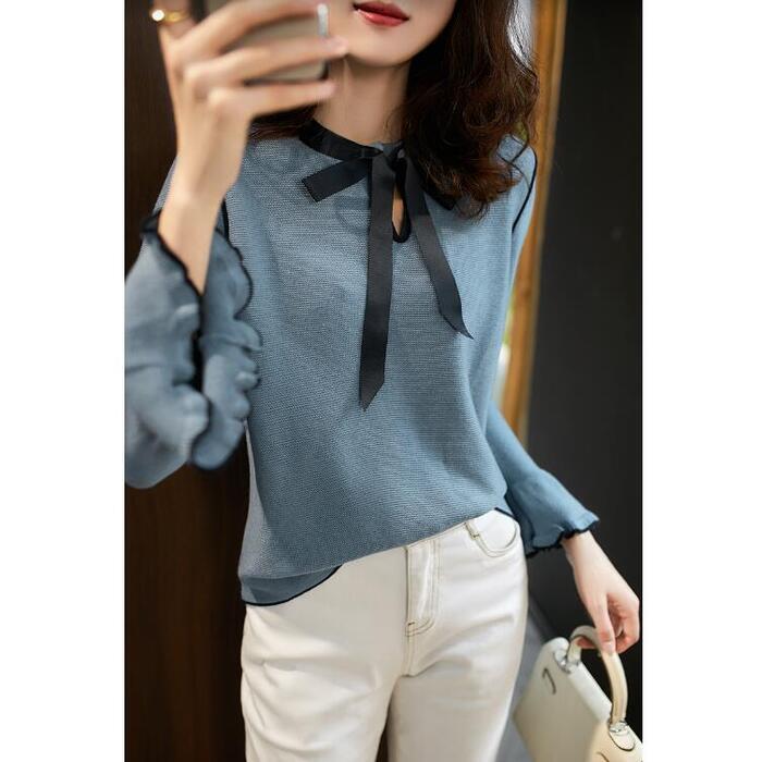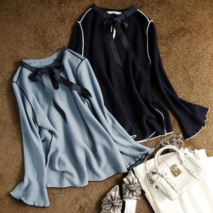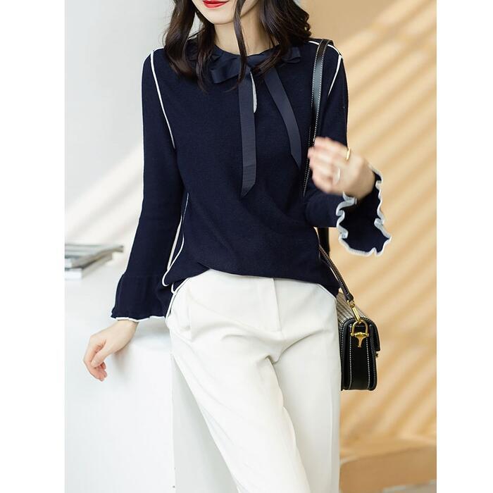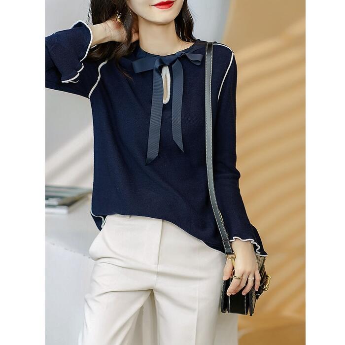 パイピングとリボンがポイントのニットトップス。