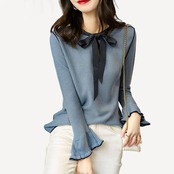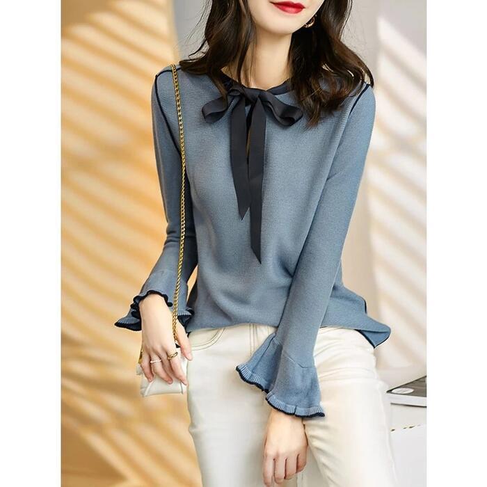 全2色 大きいサイズトップス ニット セーター リボン レディース エレガント きれいめ カジュアル おしゃれ 長袖 大人 可愛い ナチュラル フレアスリーブ カットソー 上品 フェミニン ブルー 青 ネイビー 春 秋 冬 20代 30代 40代 50代