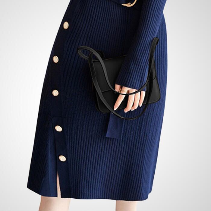 サイドボタンがポイントのハイネックニットワンピース。