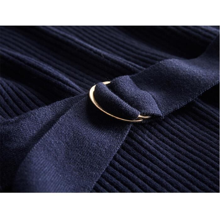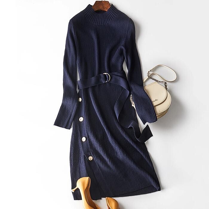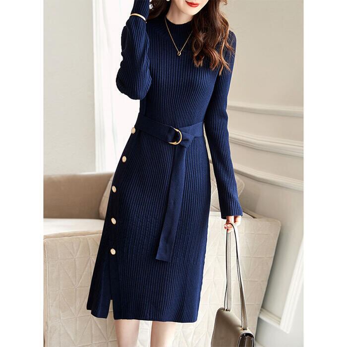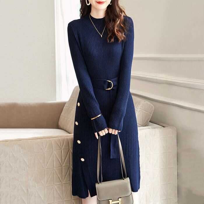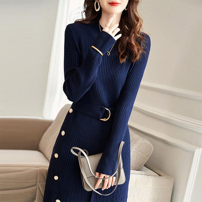 大きいサイズワンピース ニット 袖あり ワンピ ドレス ハイネック レディース エレガント きれいめ カジュアル おしゃれ 長袖 大人 可愛い フェミニン ミモレ丈 ベルト サイドボタン ハイウエスト 青 ネイビー 春 秋 冬 20代 30代 40代 50代