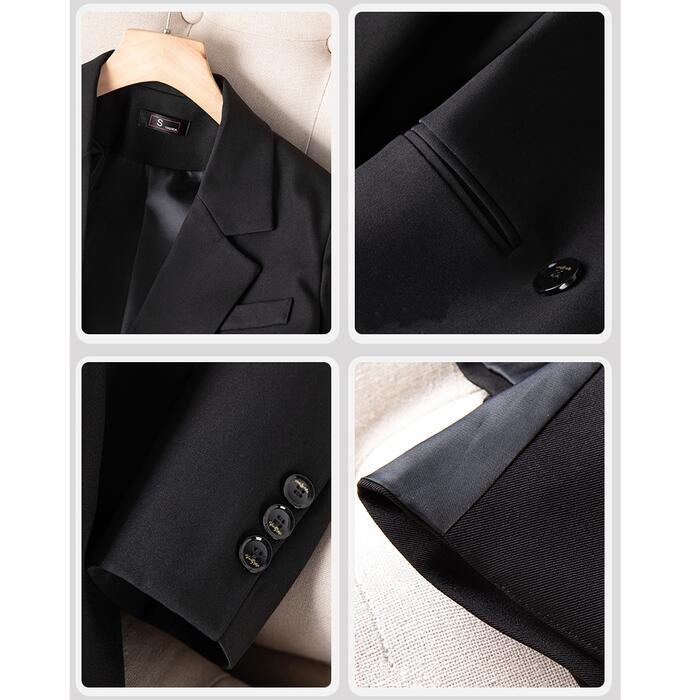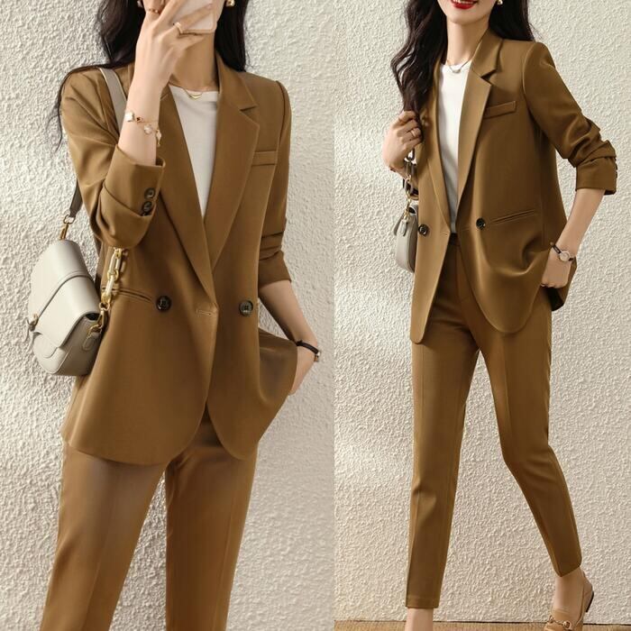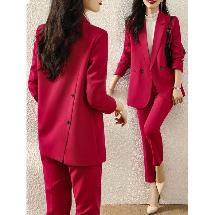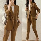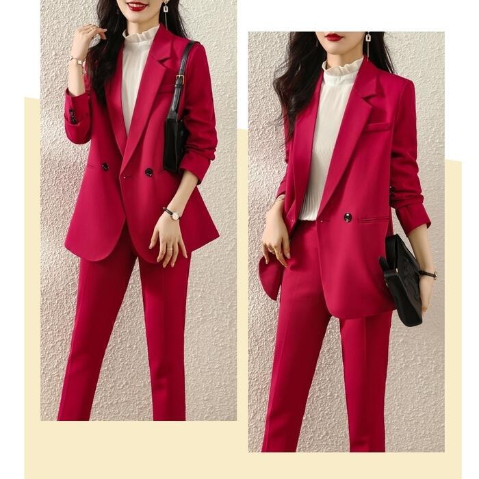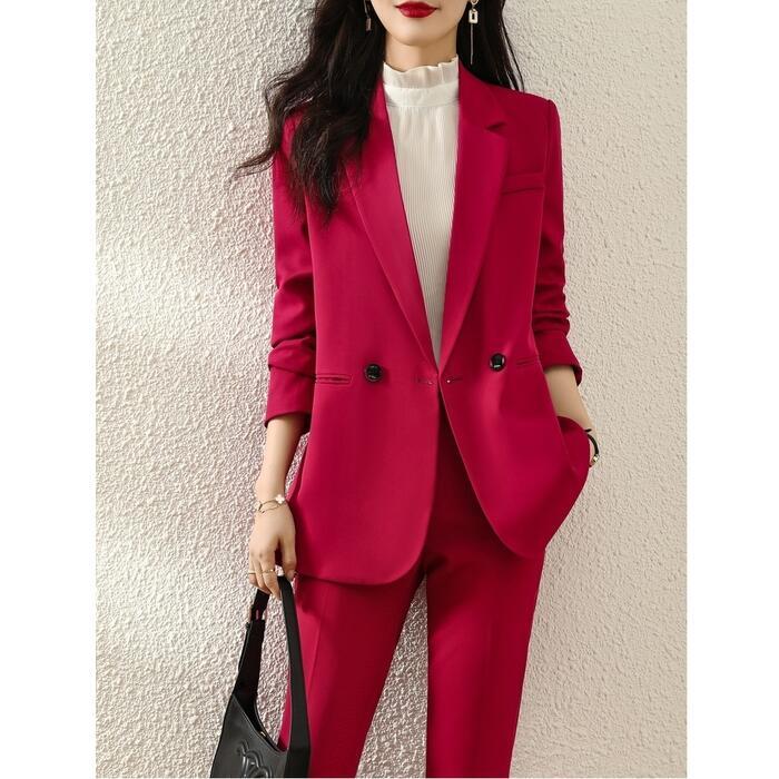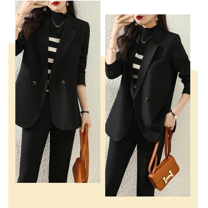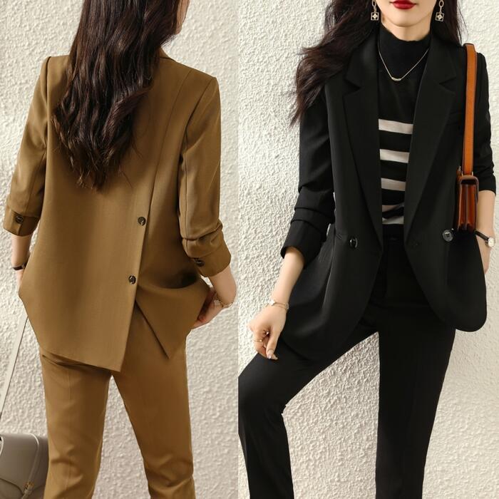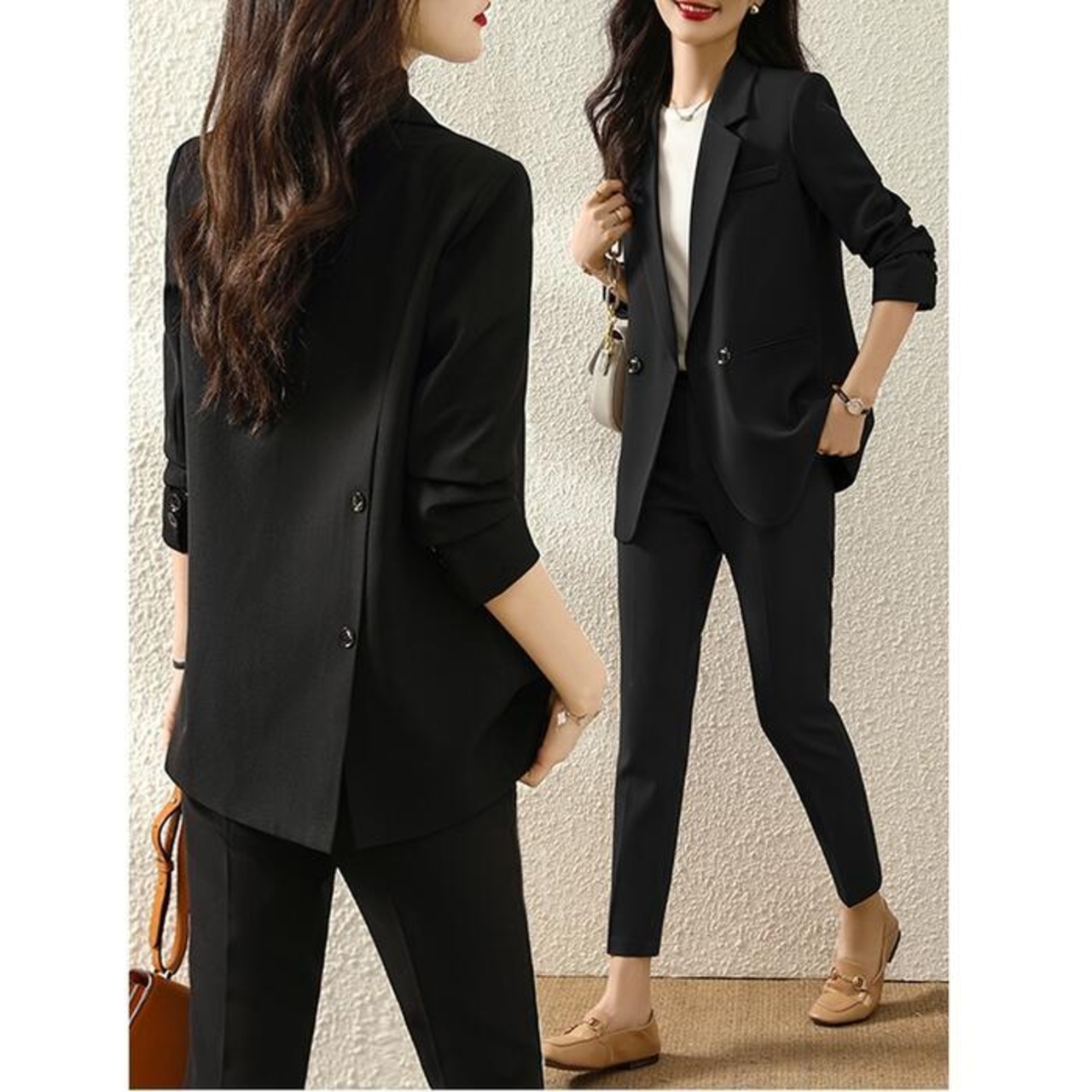 バックのボタンデザインがポイントのパンツスーツ。