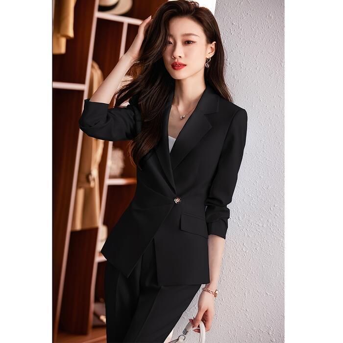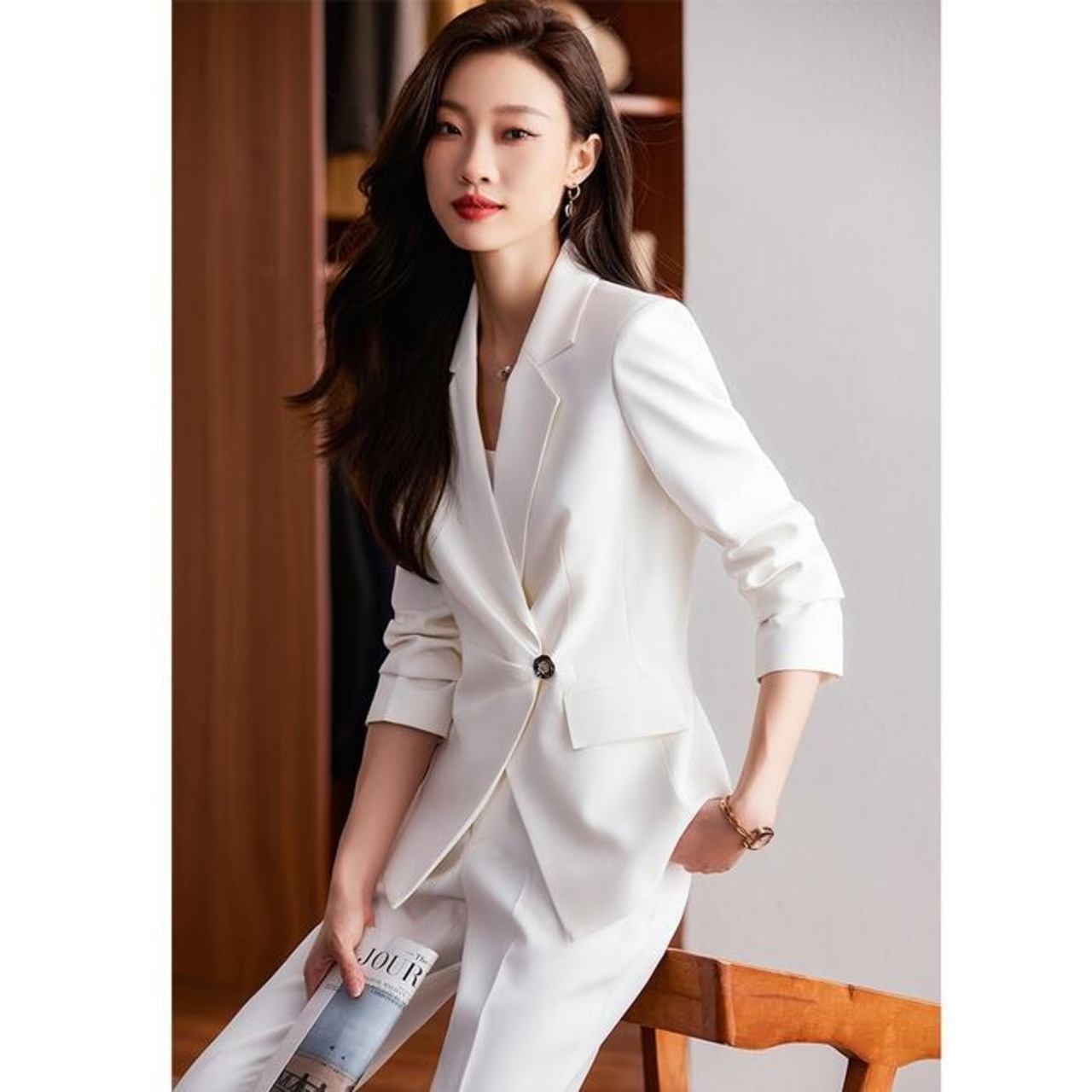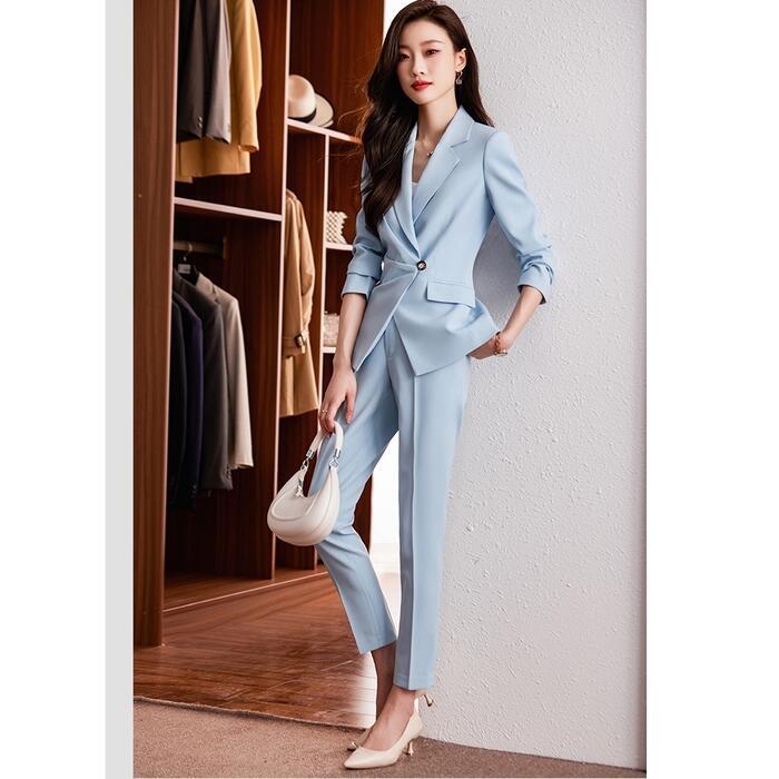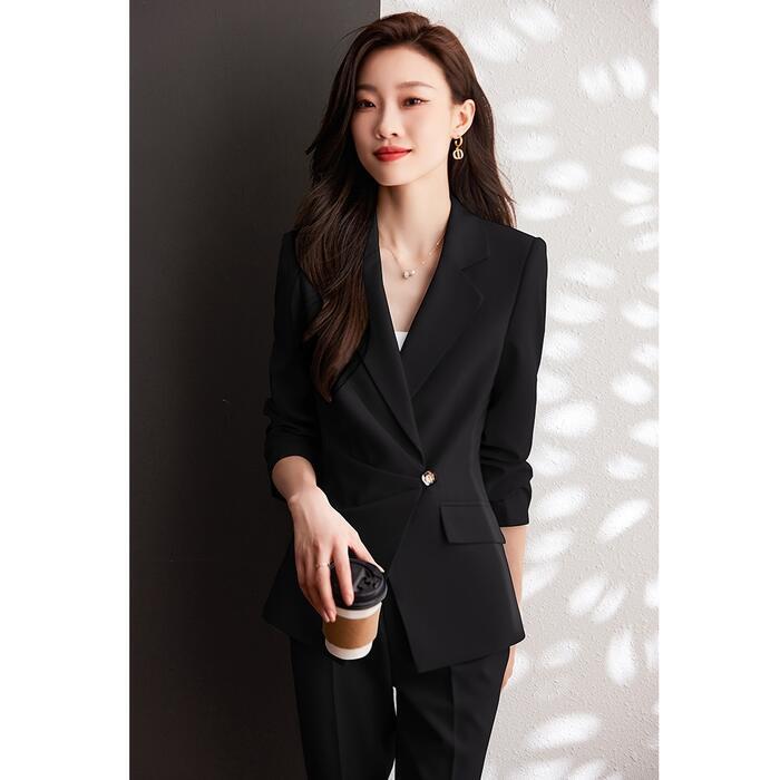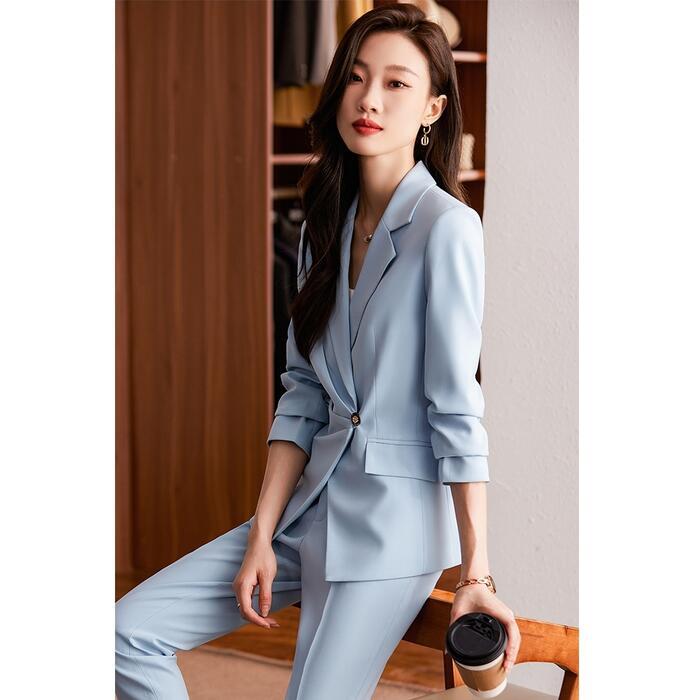 ウエストのタックデザインがスタイリッシュなパンツスーツ。