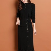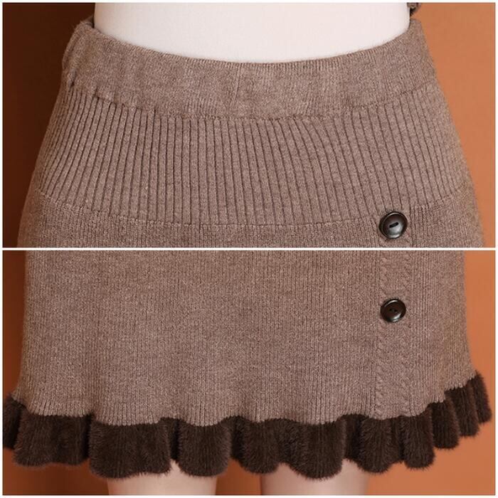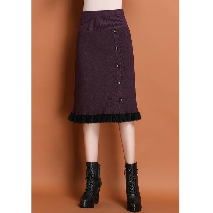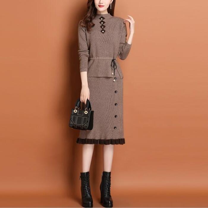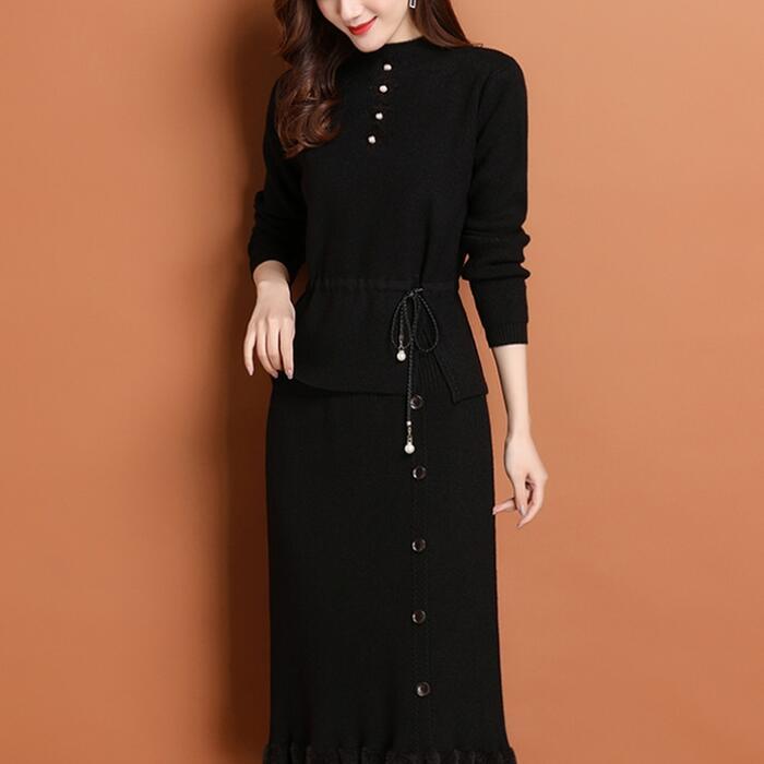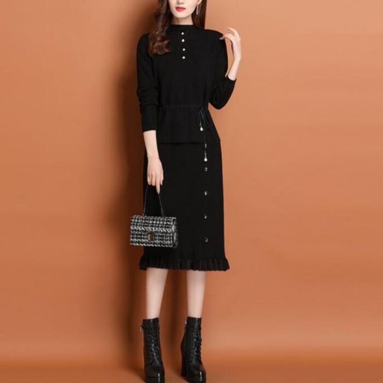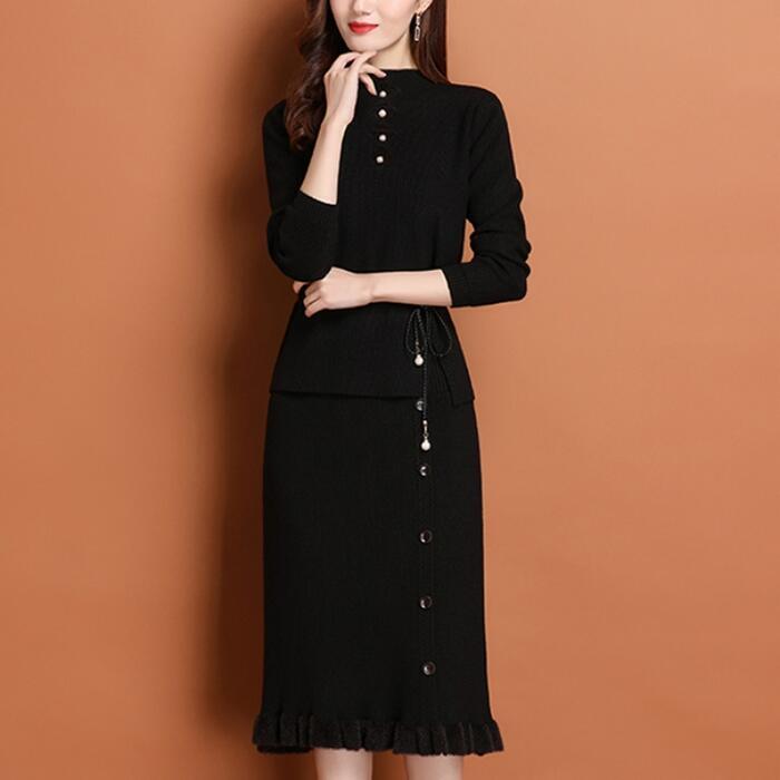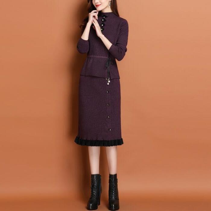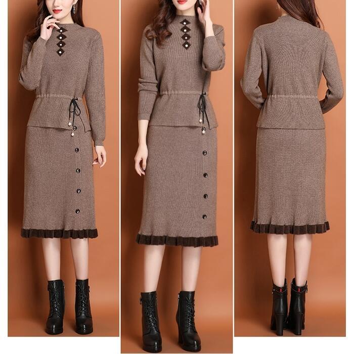 全3色 セットアップ 2点セット ニット トップス スカート 長袖 フリル フェミニン きれいめ カジュアル おしゃれ 大人 可愛い ひざ丈 体型カバー ペプラム エレガント 大きいサイズ ベージュ パープル ブラック 黒 春 秋 冬 20代 30代 40代