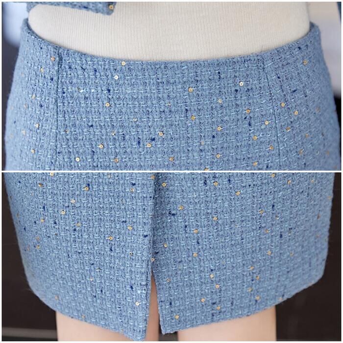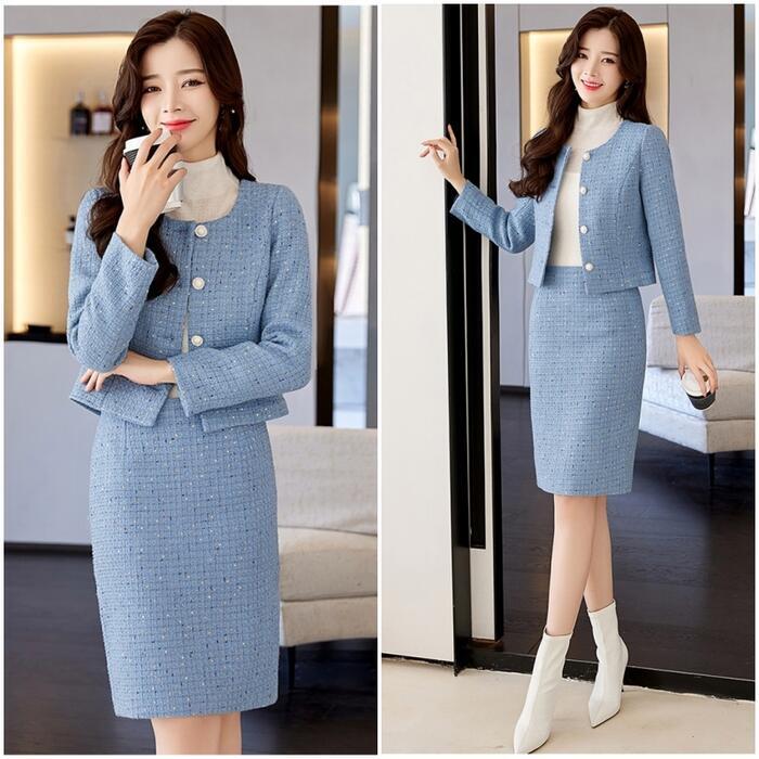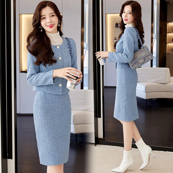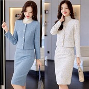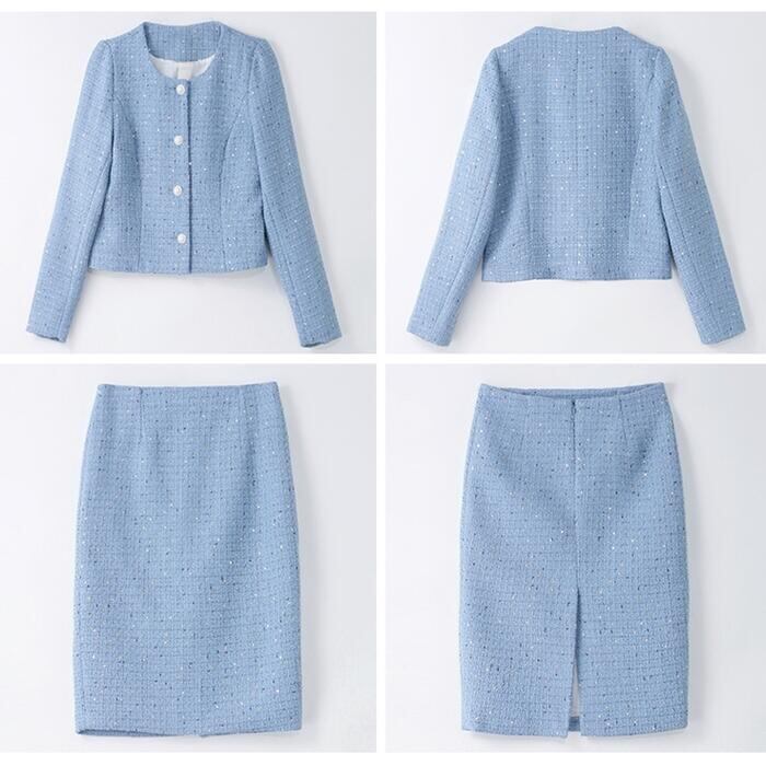 ノーカラージャケットとタイトスカートのツイードセットアップ。