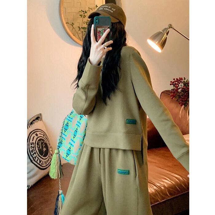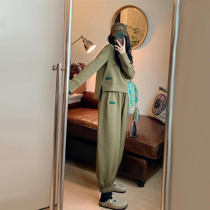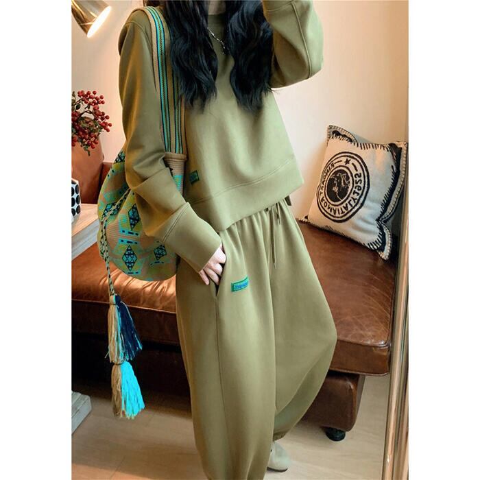 全2種 大きいサイズセットアップ 2点セット トップス パンツ 長袖 スウェット ロゴ きれいめ カジュアル おしゃれ 大人 可愛い リラックス 体型カバー 楽ちん ウエストゴム スポーティ シンプル ルームウェア グリーン 緑 春 秋 冬 20代 30代 40代