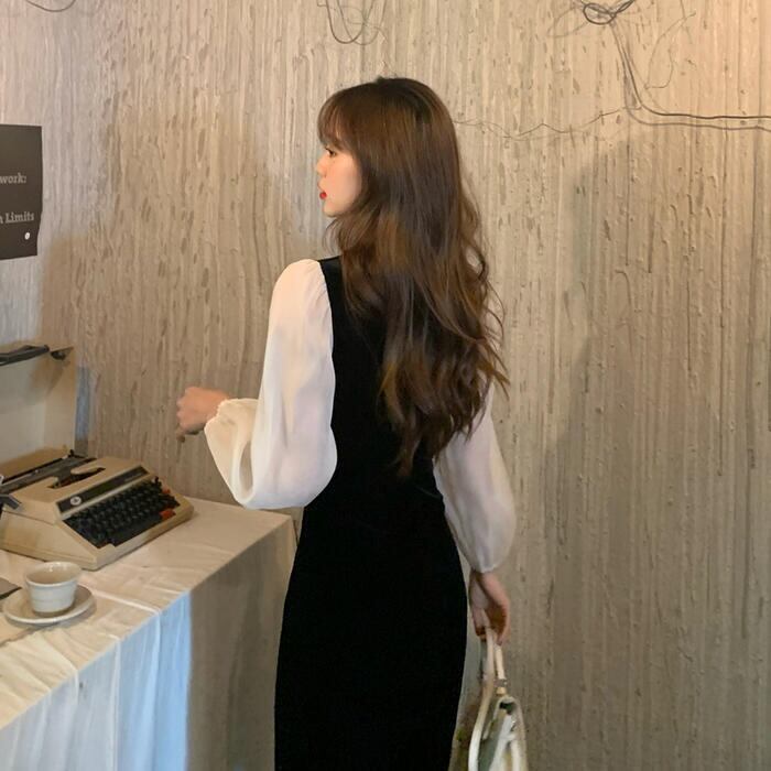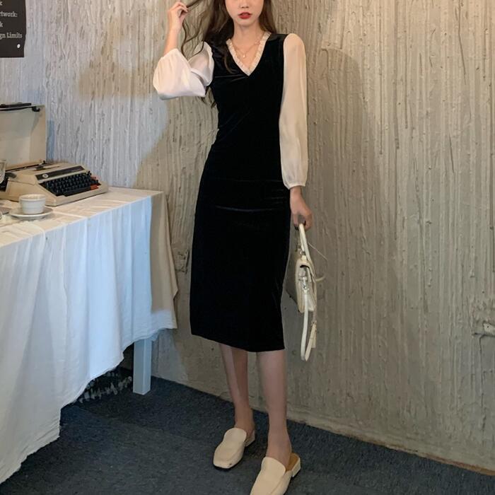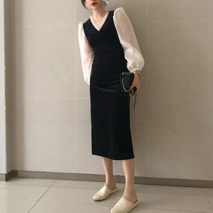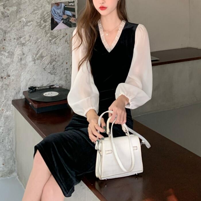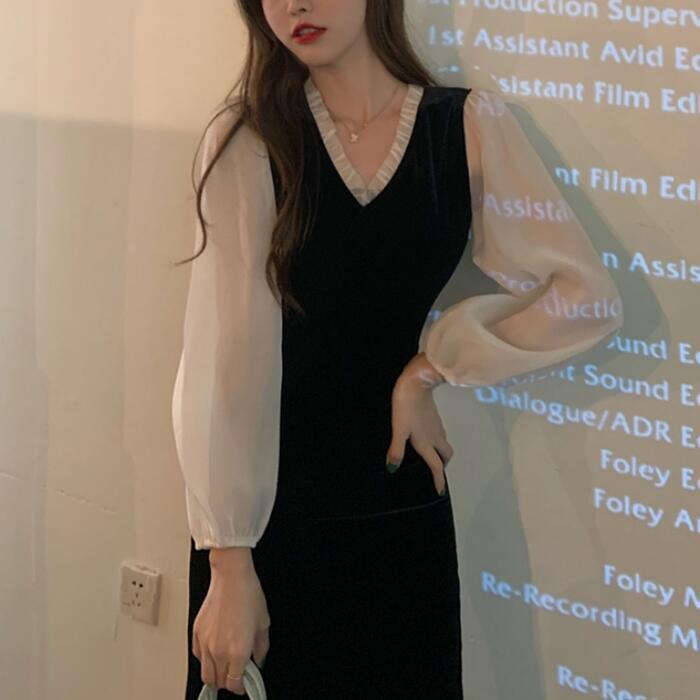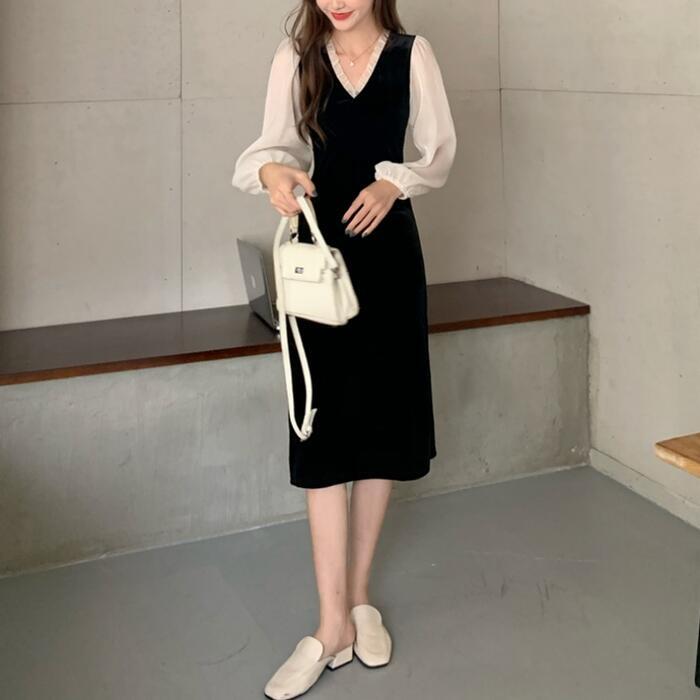大きいサイズパフスリーブ ワンピース 袖あり シアー きれいめ カジュアル ミモレ丈 長袖 ワンピ ドレス フリル フェミニン レディース エレガント ベロア 切替 お呼ばれ 二次会 大人 可愛い シンプル ブラック 黒 春 秋 冬 20代 30代 40代 50代