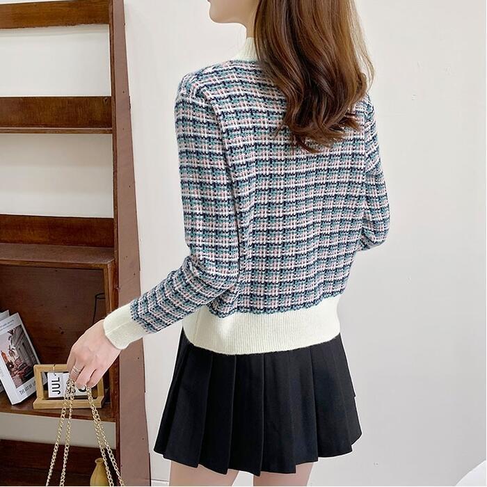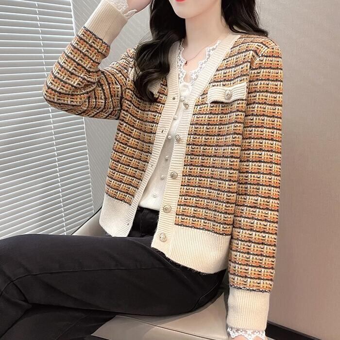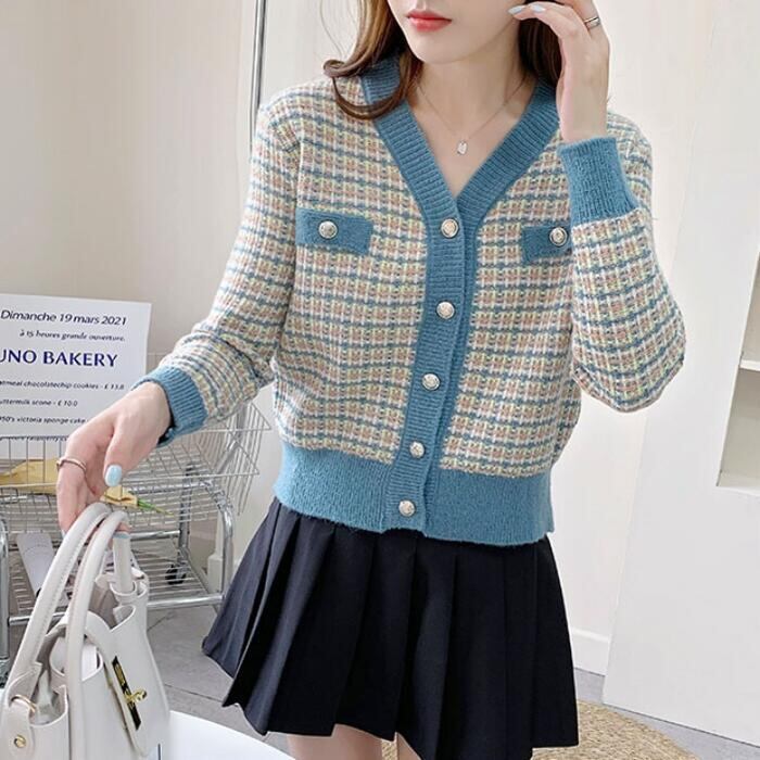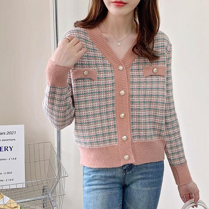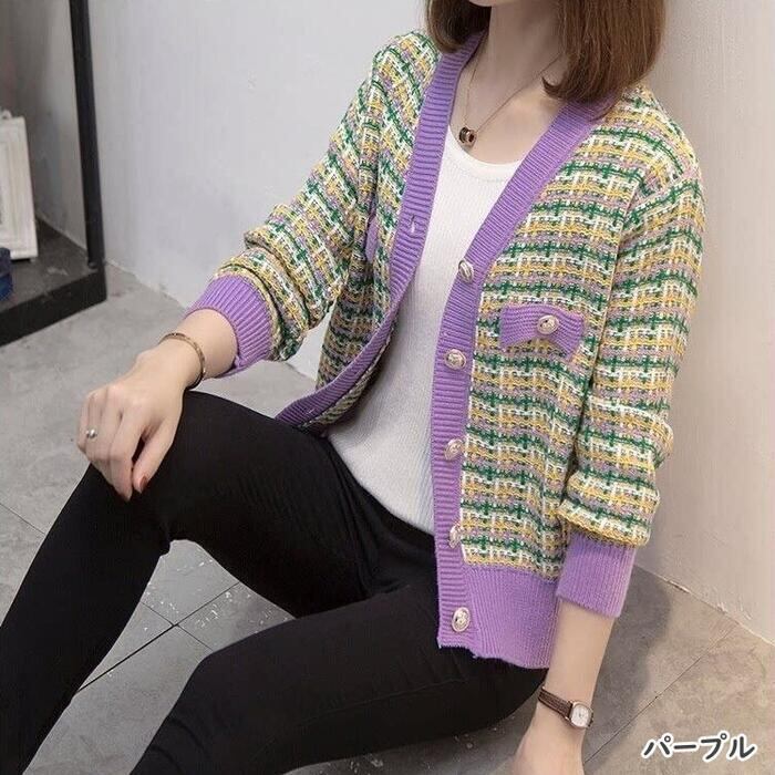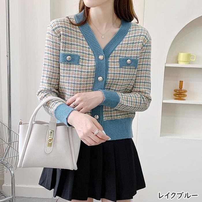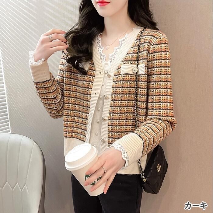 全5色 大きいサイズトップス ニット カーディガン チェック レディース エレガント きれいめ カジュアル Vネック おしゃれ 長袖 大人 可愛い フェミニン ナチュラル オフィス 通勤 韓国 ブルー ピンク ブラウン パープル ホワイト 白 春 秋 夏 20代 30代 40代 50代