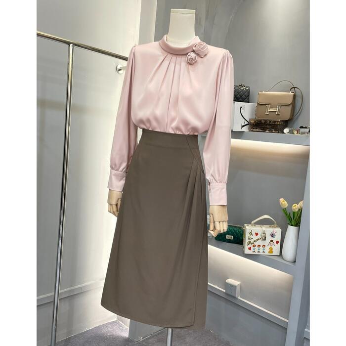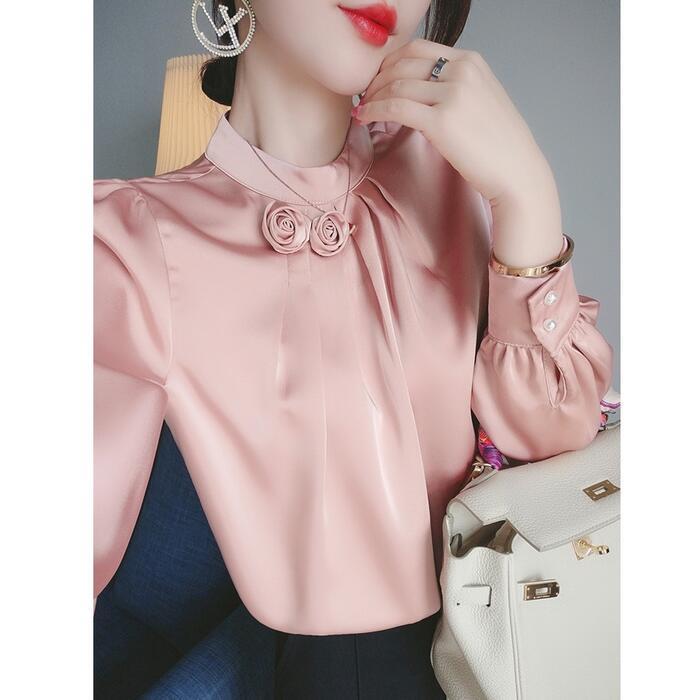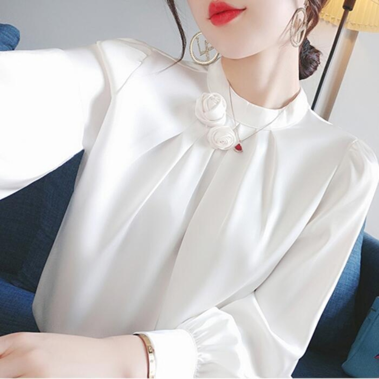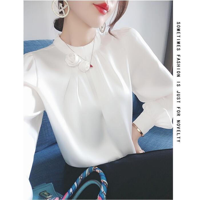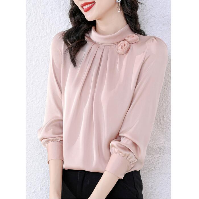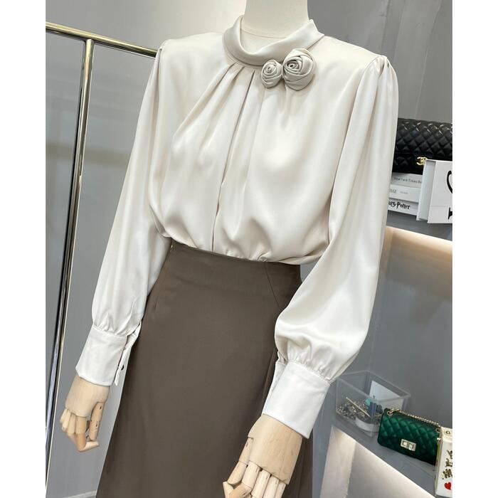 首元のフラワーモチーフがポイントのサテンブラウス。