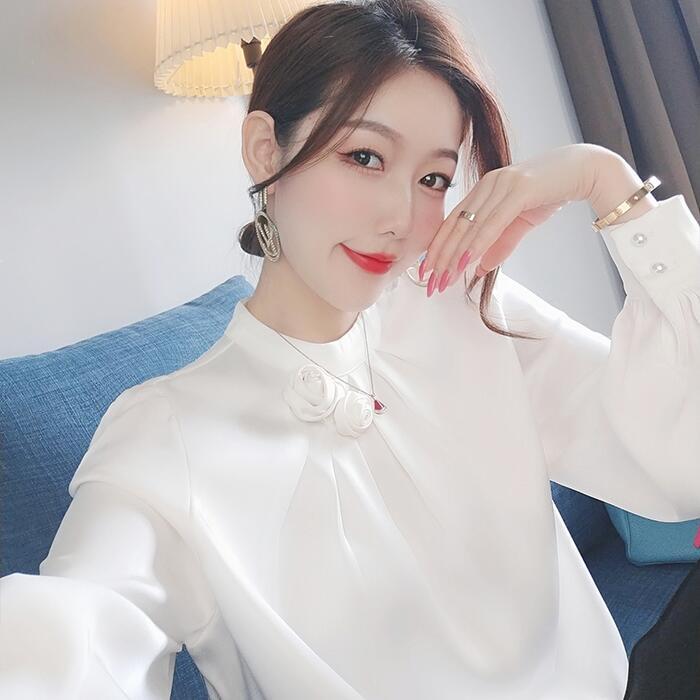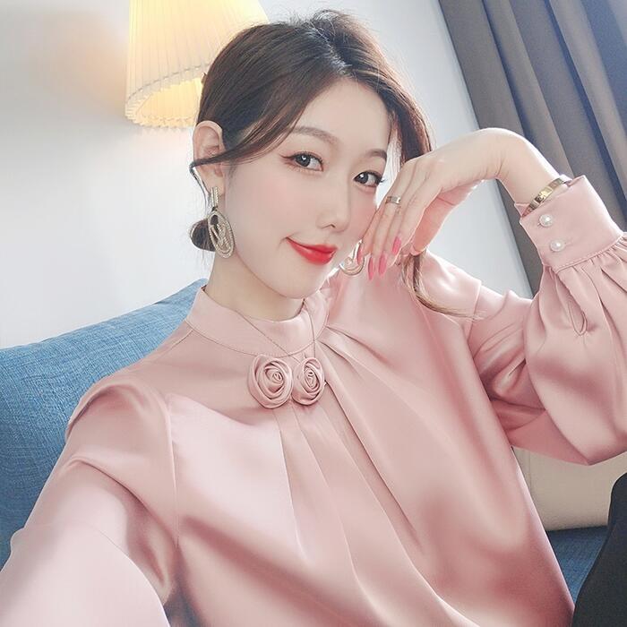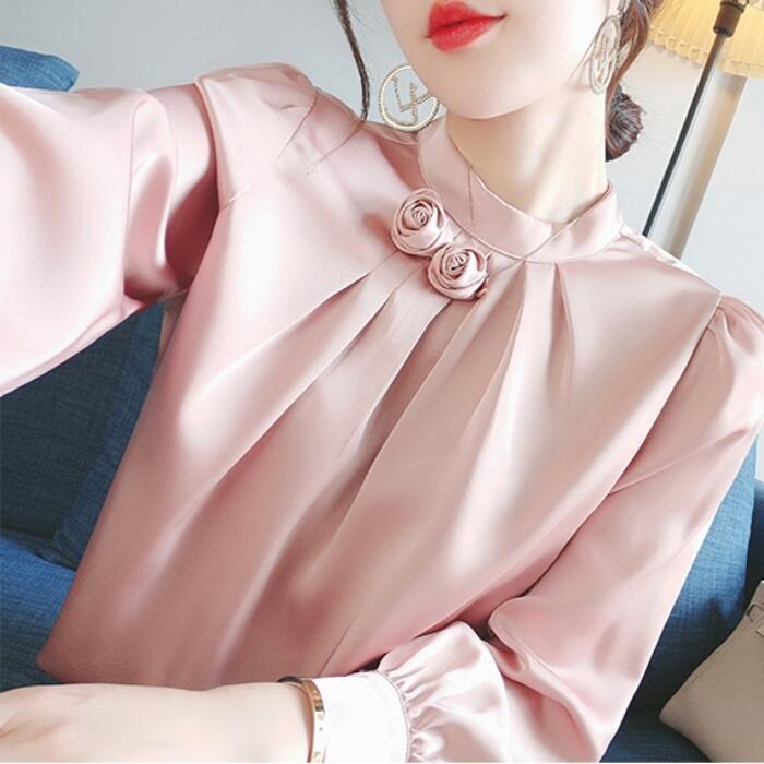 全2色 大きいサイズトップス ブラウス シャツ スタンドカラー ローズ サテン レディース エレガント きれいめ カジュアル おしゃれ 長袖 大人 可愛い フェミニン シンプル フラワー オフィス 通勤 お呼ばれ ピンク ホワイト 白 春 秋 冬 20代 30代 40代 50代