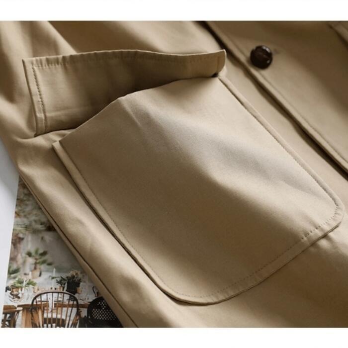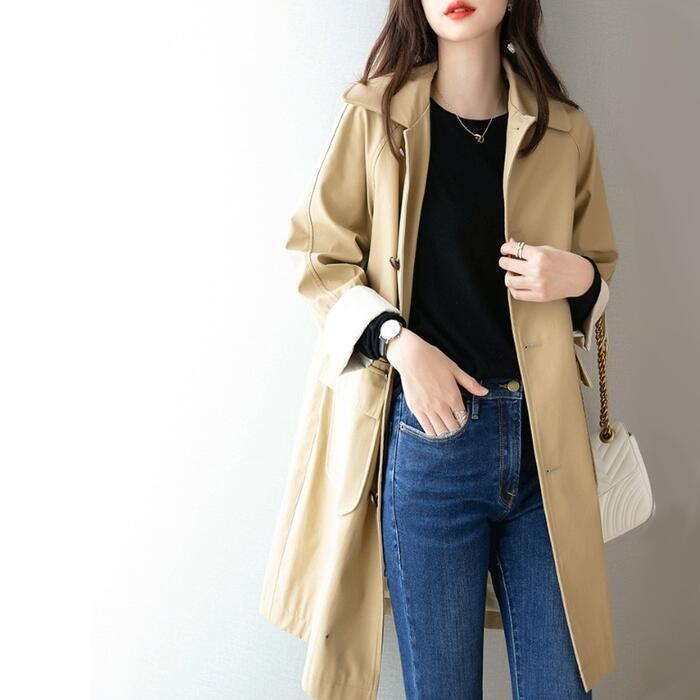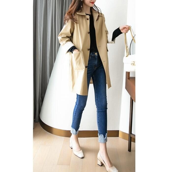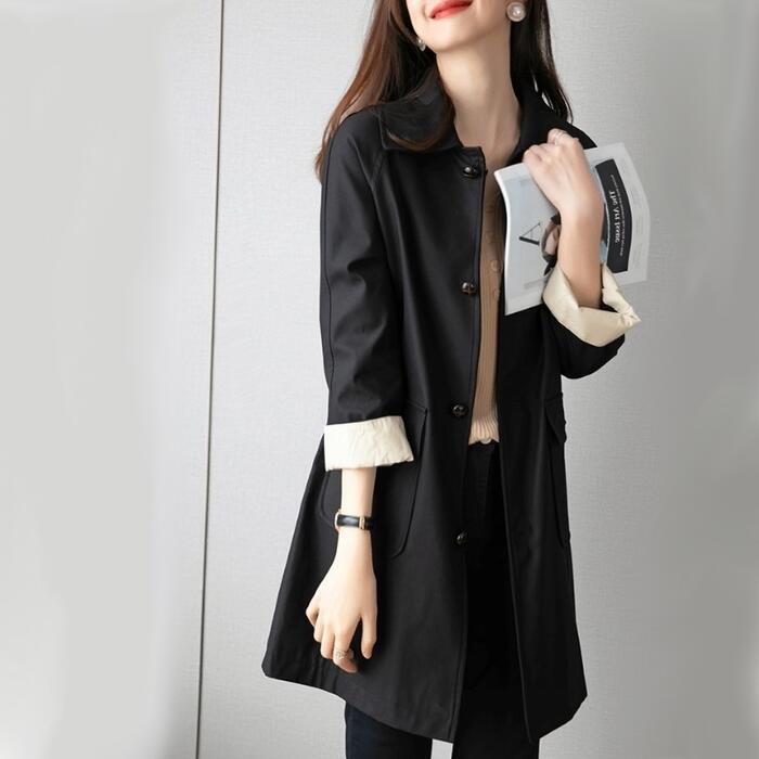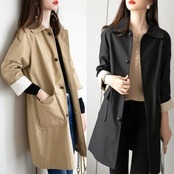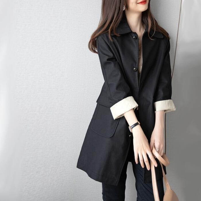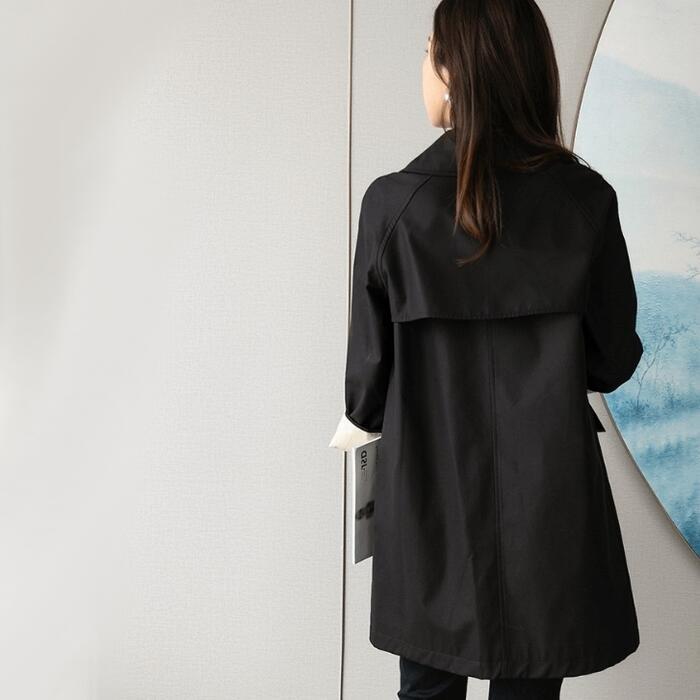 全2色 ゆったり 体型カバー 大きいサイズ トラッド アウター ステンカラーコート ジャケット スプリングコート トレンチ レディース エレガント きれいめ カジュアル おしゃれ 七分袖 大人 可愛い シンプル フェミニン ベージュ ブラック 黒 春 秋 冬 20代 30代 40代 50代