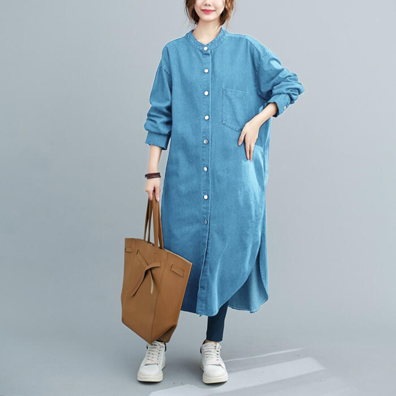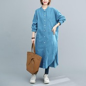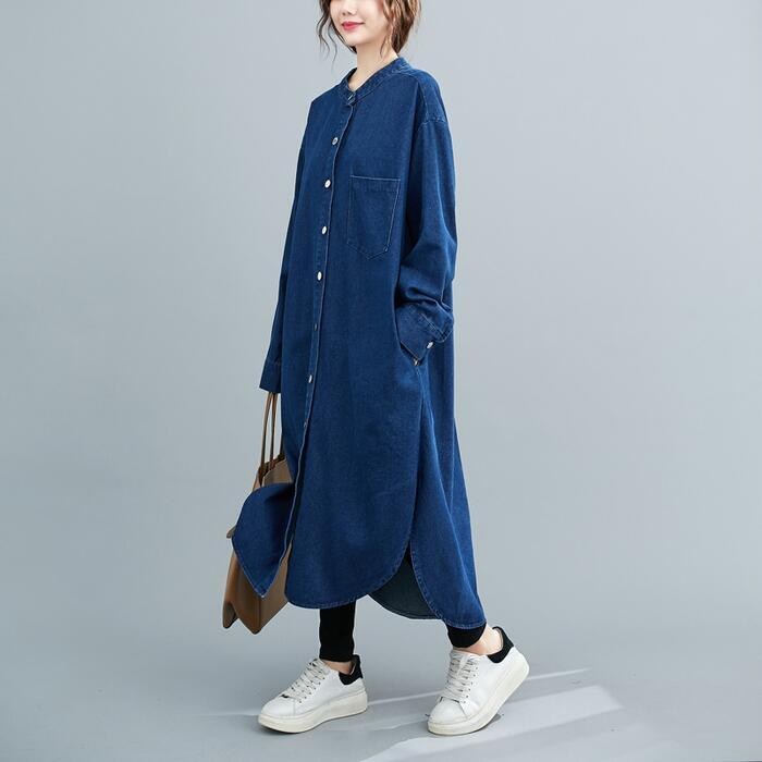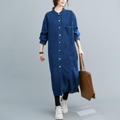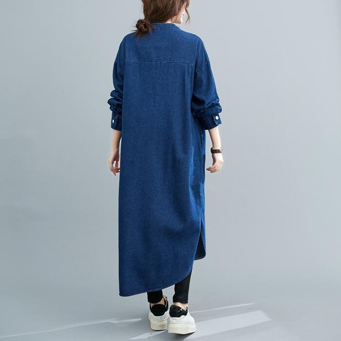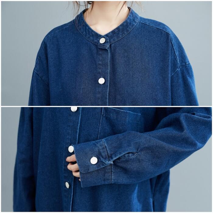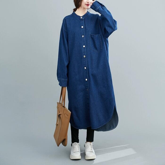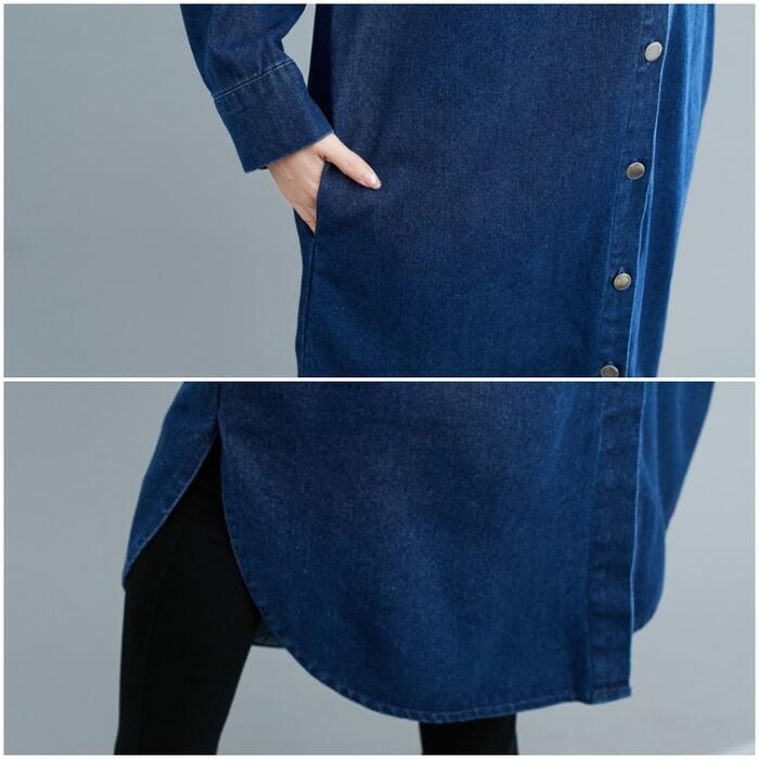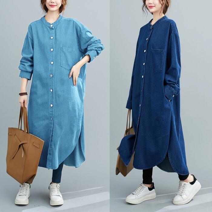 全2色 デニム ワンピース 袖あり シャツワンピ きれいめ ロング丈 長袖 ワンピ ドレス フェミニン レディース 大人 可愛い カジュアル ゆったり 体型カバー シンプル オーバーサイズ 韓国 ブルー 青 春 秋 冬 20代 30代 40代 50代