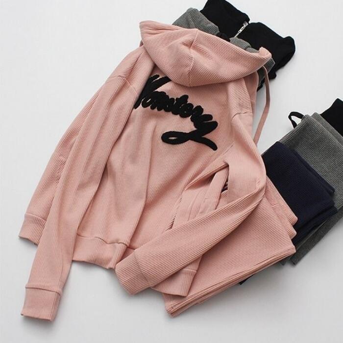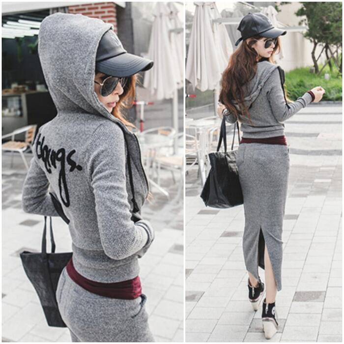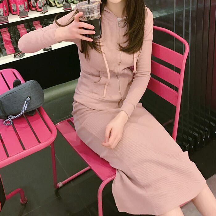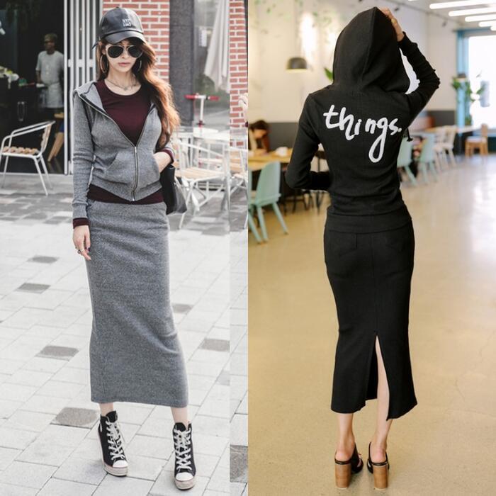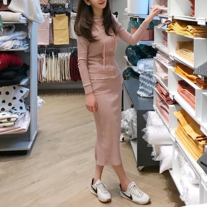 ニットのパーカー&スカートのセットアップ。