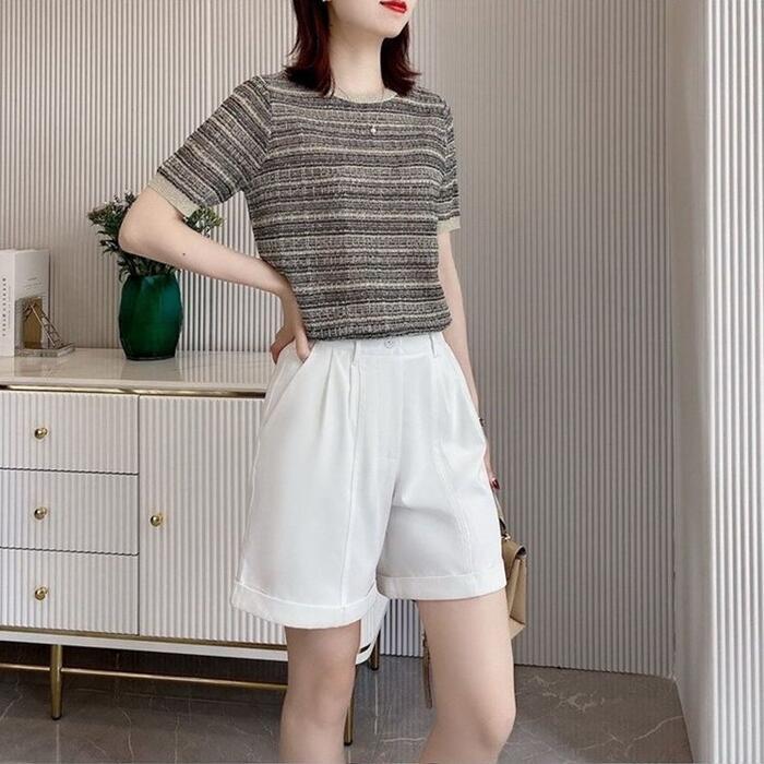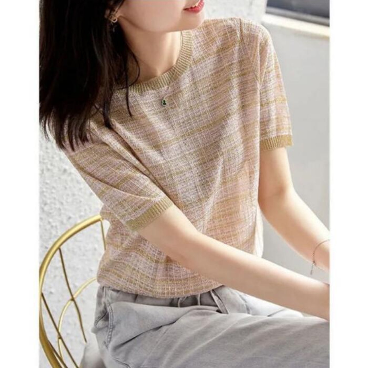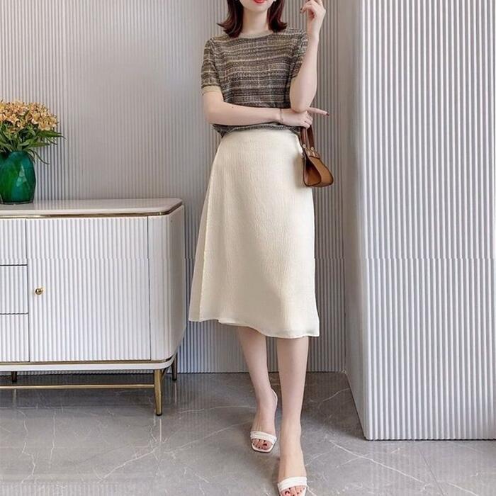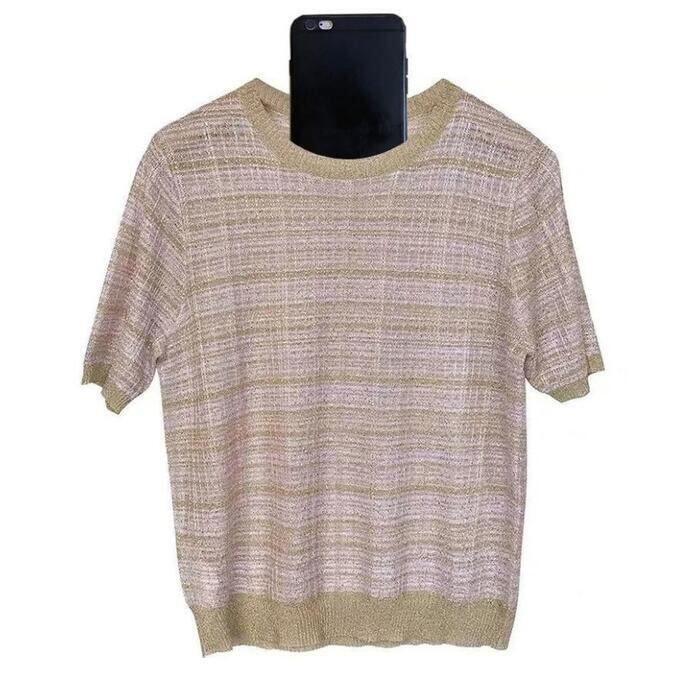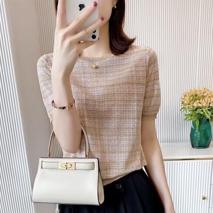 全2色 大きいサイズトップス ニット チェック カットソー シルク混 レディース エレガント きれいめ カジュアル おしゃれ 半袖 大人 可愛い フェミニン ナチュラル クルーネック オフィス 通勤 涼しい ピンク ブラック 黒 春 秋 冬 20代 30代 40代 50代