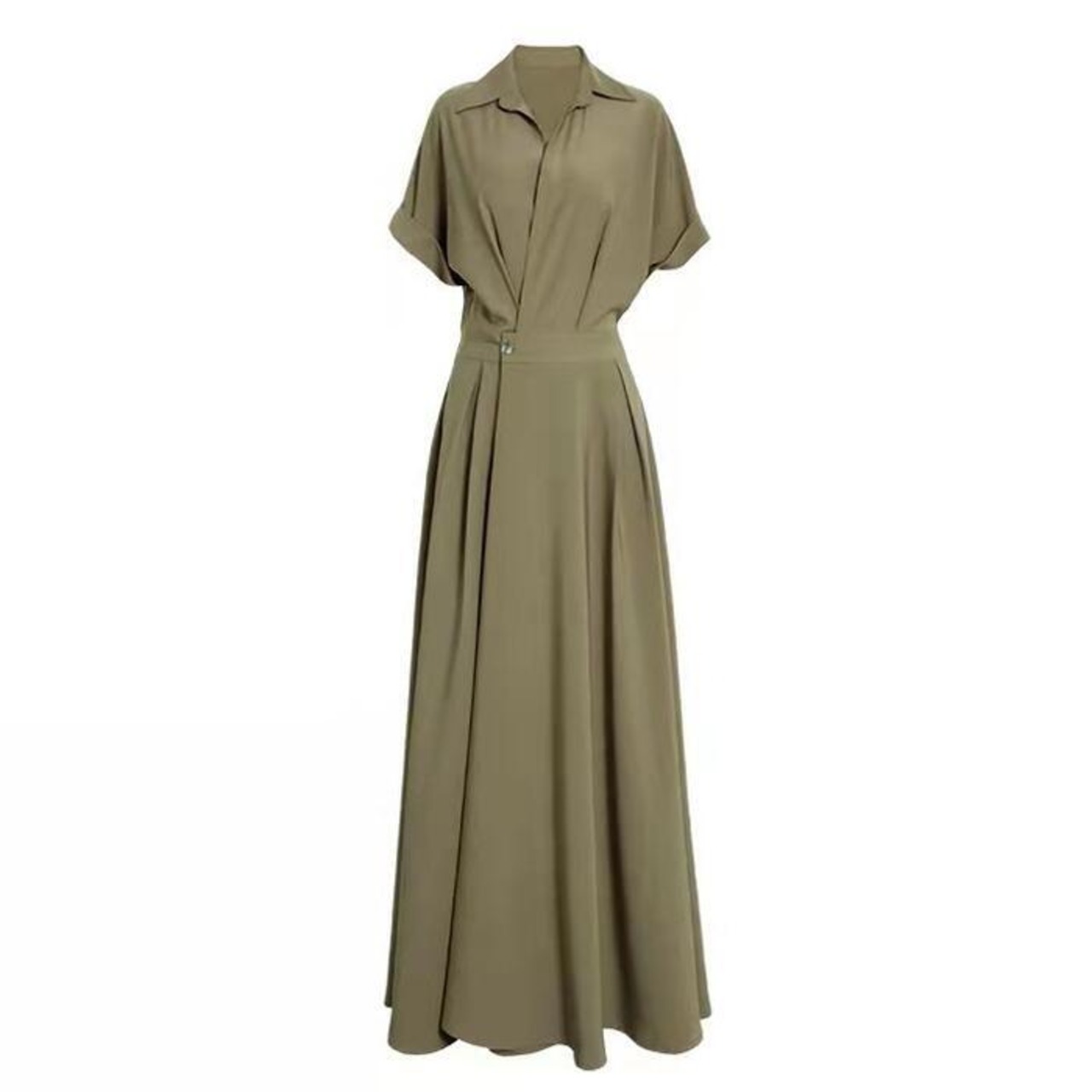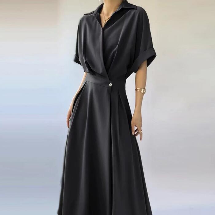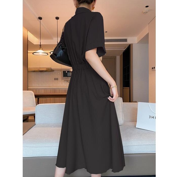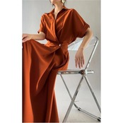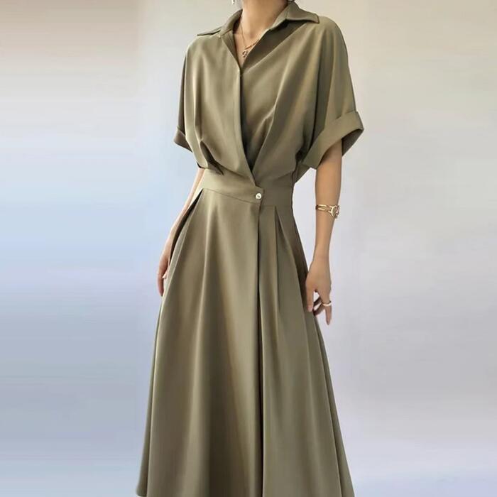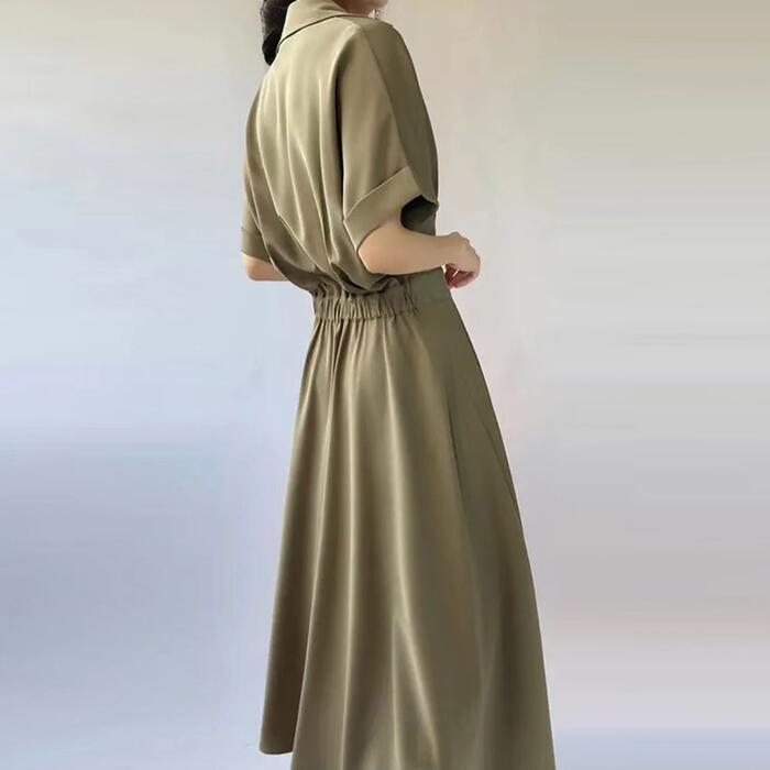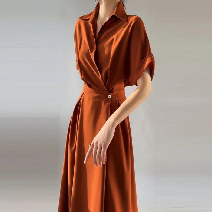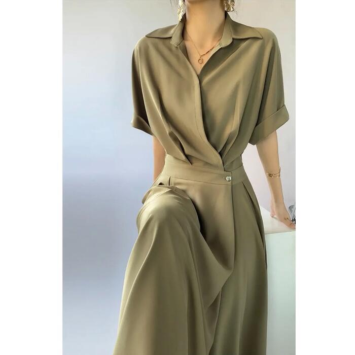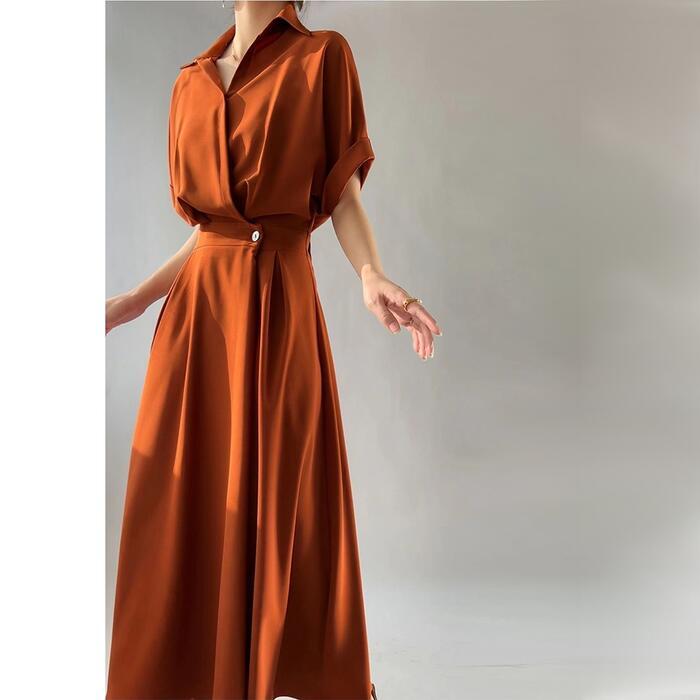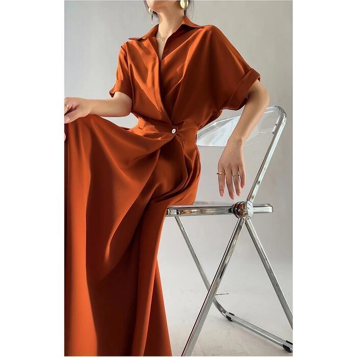 全3色 大きいサイズワンピース シャツワンピ 袖あり カシュクール レディース エレガント きれいめ カジュアル おしゃれ 半袖 大人 可愛い フェミニン ハイウエスト ウエストゴム ミモレ丈 シンプル オレンジ グリーン 緑 ブラック 黒 春 秋 夏 20代 30代 40代 50代
