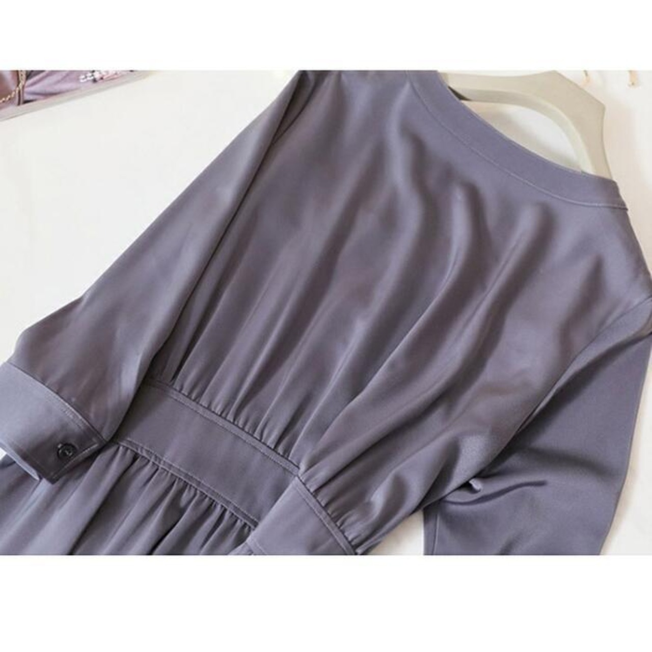 大きいサイズ ワンピース シャツワンピ 袖あり スキッパー レディース エレガント きれいめ カジュアル Vネック おしゃれ 長袖 大人 可愛い フェミニン ウエストリボン ミモレ丈 シンプル ゆったり 体型カバー パープル 春 秋 冬 20代 30代 40代 50代