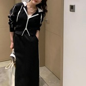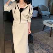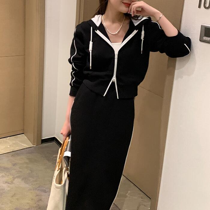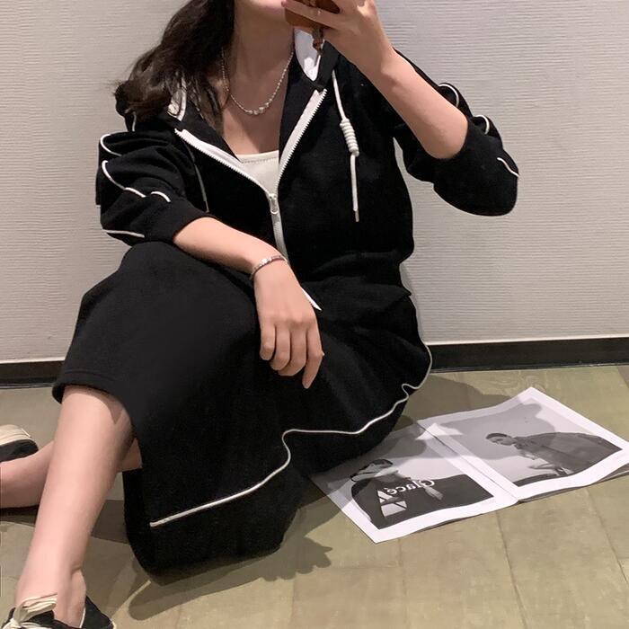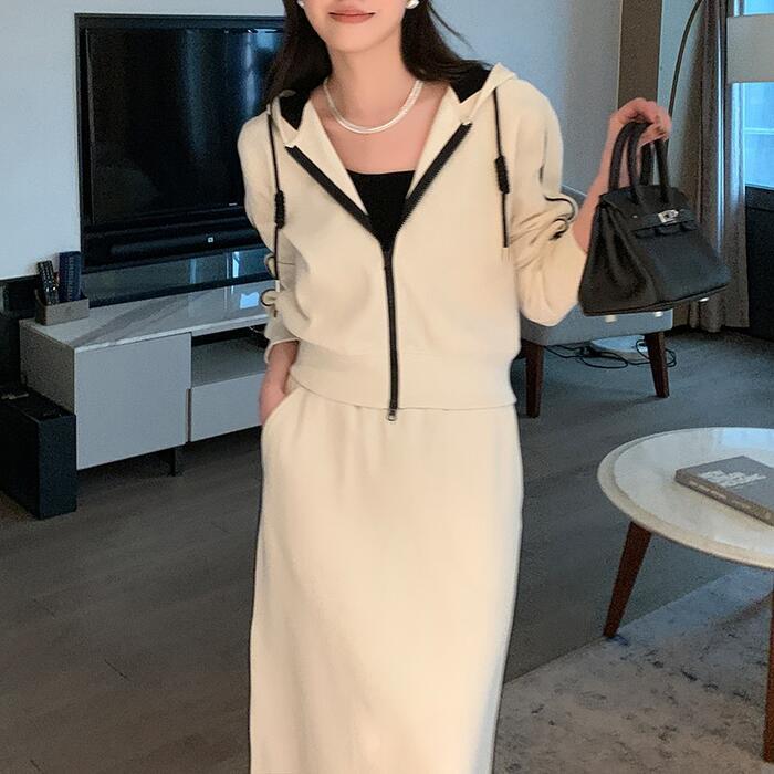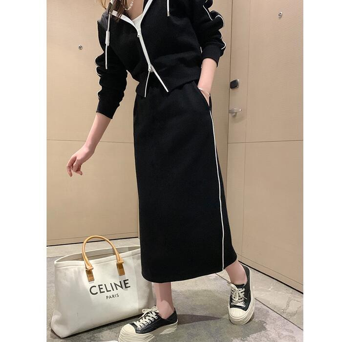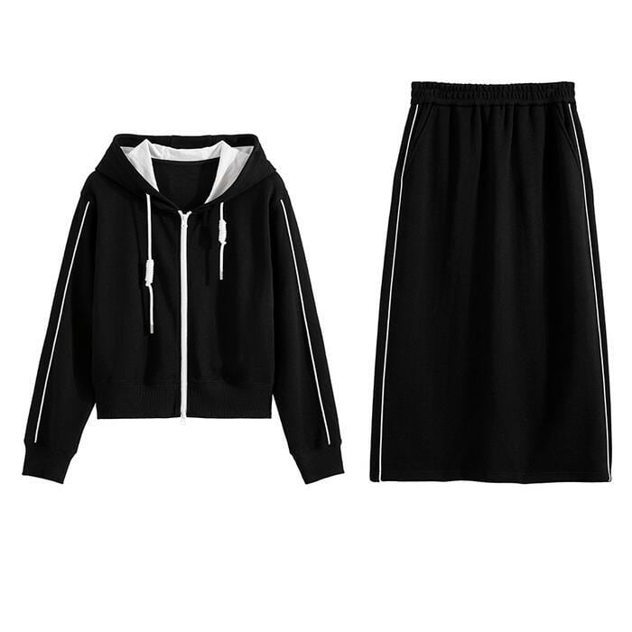 全2色 楽ちん 大きいサイズ セットアップ 2点セット トップス スカート ジャケット パーカー ライン 長袖 ショート丈 ミモレ丈 おしゃれ 大人 可愛い カジュアル フェミニン タイト スポーティ かっこいい リラックス ベージュ ブラック 黒 春 秋 冬 20代 30代 40代 50代