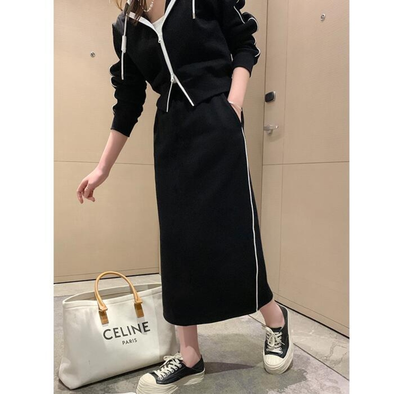 ショート丈のパーカーとスカートのセットアップ。
