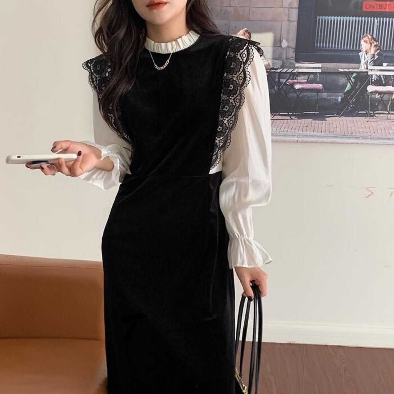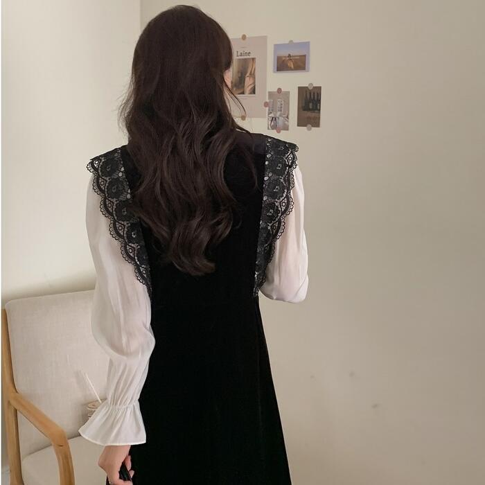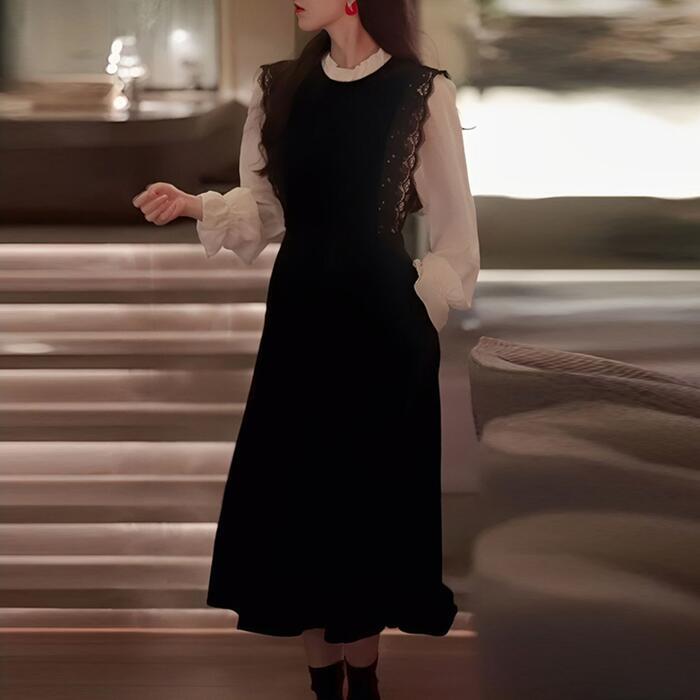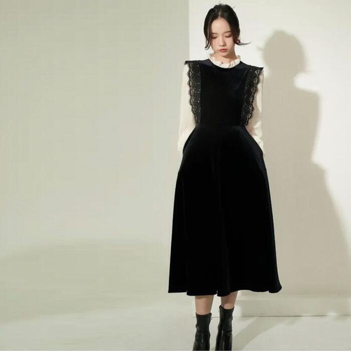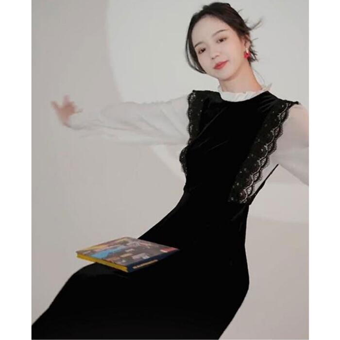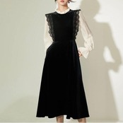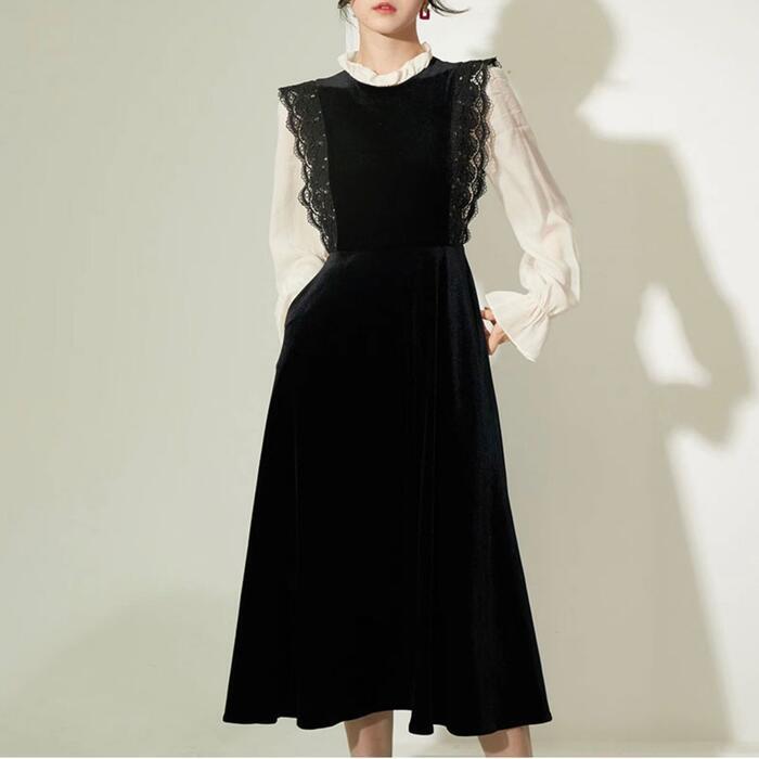 大きいサイズ お呼ばれ ワンピース ワンピ ドレス 袖あり ベロア レース 切替 エレガント レディース きれいめ カジュアル レイヤード風 異素材ミックス おしゃれ 長袖 大人 可愛い フェミニン 透け感 体型カバー ミモレ丈 韓国 ブラック 黒 春 秋 冬 20代 30代 40代 50代