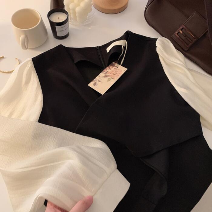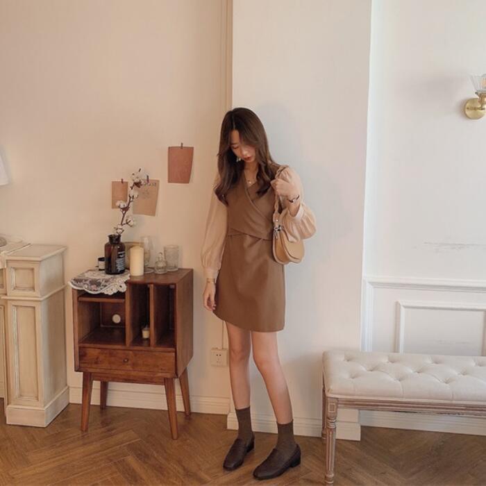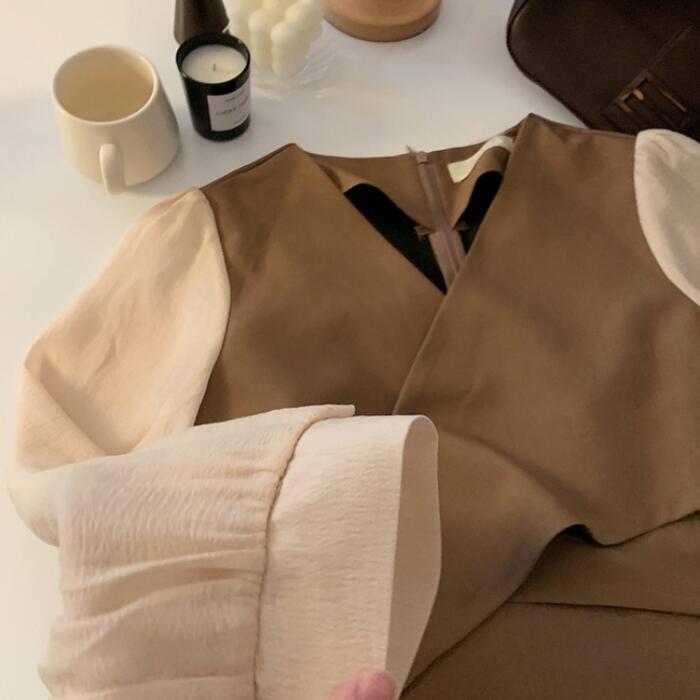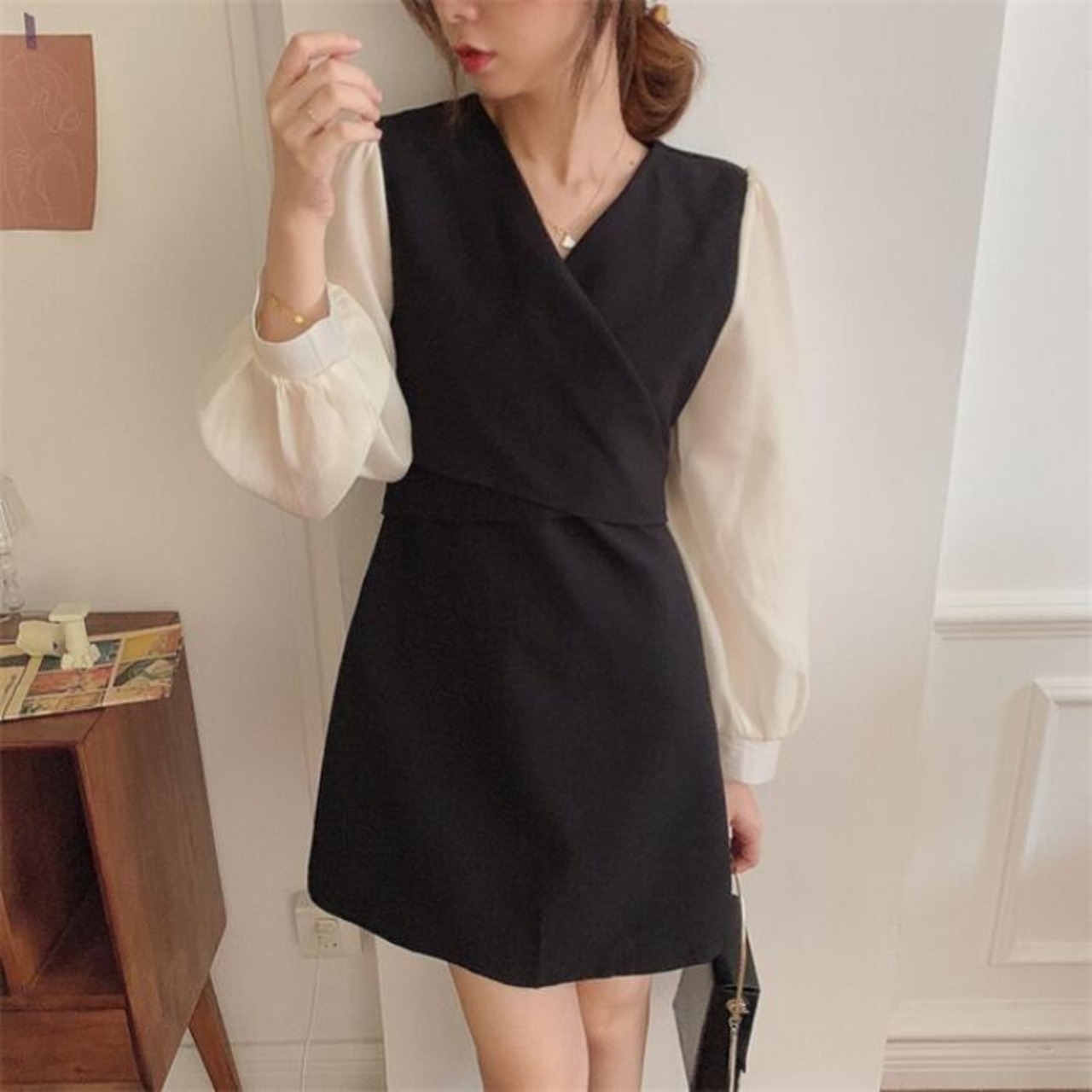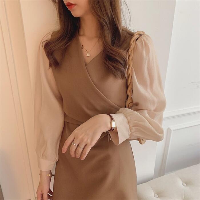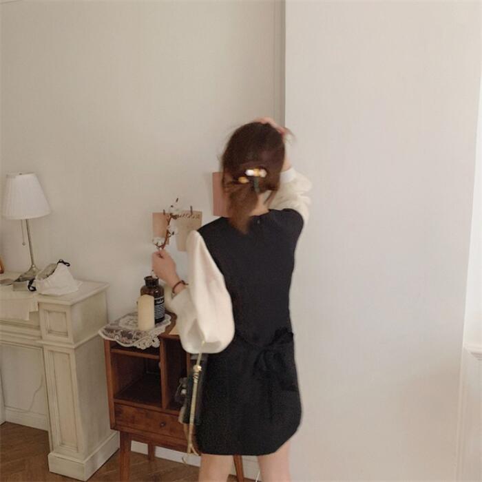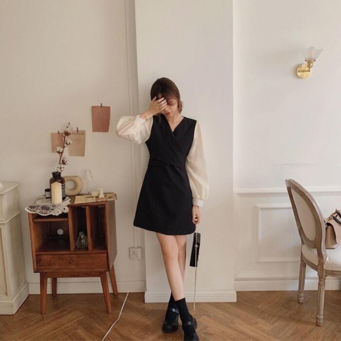 全2色 ワンピース 袖あり 切替 レディース きれいめ カジュアル おしゃれ 長袖 大人 可愛い フェミニン 透け感 ショート丈 レイヤード風 バイカラー 韓国 バックリボン Vネック 大きいサイズ ベージュ ブラック 黒 春 秋 夏 20代 30代 40代 50代