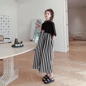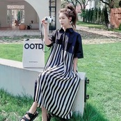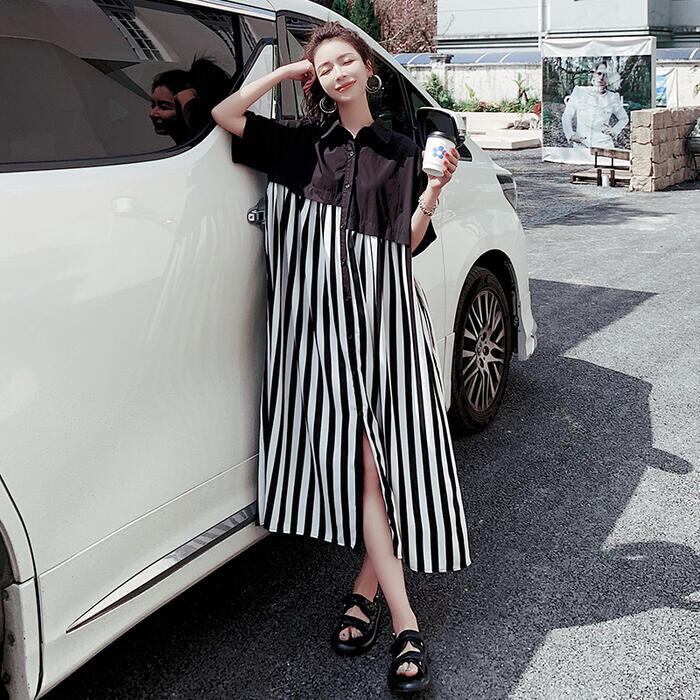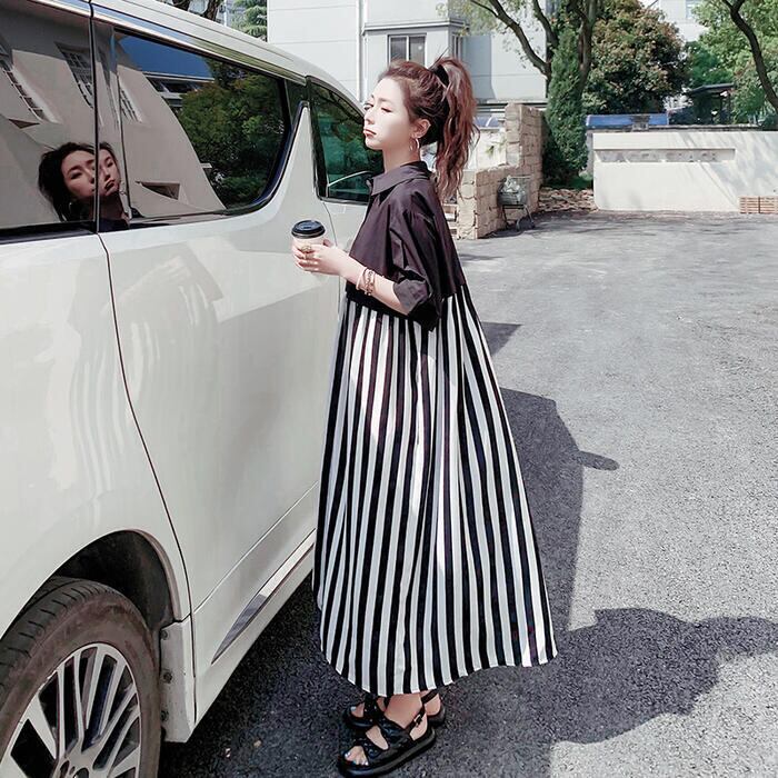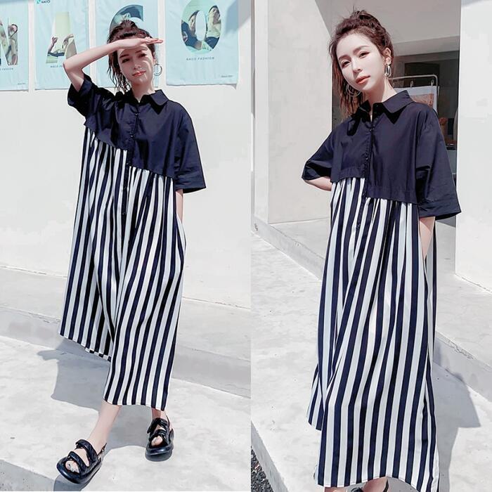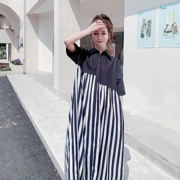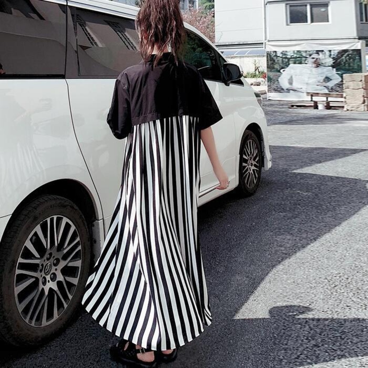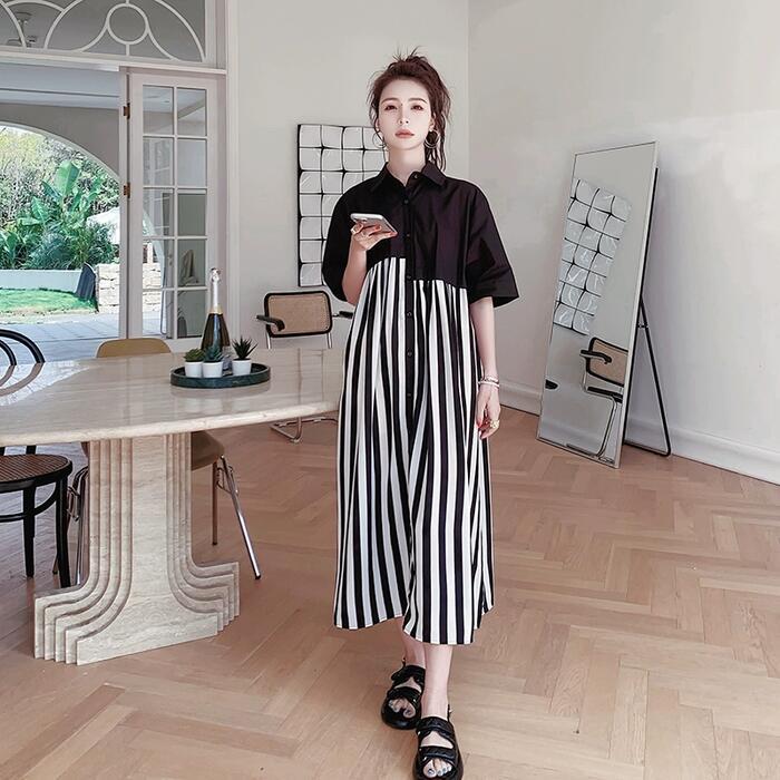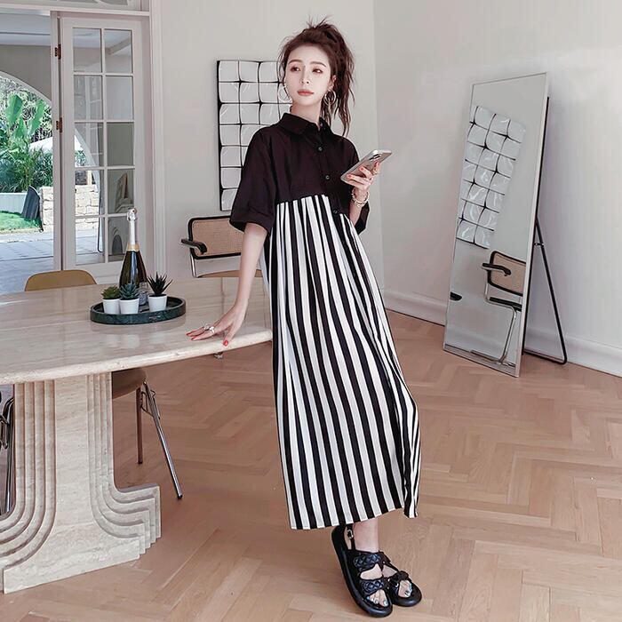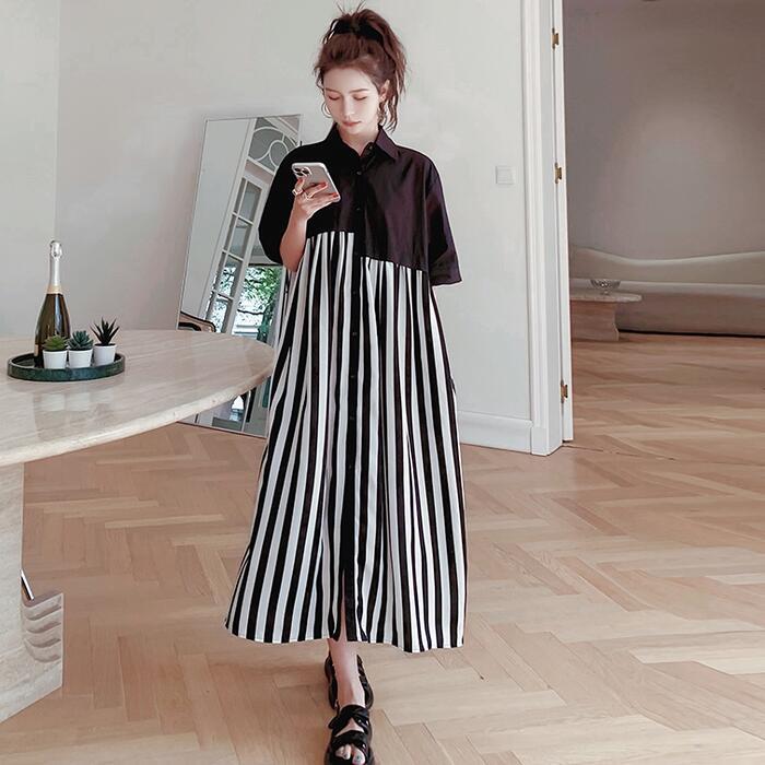 ワンピース シャツワンピ 袖あり 切替 レディース きれいめ カジュアル おしゃれ 半袖 大人 可愛い フェミニン アシンメトリー ロング丈 ストライプ ゆったり 体型カバー リラックス 韓国 大きいサイズ ブラック 黒 春 秋 夏 20代 30代 40代 50代