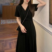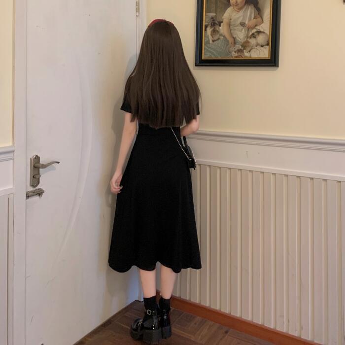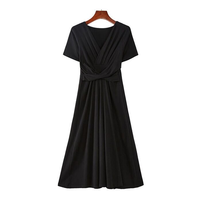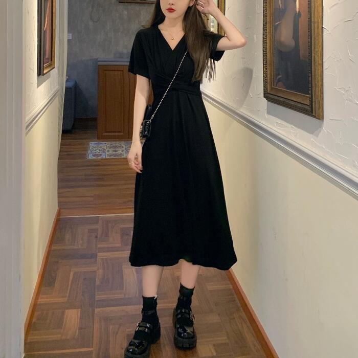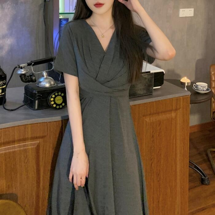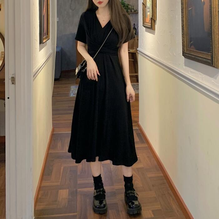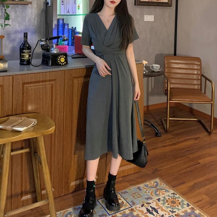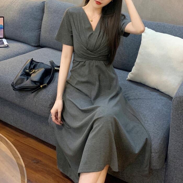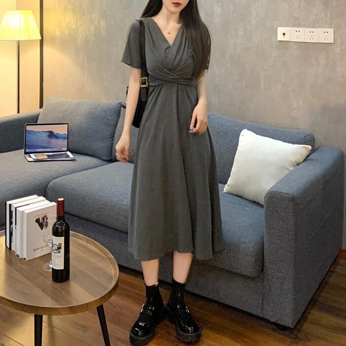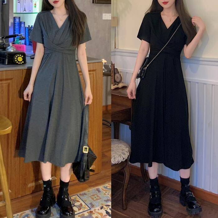 全2色 ワンピース 袖あり レディース きれいめ カジュアル おしゃれ 半袖 大人 可愛い フェミニン ミモレ丈 ハイウエスト 体型カバー シンプル リラックス 韓国 大きいサイズ グレー ブラック 黒 春 秋 夏 20代 30代 40代 50代