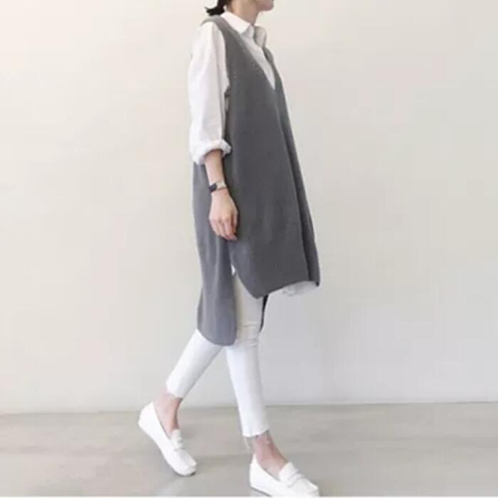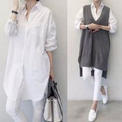ロング丈のシャツとロング丈のニットベスト。
