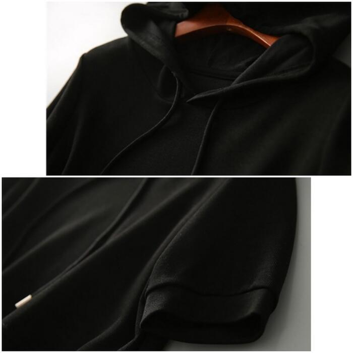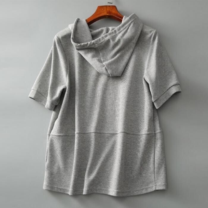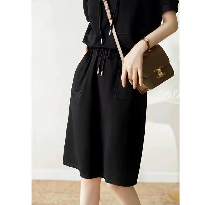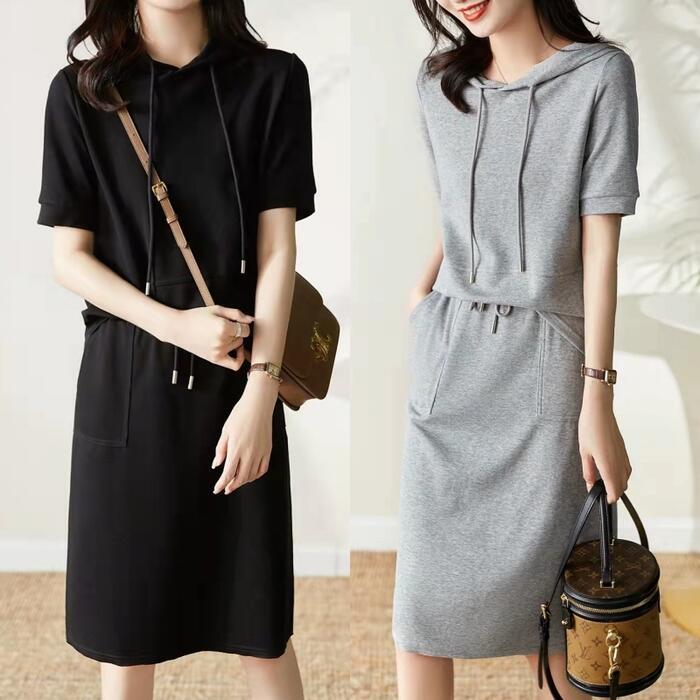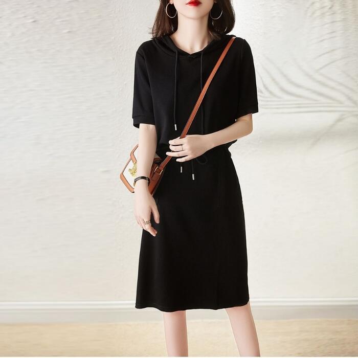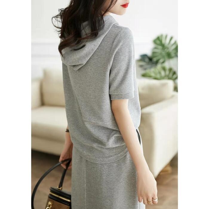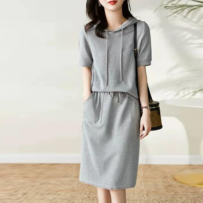 フード付きの半袖プルオーバーとスカートのセットアップ。