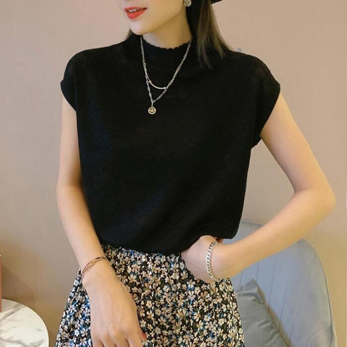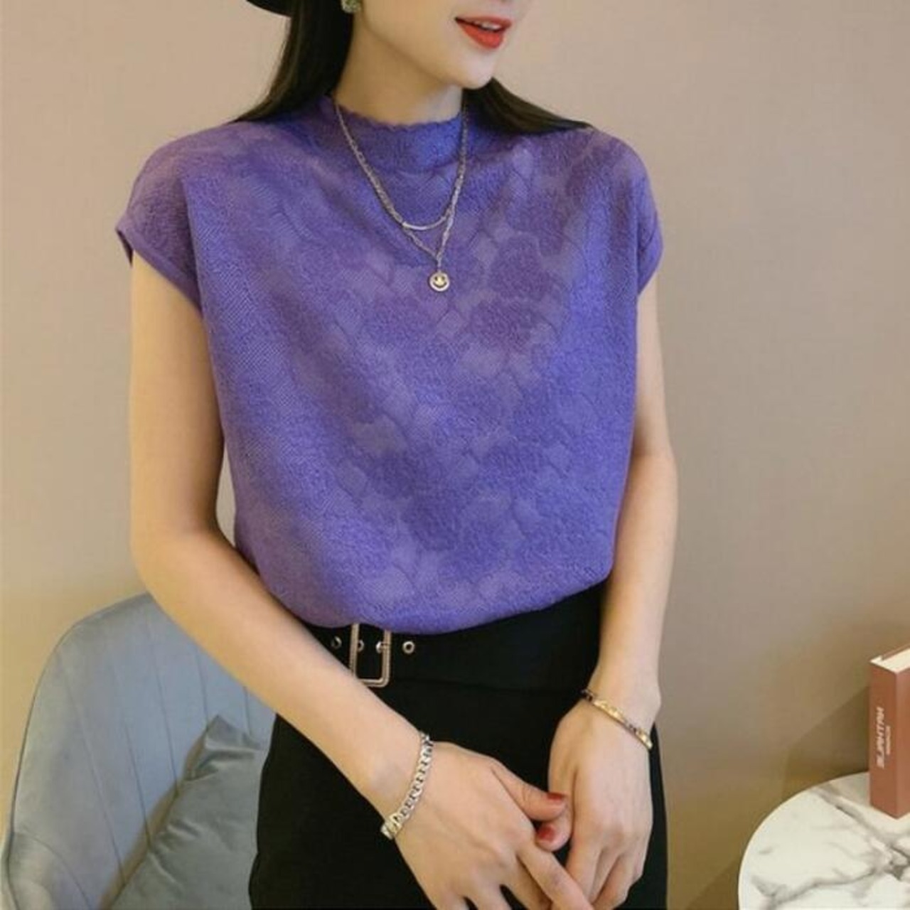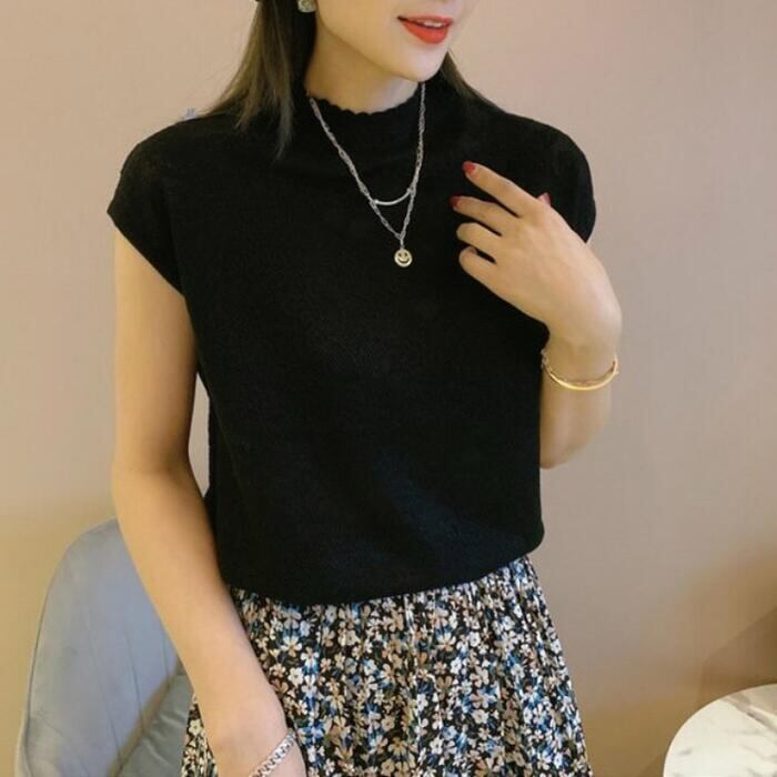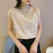 ややハイネックで上品な印象かつ、フレンチスリーブで腕回りもカバー。