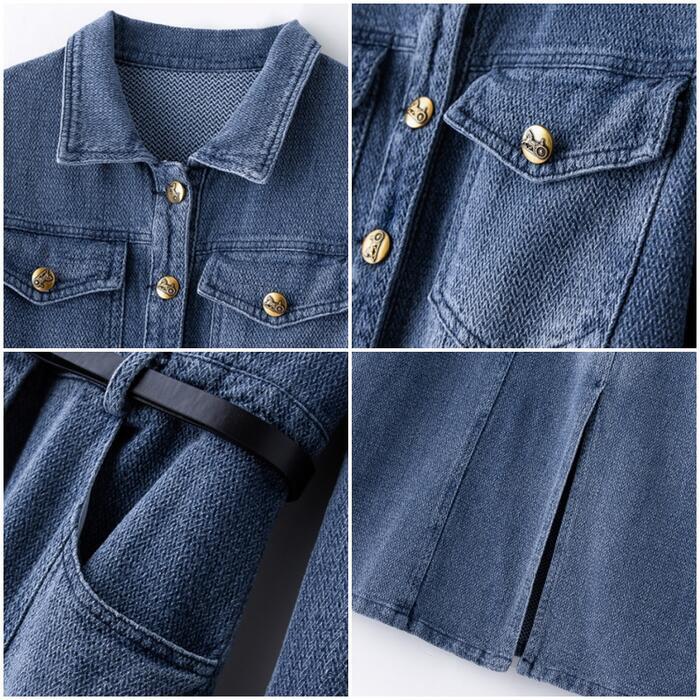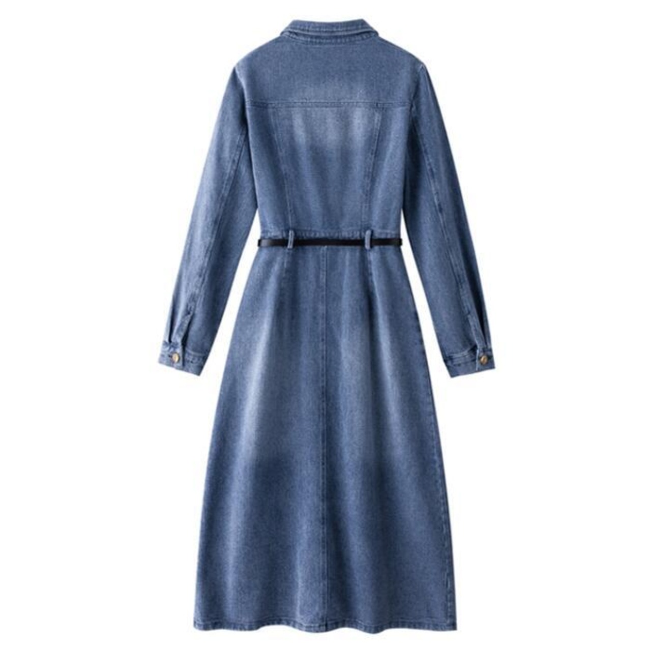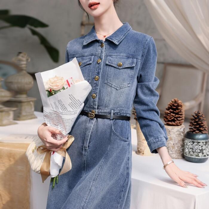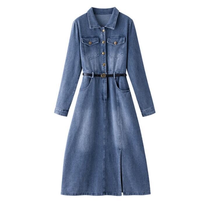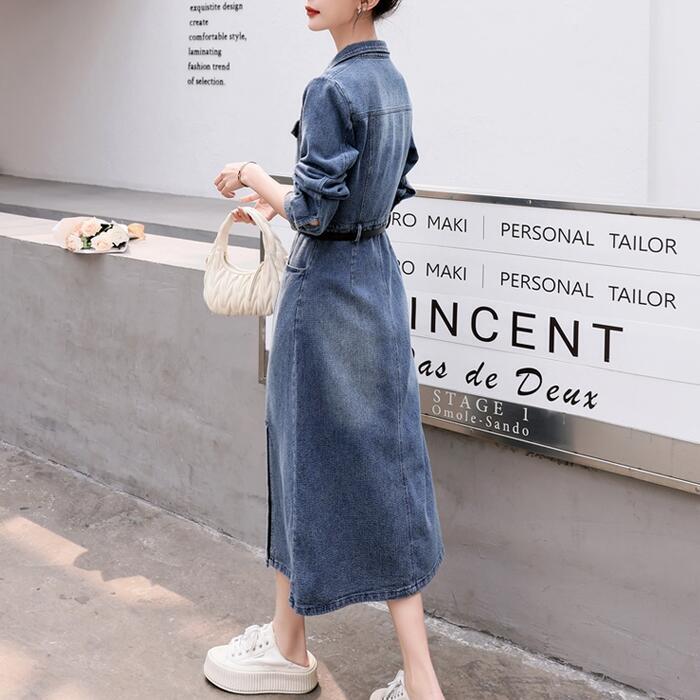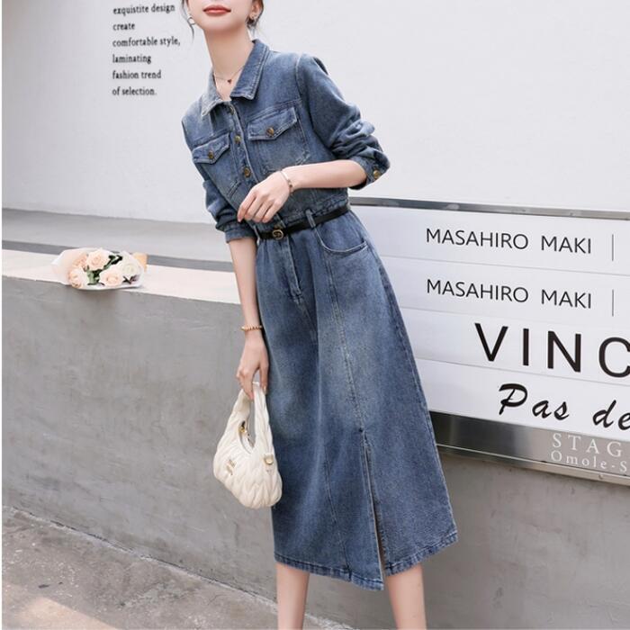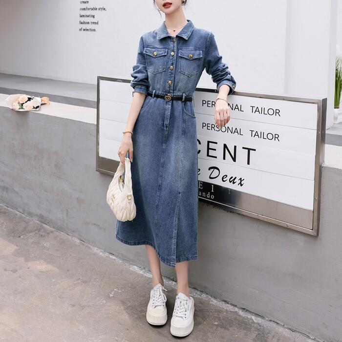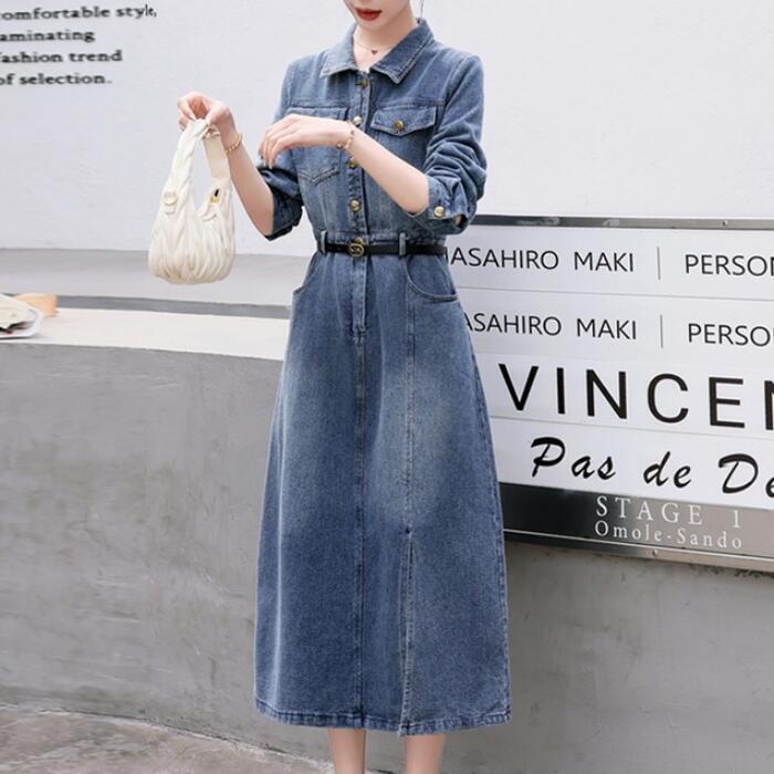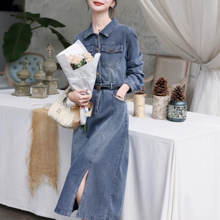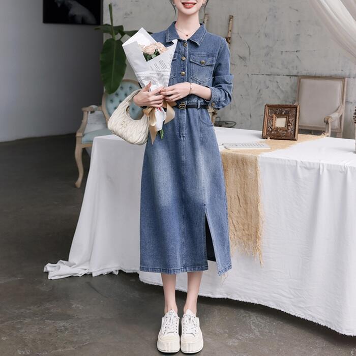 大きいサイズ ワンピース デニム 袖あり レディース きれいめ カジュアル おしゃれ 長袖 大人 可愛い フェミニン ミモレ丈 ハイウエスト ウエストベルト スリム タイト ベーシック シンプル スリット ナチュラル 韓国 春 秋 冬 20代 30代 40代 50代