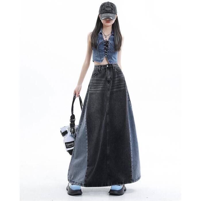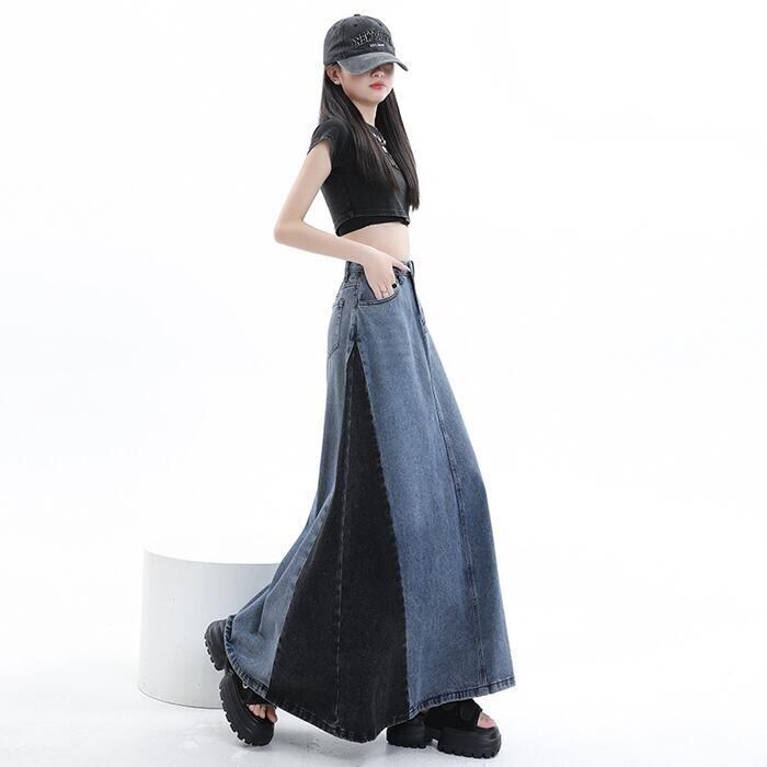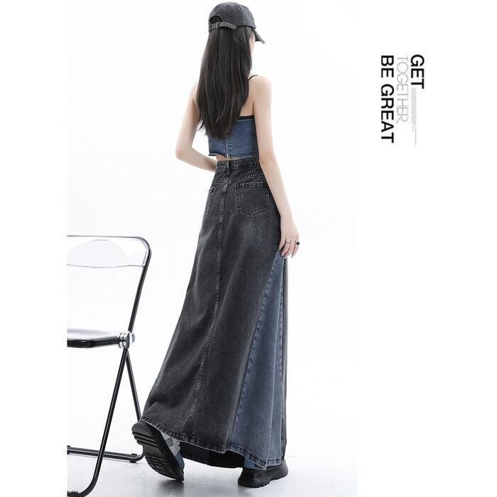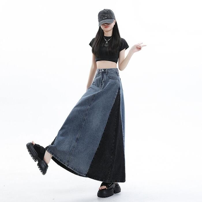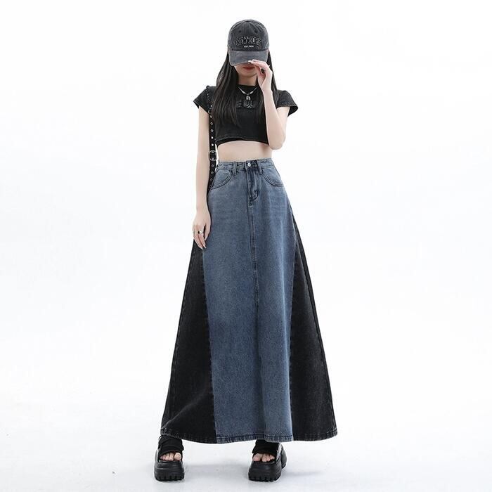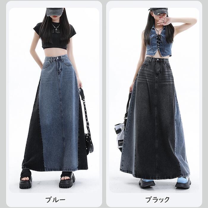 全2色 大きいサイズ スカート ボトムス デニム 切り替え 配色 レディース きれいめ カジュアル おしゃれ ロング丈 大人 可愛い フェミニン バイカラー 体型カバー 韓国 ハイウエスト フレア ブルー 青 ブラック 黒 春 夏 秋 冬 20代 30代 40代 50代