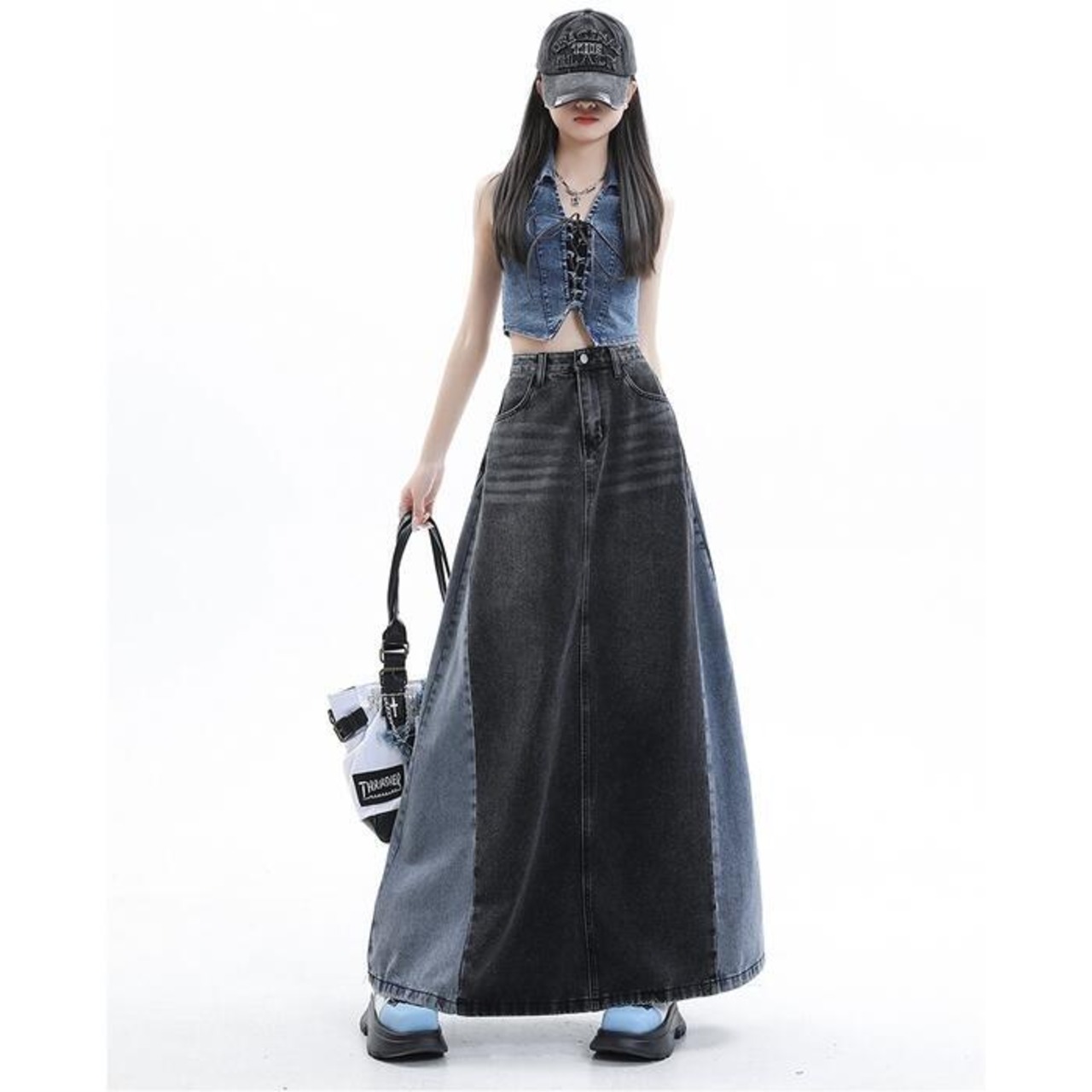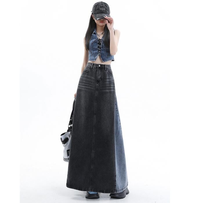 両サイドの切り替えデザインがポイントのデニムロングスカート。
