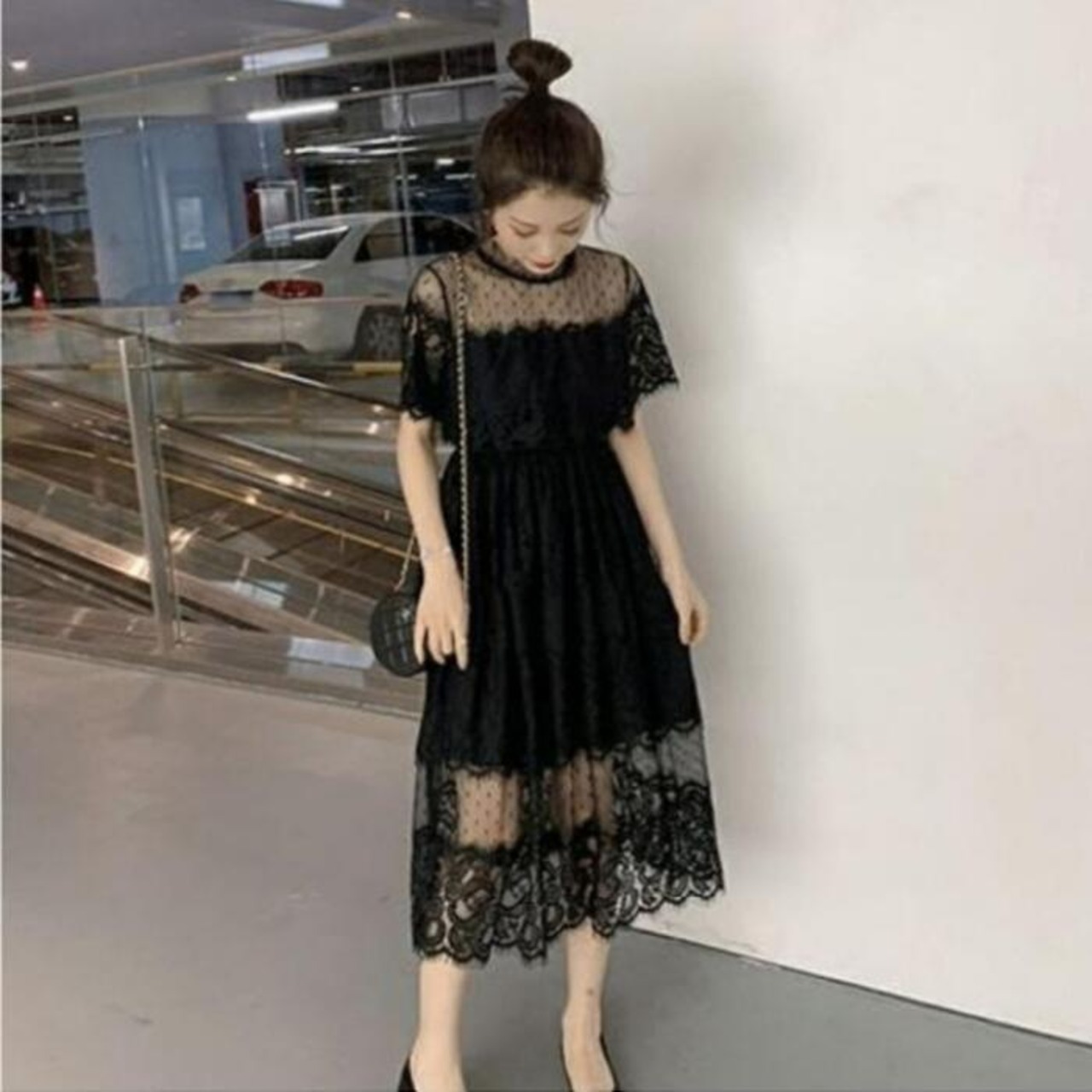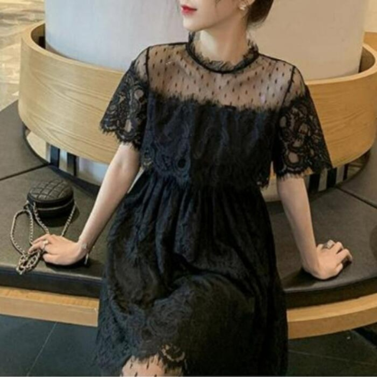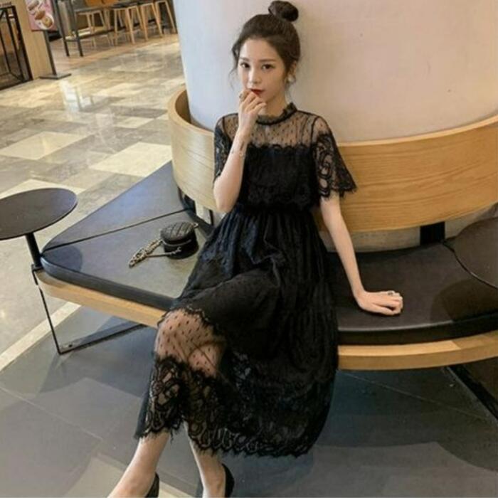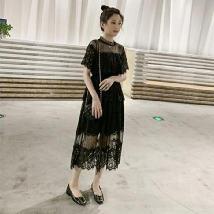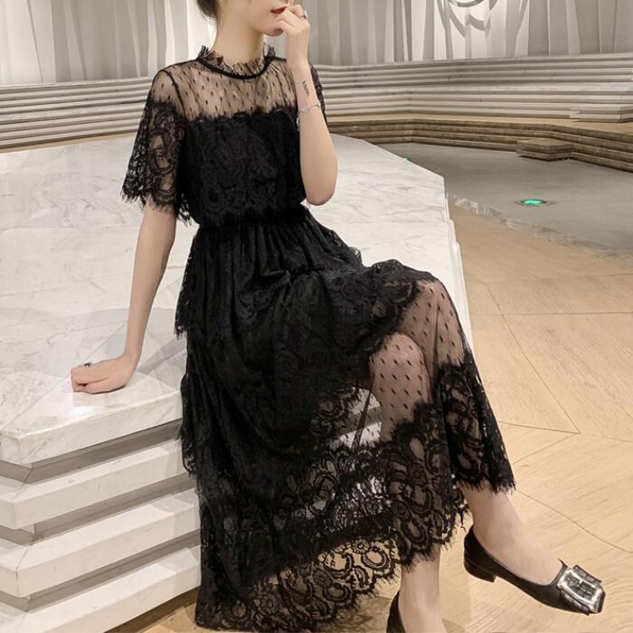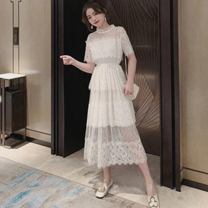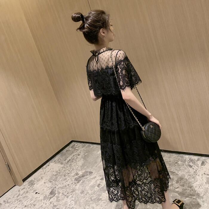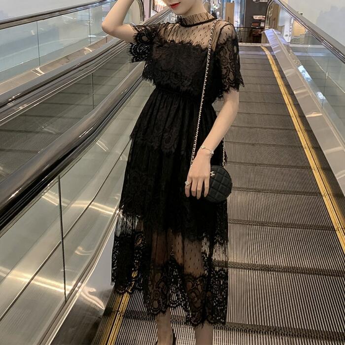 全2色 大きいサイズ 結婚式 ワンピース 袖あり レース ドレス ミモレ丈 パーティー スタンドカラー おしゃれ レディース 大人 可愛い フェミニン 半袖 ワンピ 透け感 エレガント ティアード 二次会 お呼ばれ ホワイト 白 ブラック 黒 春 秋 夏 20代 30代 40代 50代