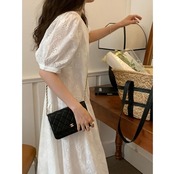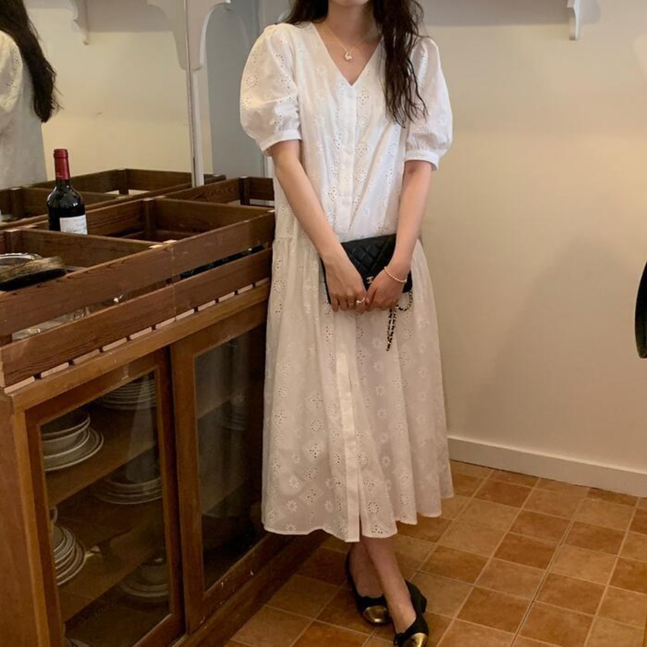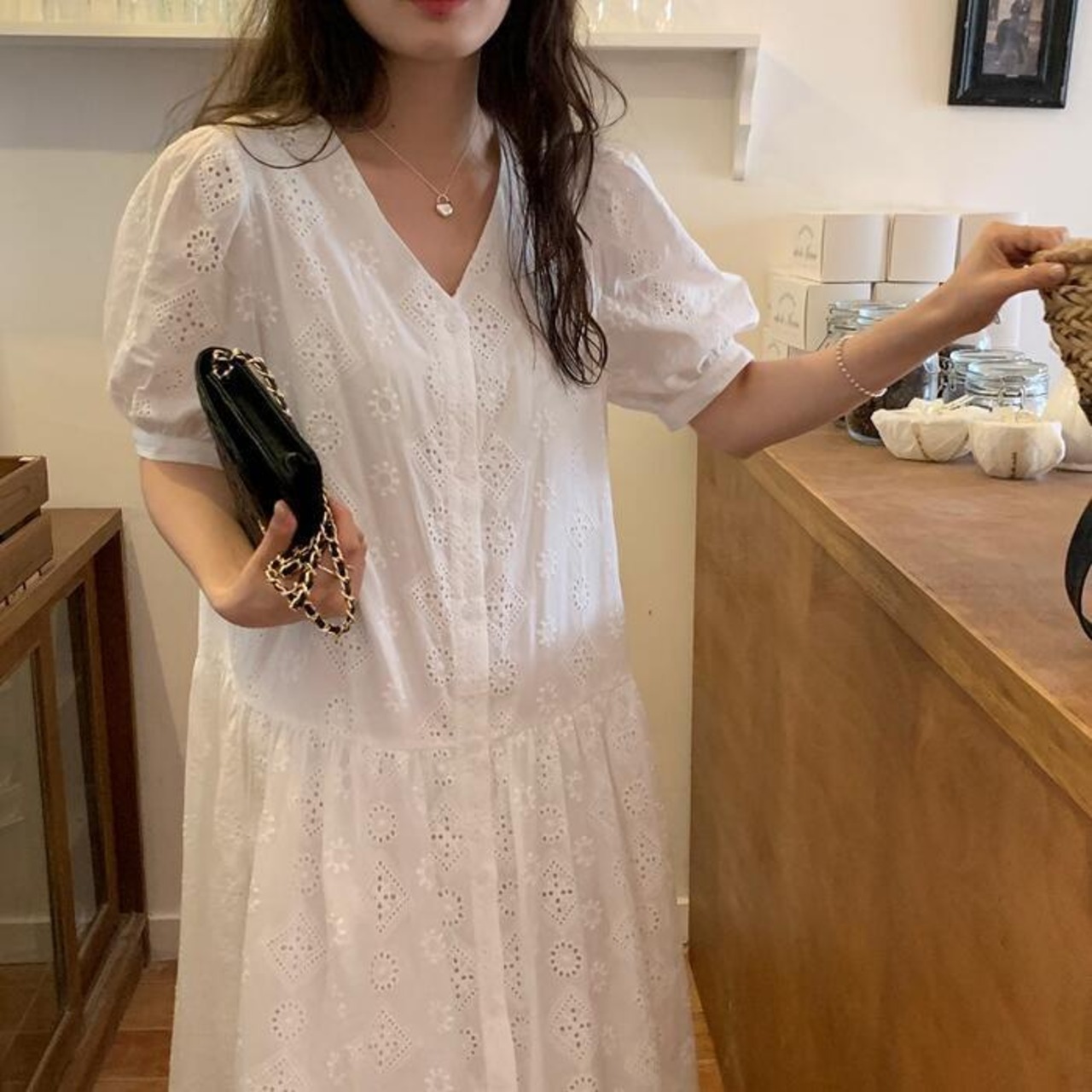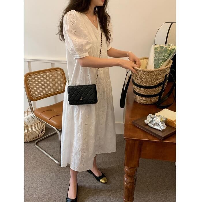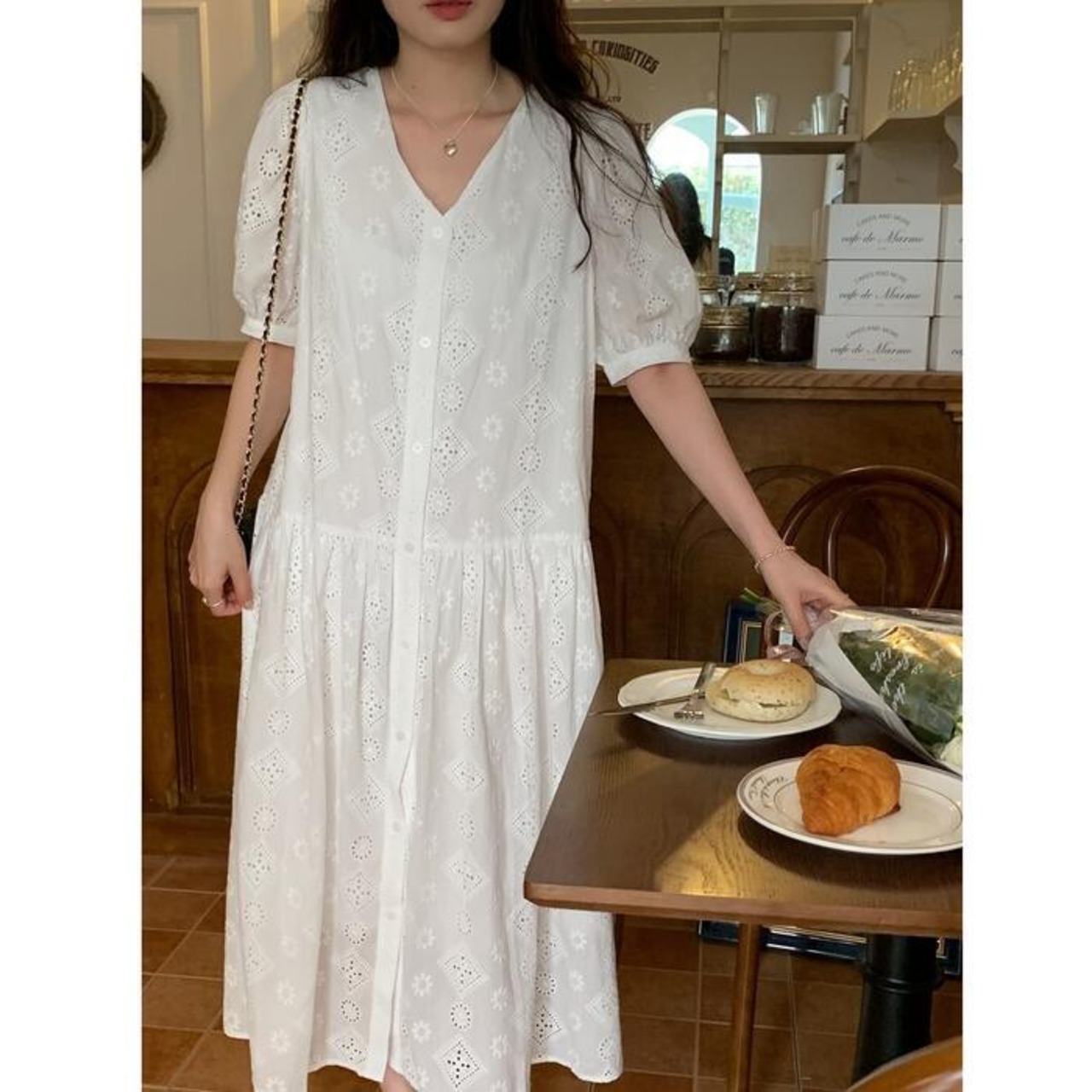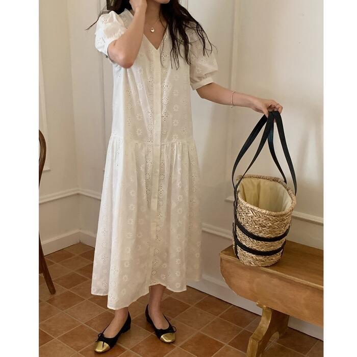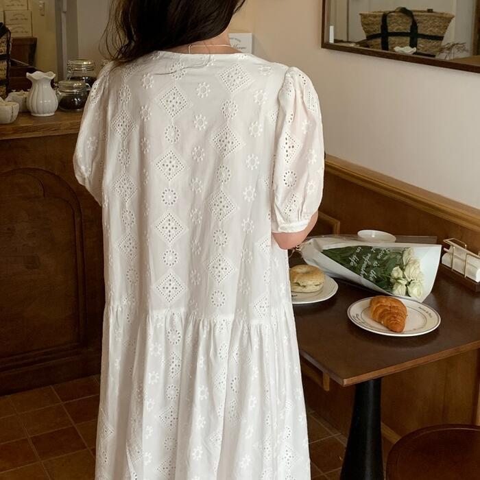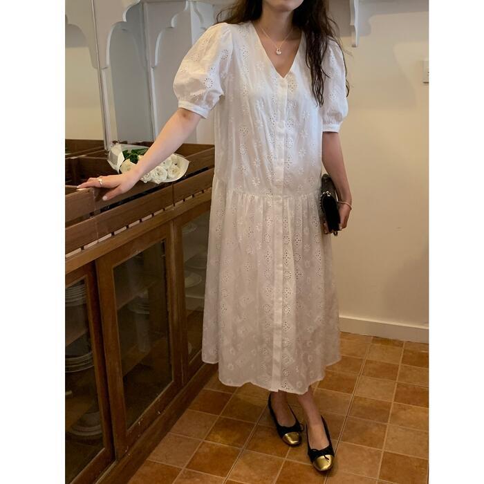 レイヤード パフスリーブ ワンピース ドレス 袖あり カットワーク レース レディース きれいめ カジュアル おしゃれ 半袖 大人 可愛い フェミニン ミモレ丈 ゆったり 体型カバー シャツワンピ 韓国 ホワイト 白 春 秋 夏 20代 30代 40代 50代