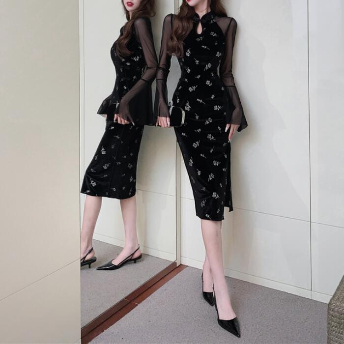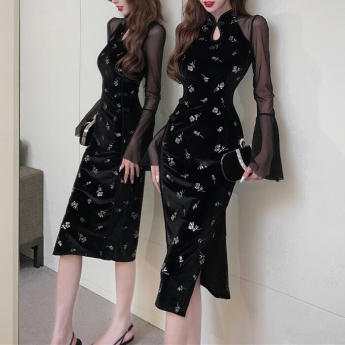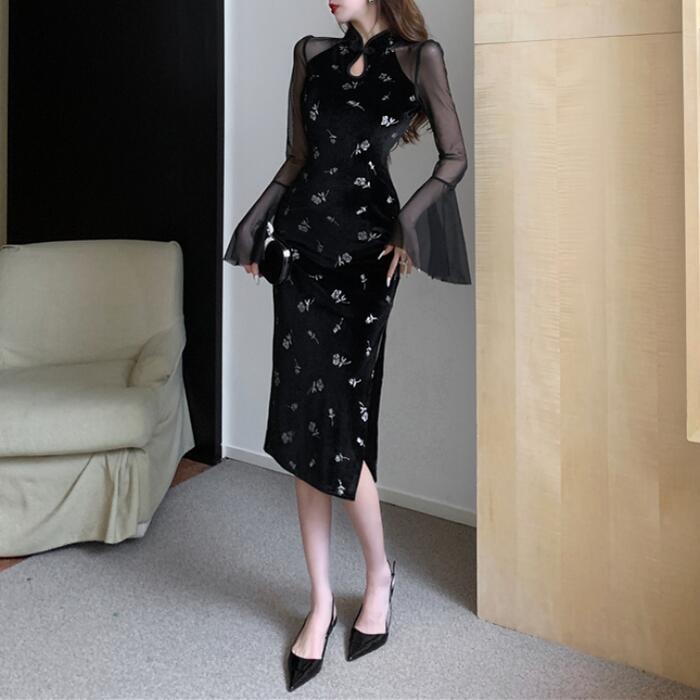 チャイナドレス風デザインが新鮮なベルベットの花柄ワンピース。