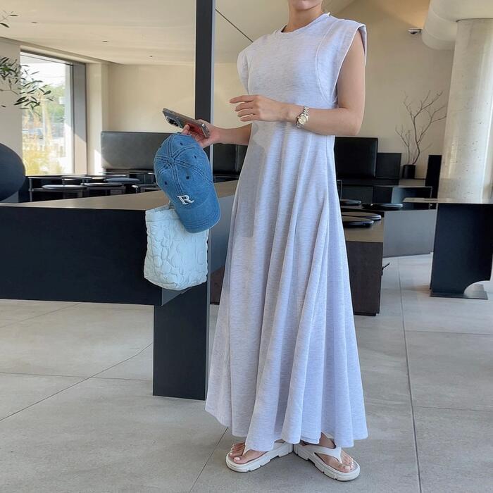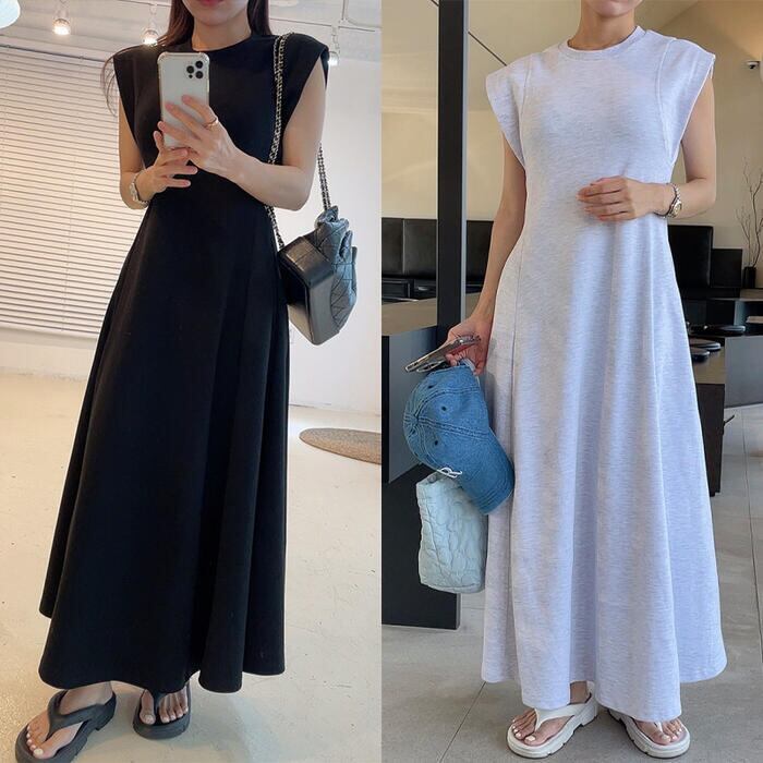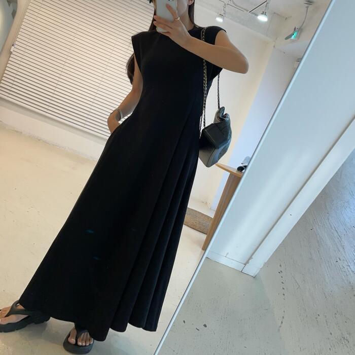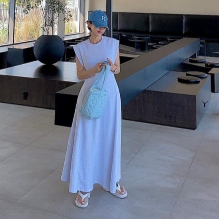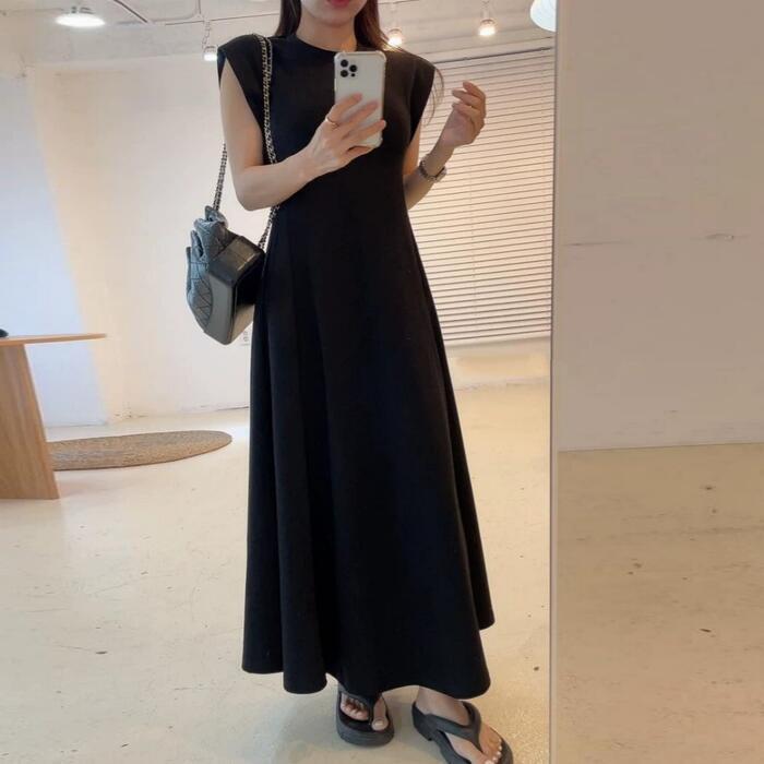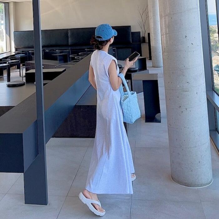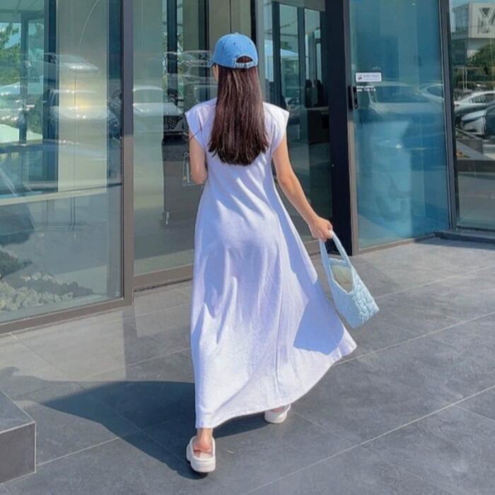 全2色 フレンチスリーブ ワンピース ドレス Tシャツワンピ ロング丈 おしゃれ レディース 大人 可愛い フェミニン ノースリーブ ワンピ シンプル カジュアル ゆったり 体型カバー リラックス グレー ブラック 黒 春 秋 夏 20代 30代 40代 50代