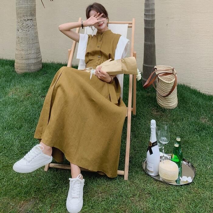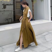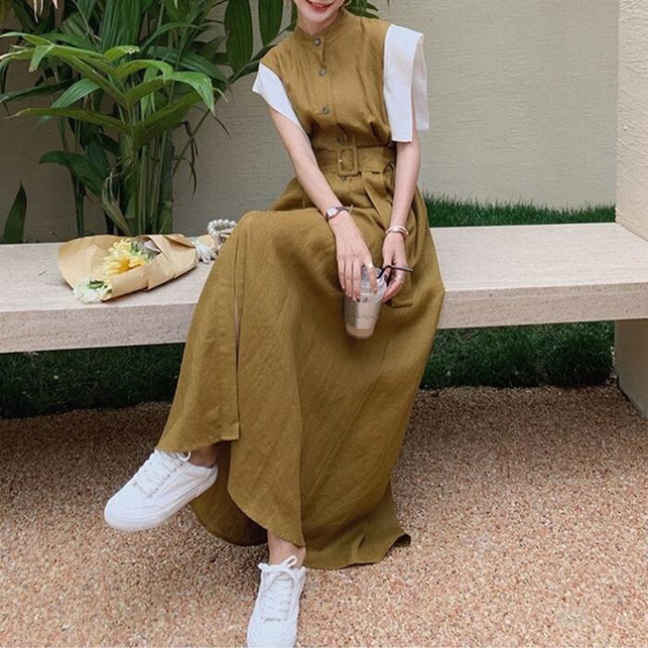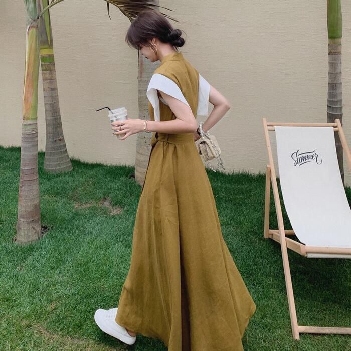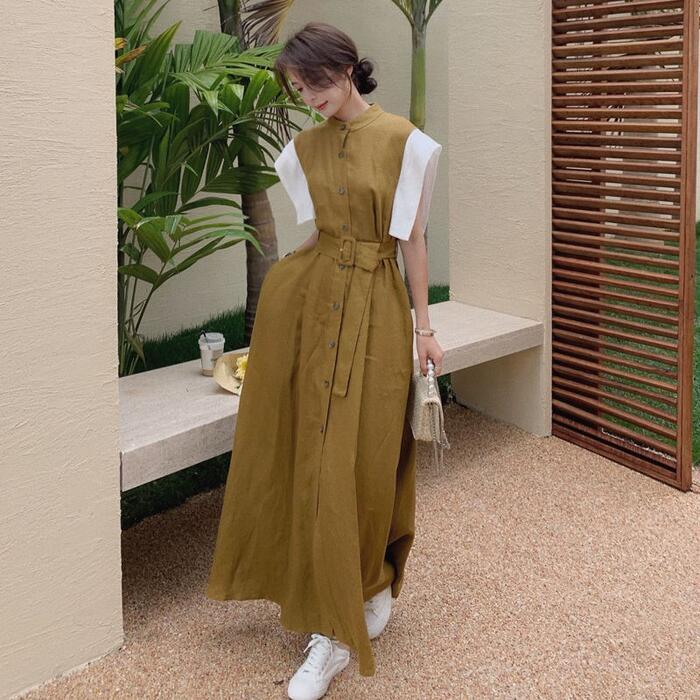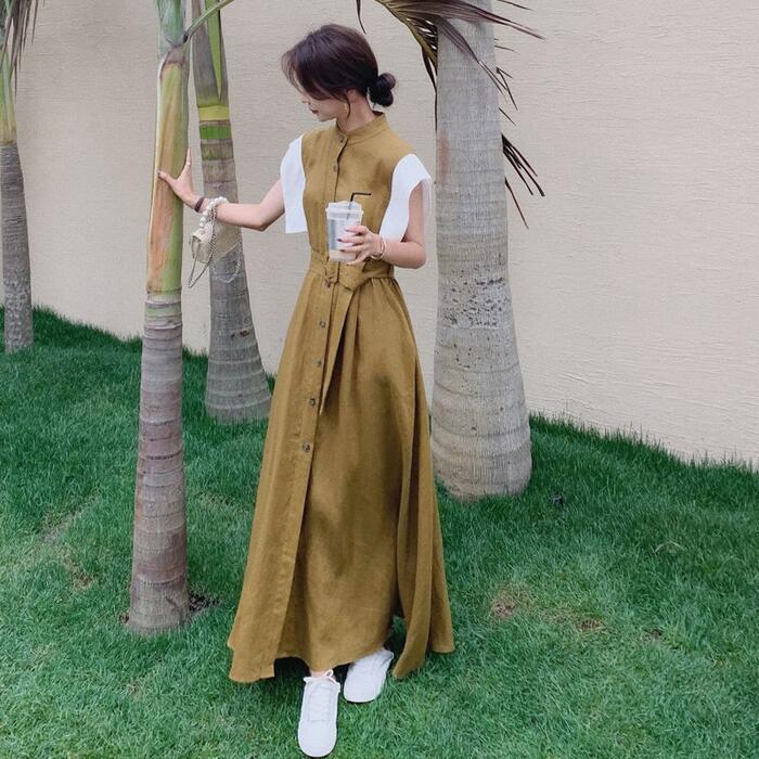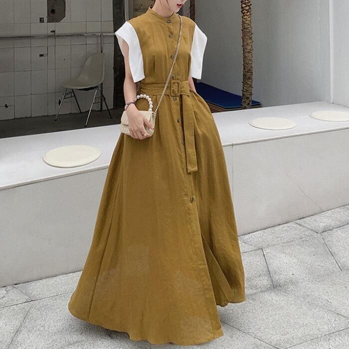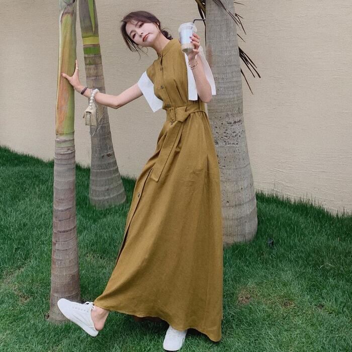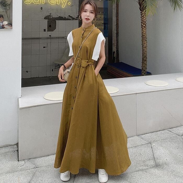 大きいサイズ ワンピース ドレス 袖あり 配色 シャツワンピ レディース きれいめ カジュアル おしゃれ 半袖 大人 可愛い フェミニン マキシ丈 ロングワンピ バンドカラー 体型カバー ハイウエスト 韓国 カーキ 春 秋 夏 20代 30代 40代 50代