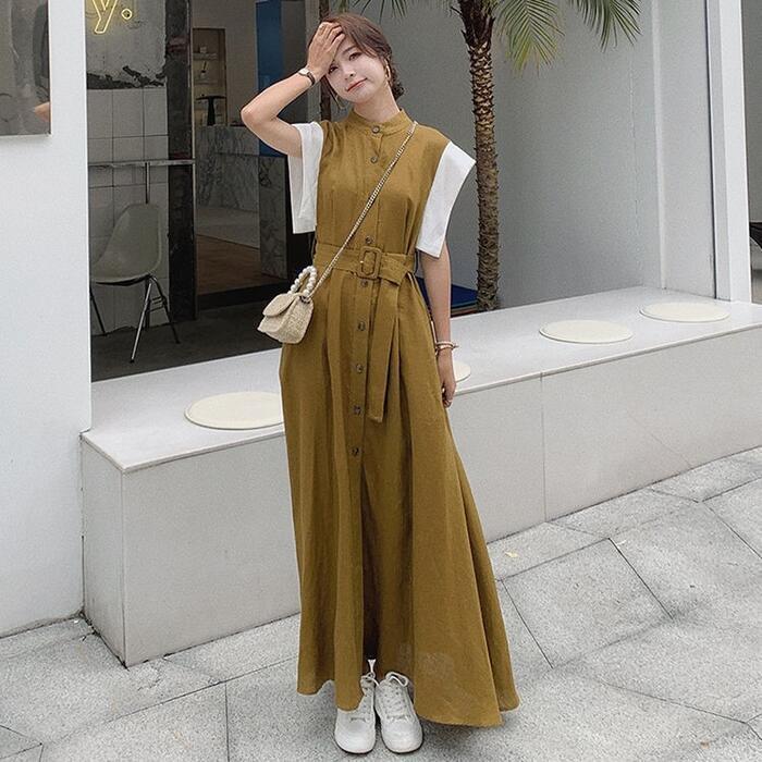 袖の配色デザインが新鮮なロングシャツワンピース。