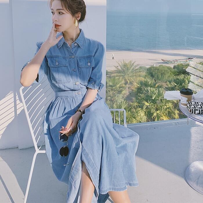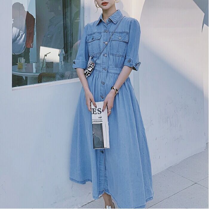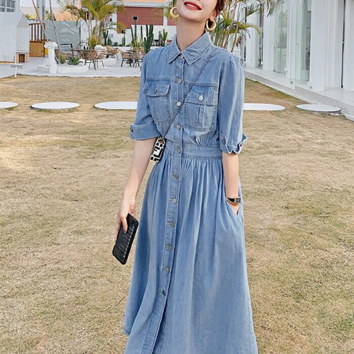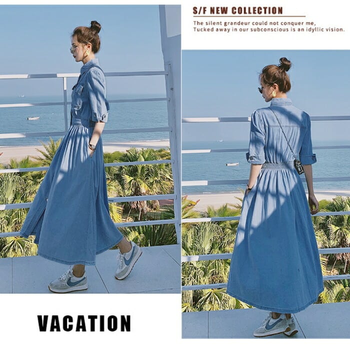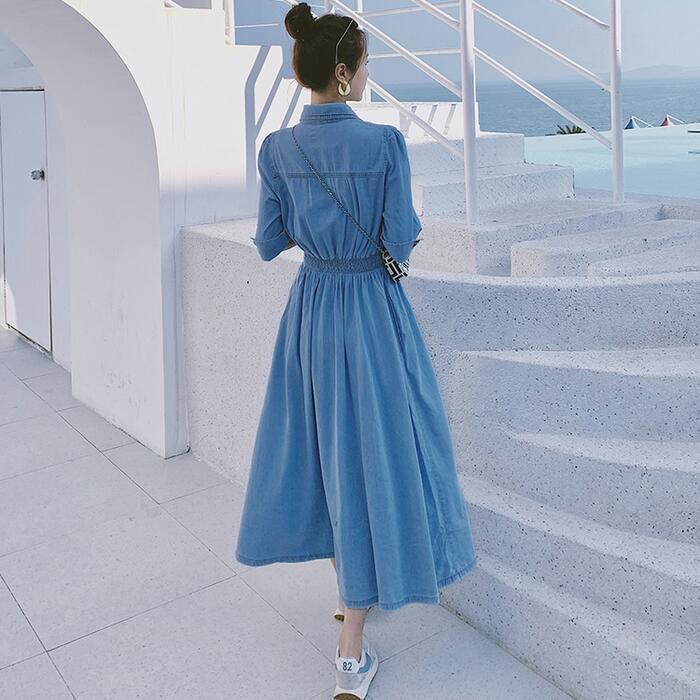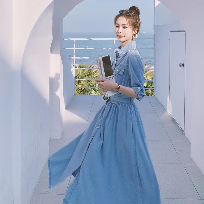 大きいサイズ ワンピース ドレス デニム 袖あり シャツワンピ エレガント レディース きれいめ カジュアル おしゃれ 五分袖 大人 可愛い フェミニン ミモレ丈 シャツワンピ 体型カバー ウエストゴム シンプル ベーシック 韓国 ブルー 青 春 秋 夏 20代 30代 40代 50代