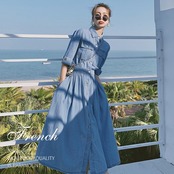 ウエストゴムでシルエットをきれいに見せてくれるデニムシャツワンピース。