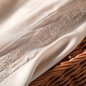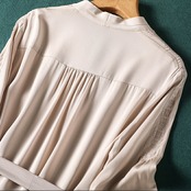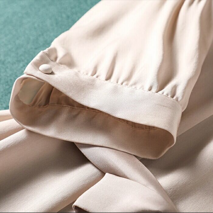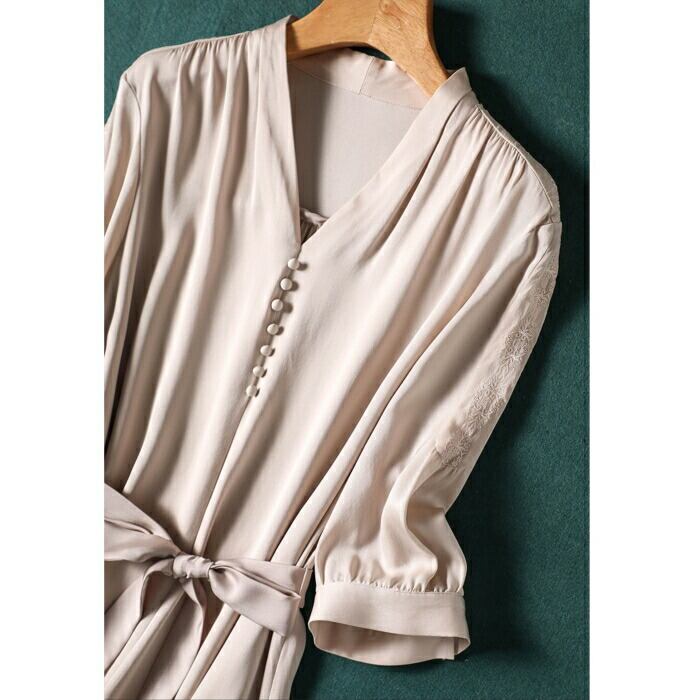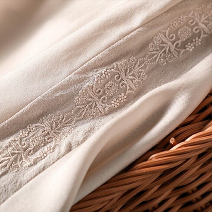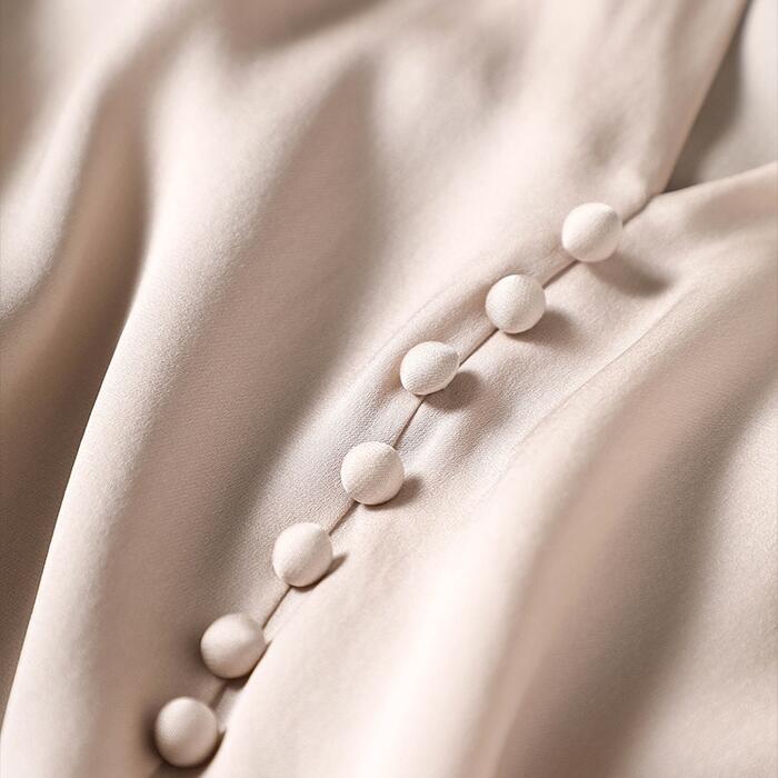 袖に入ったさりげない刺繍やくるみボタンなどディテールにこだわった一枚。