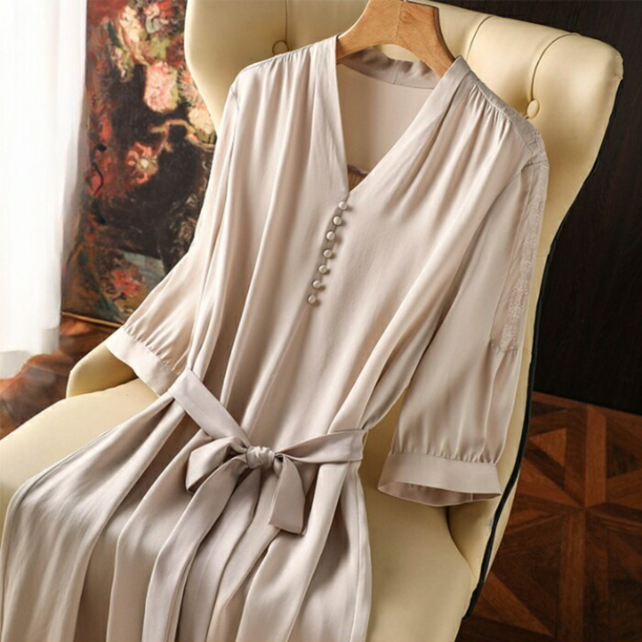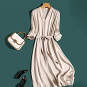 とろみ感が女性らしいVネックワンピース。