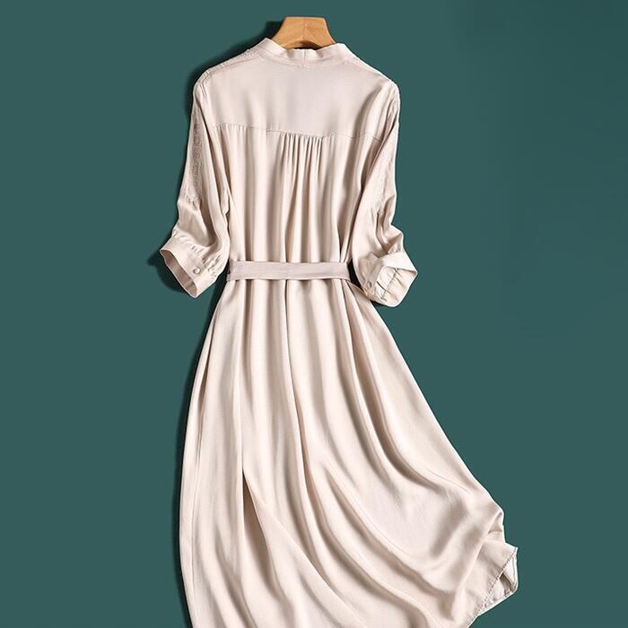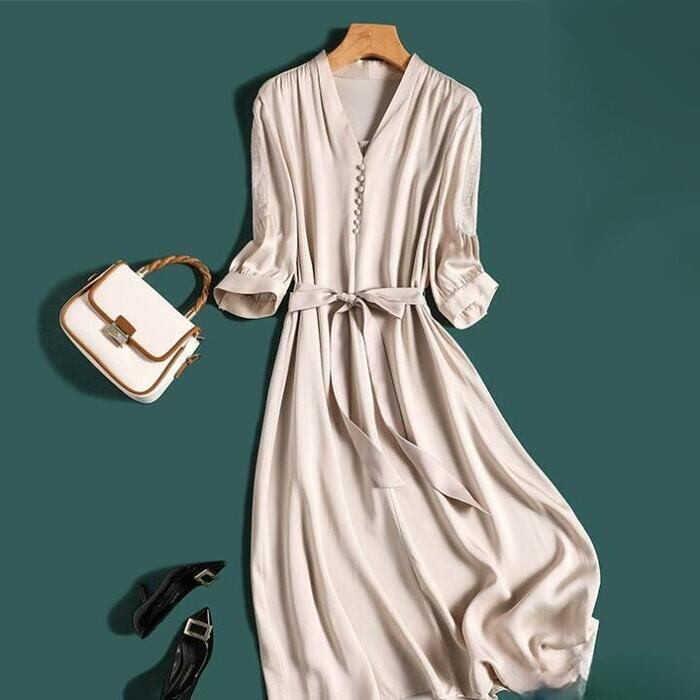 大きいサイズ ワンピース ドレス 袖あり エレガント レディース きれいめ カジュアル 刺繍 おしゃれ 七分袖 大人 可愛い フェミニン ミモレ丈 ウエストリボン Vネック 体型カバー ハイウエスト シンプル お呼ばれ ベージュ 春 秋 夏 20代 30代 40代 50代