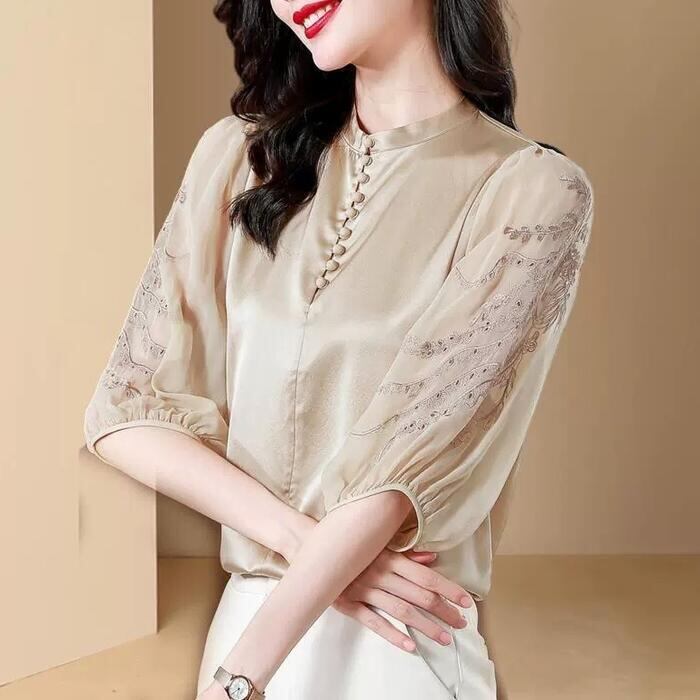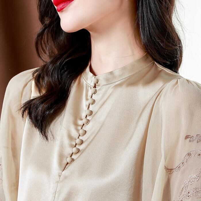 大きいサイズ トップス ブラウス シャツ カットソー エレガント シアー 刺繍 レース レディース きれいめ カジュアル おしゃれ 七分袖 大人 可愛い フェミニン 体型カバー バンドカラー 透け感 ベージュ 春 秋 夏 20代 30代 40代 50代