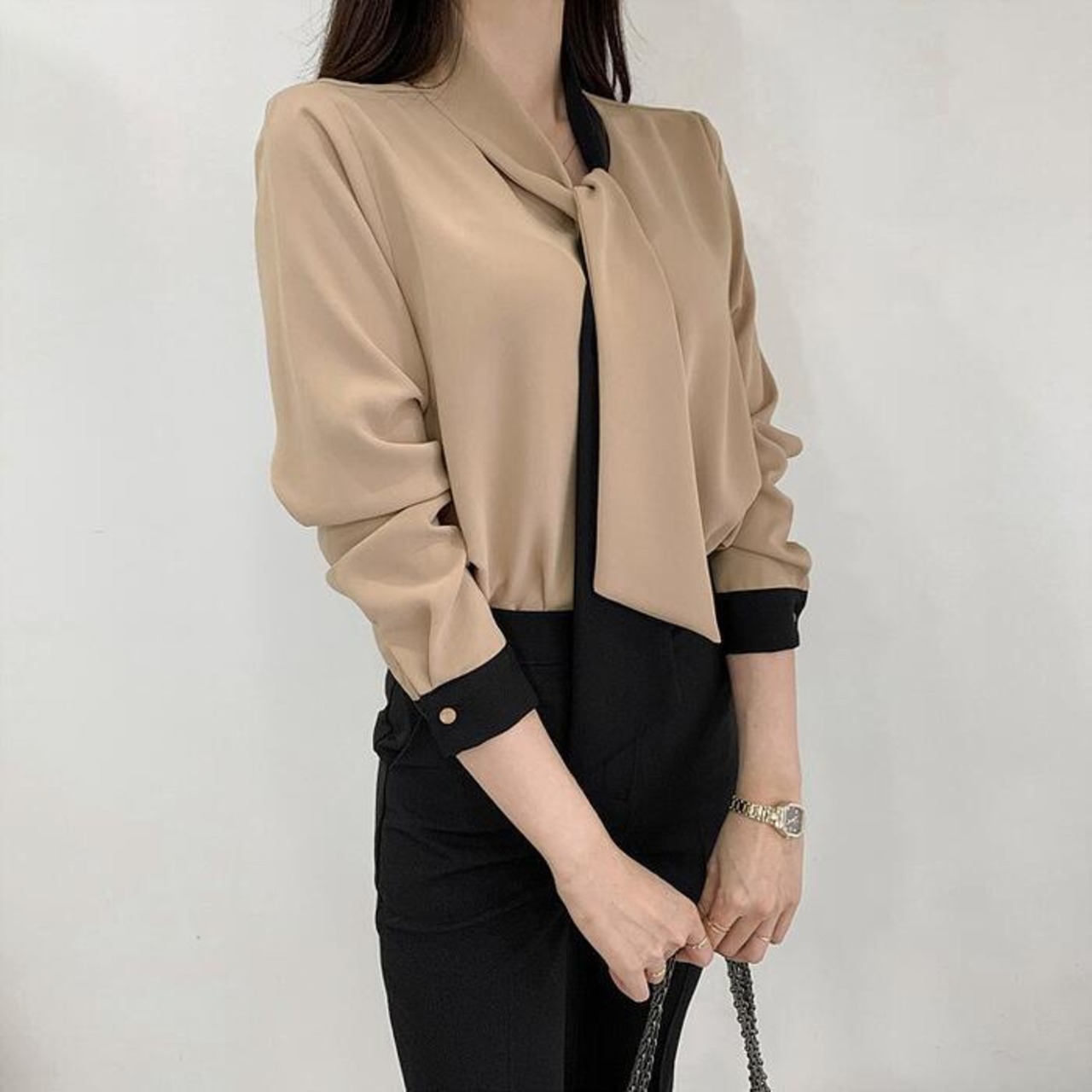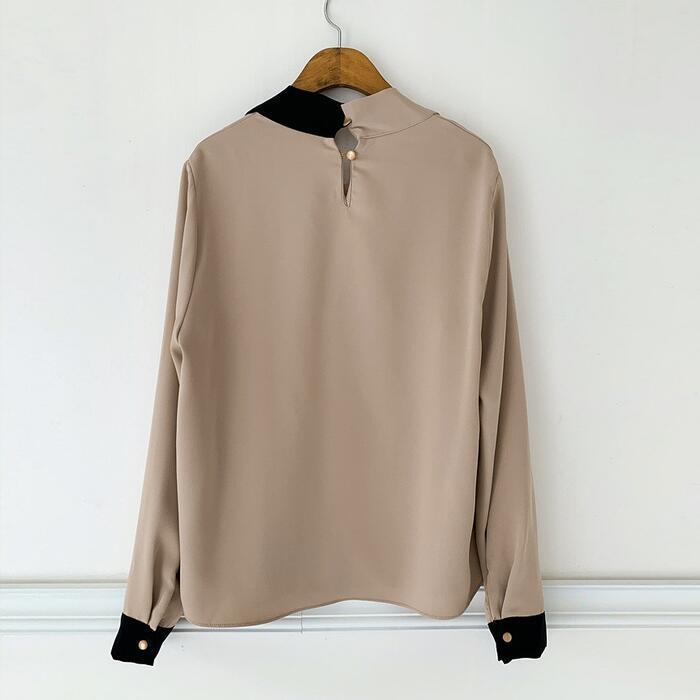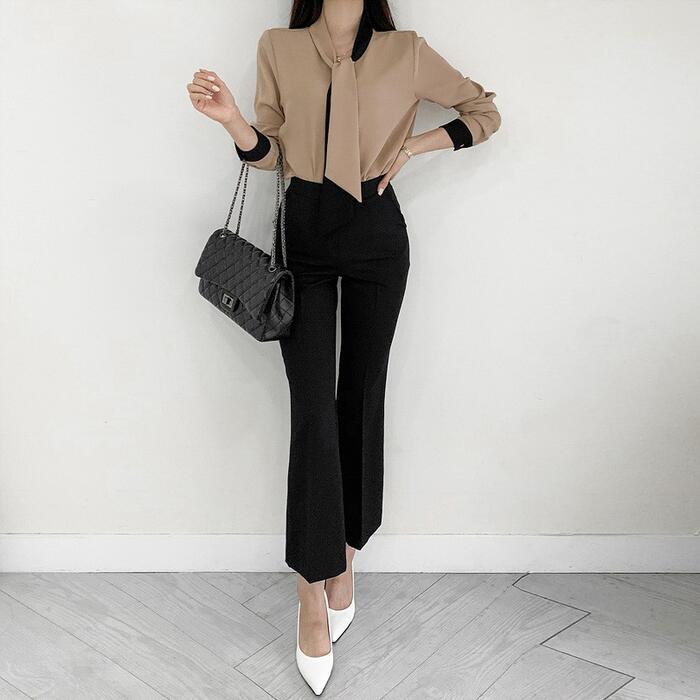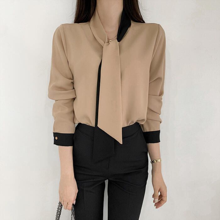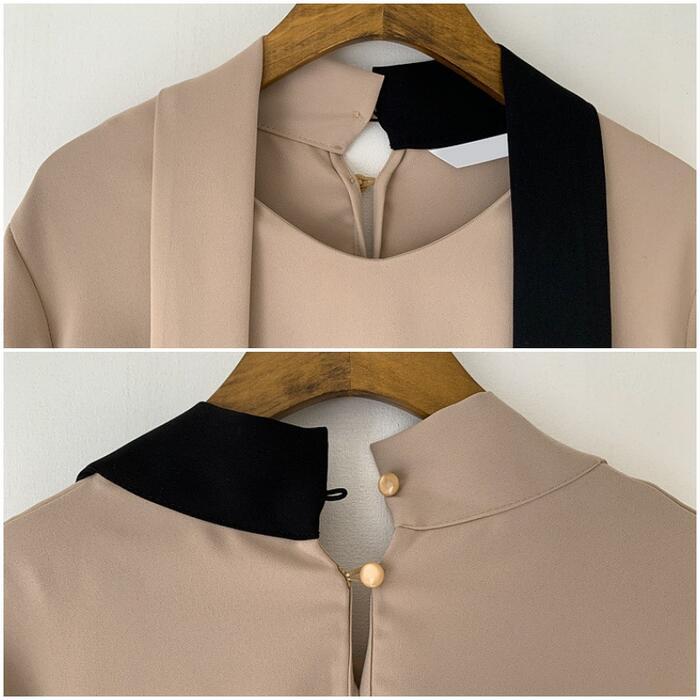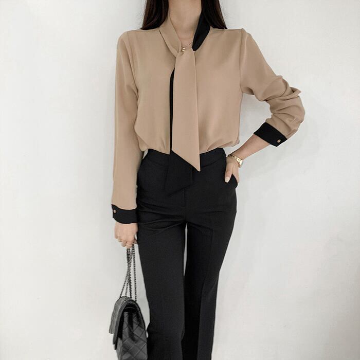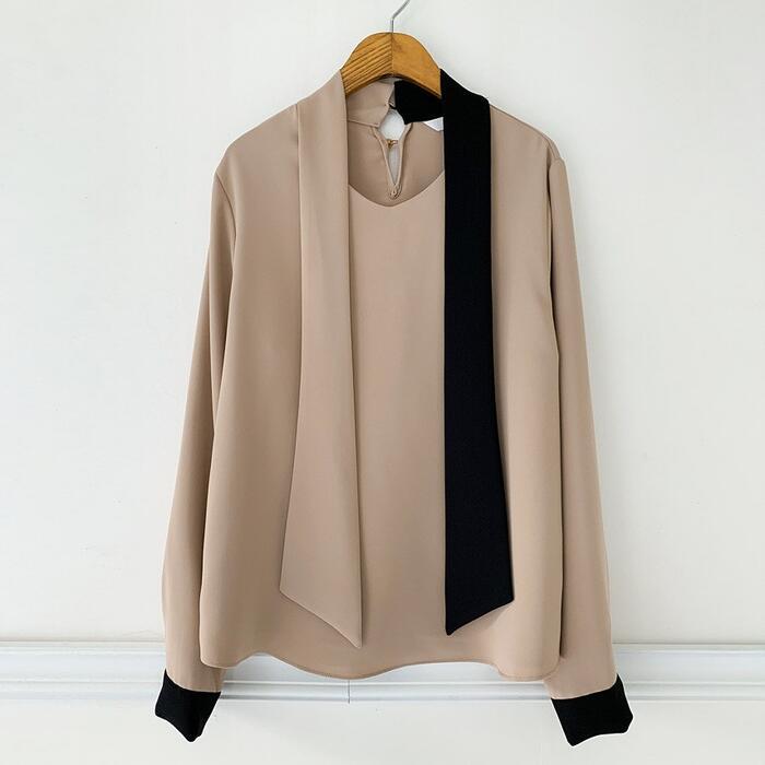 エレガントな印象のバイカラーボウタイブラウス。
