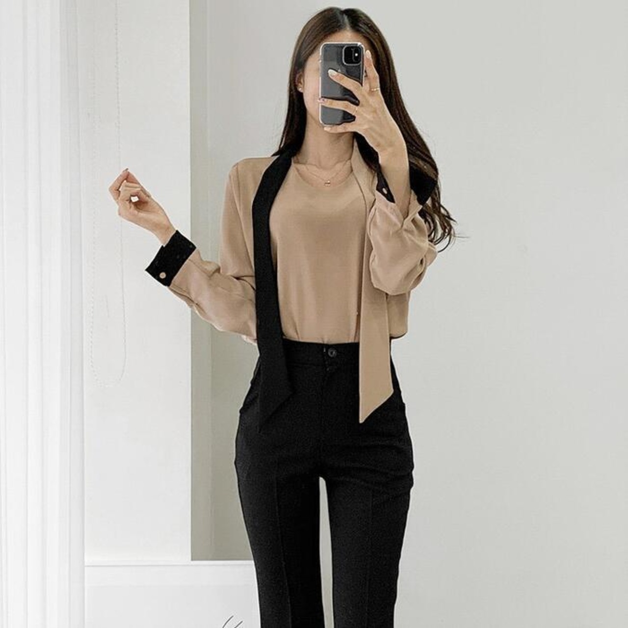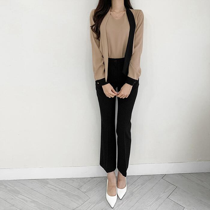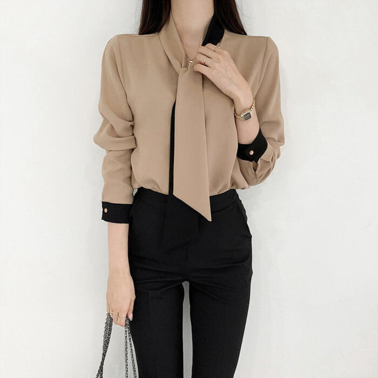 エレガントな印象のバイカラーボウタイブラウス。