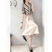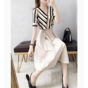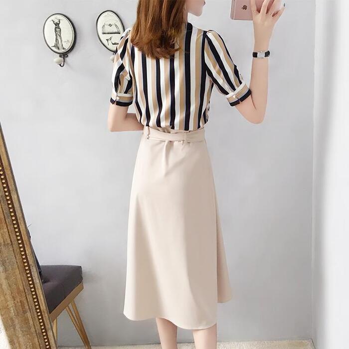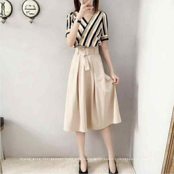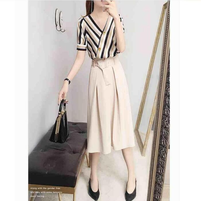 マルチボーダー柄のブラウスとミモレ丈スカートのセットアップ。