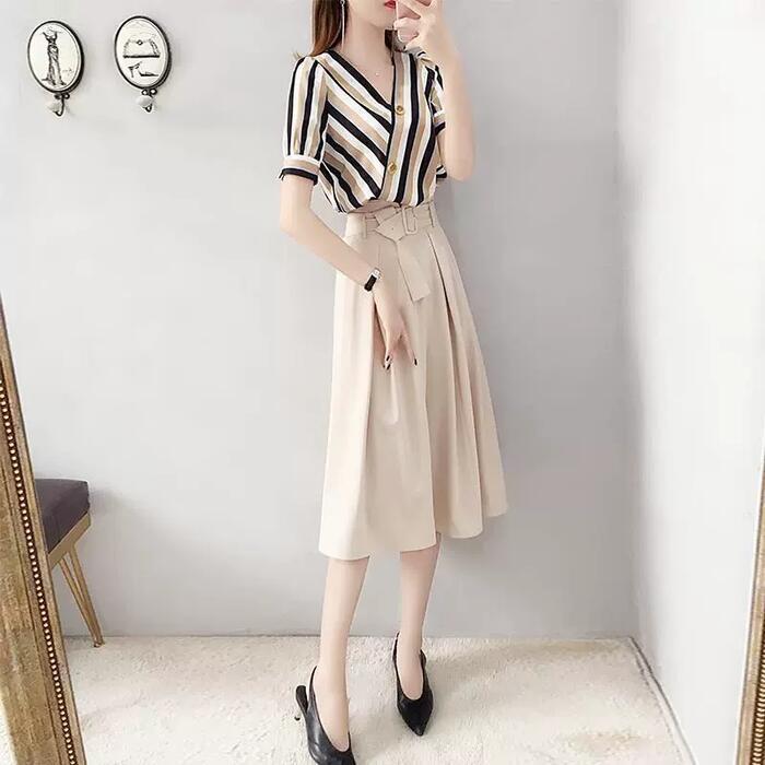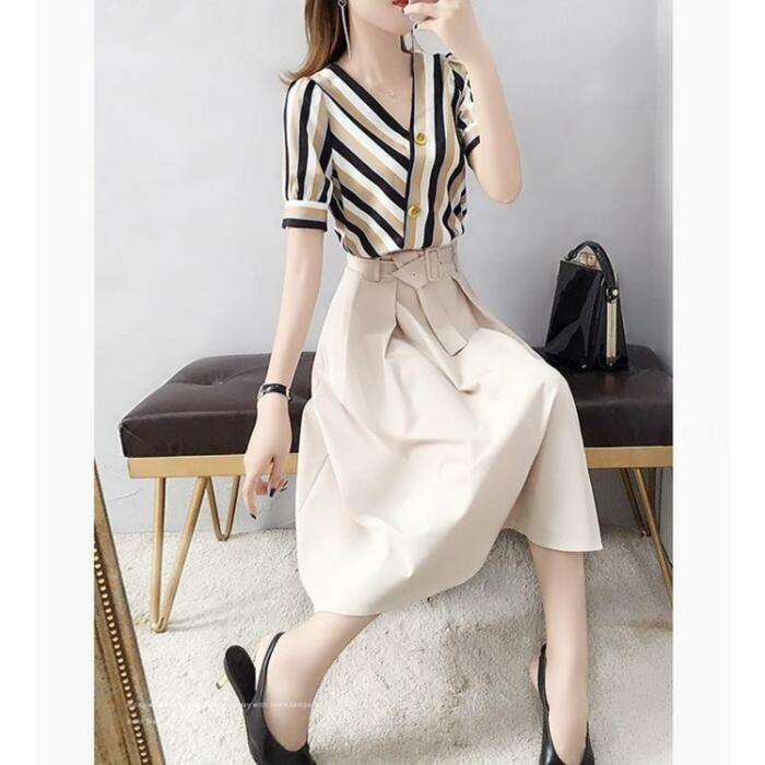 大きいサイズ セットアップ 2点セット トップス スカート ブラウス シャツ エレガント きれいめ カジュアル 半袖 ミモレ丈 おしゃれ 大人 可愛い カシュクール Vネック フェミニン ナチュラル オフィス マルチカラー ベージュ 春 秋 夏 20代 30代 40代 50代